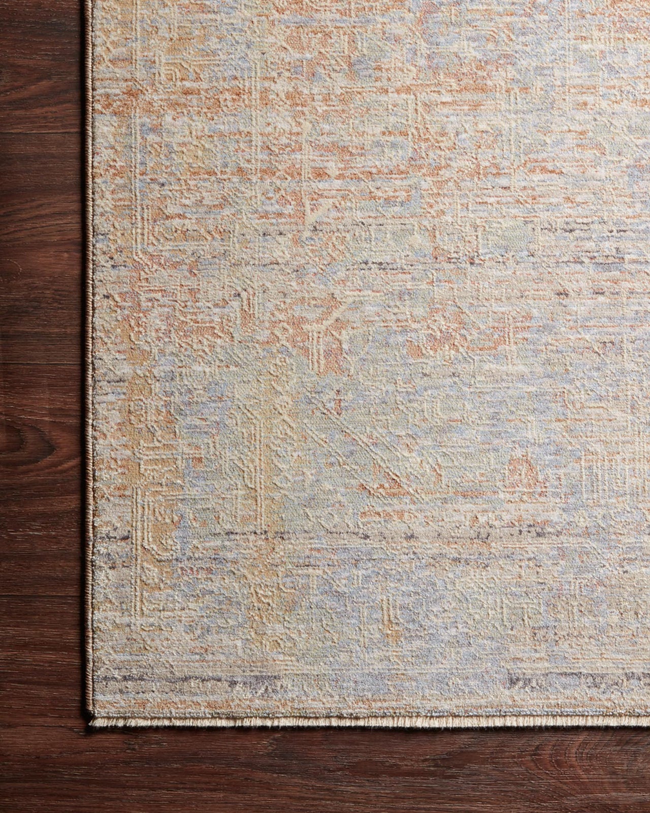 Power-loomed of polyester and viscose in Turkey, the Faye Collection displays a soft color palette and a mix of distressed and traditional-inspired motifs.
