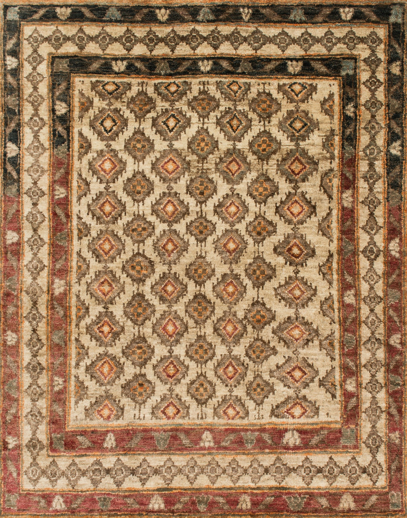 Featuring rich colors, ethnic patterns, and an earthy 100% jute fiber, the Nomad Collection from India pays homage to tribal design while updating the look for today's interiors. The thick, hand-knotted pile and bold design make for an eye-catching centerpiece in any room.