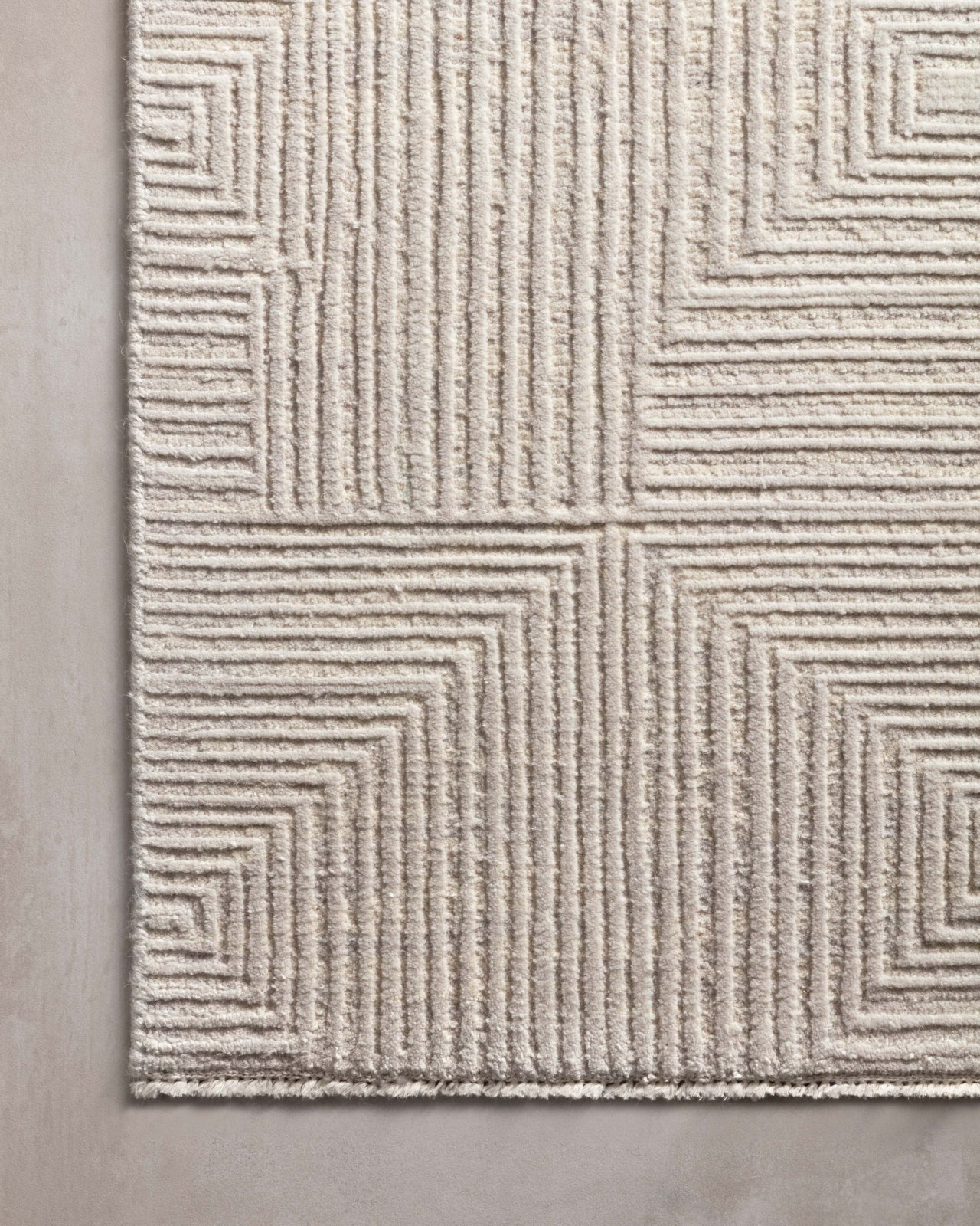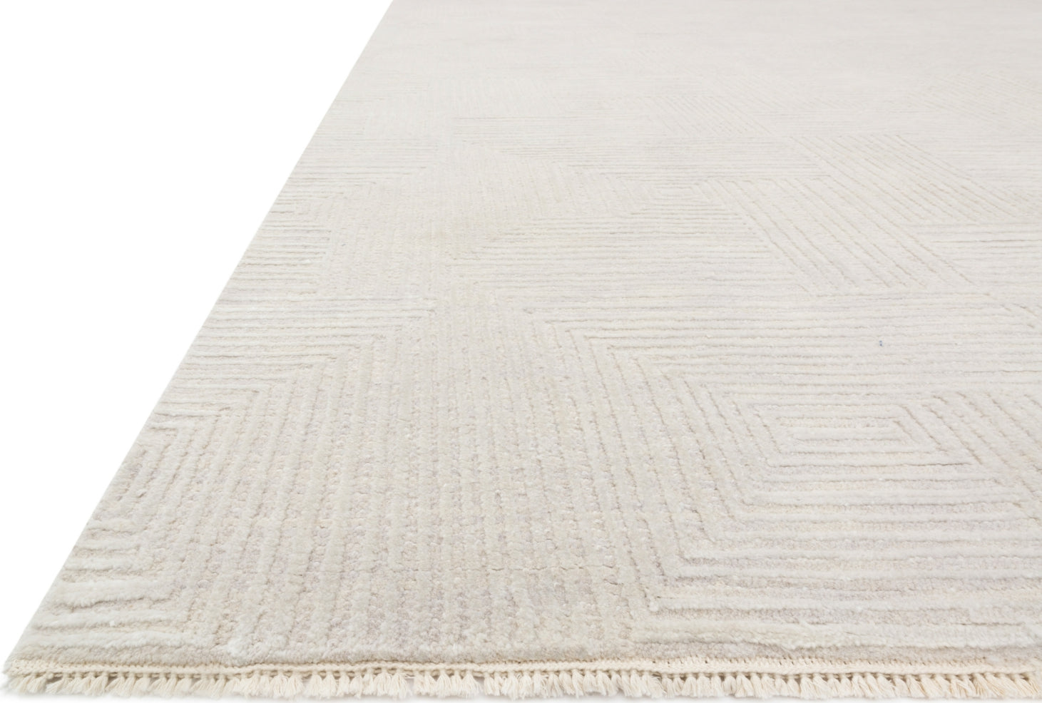 Intricately hand-knotted in India of wool and viscose pile, the Rhea Collection is beautifully delicate with an oblique striping of a lace-like quality and a pearly, neutral color palette. The hi-lo pattern adds a sophisticated yet striking appeal to any decor style.