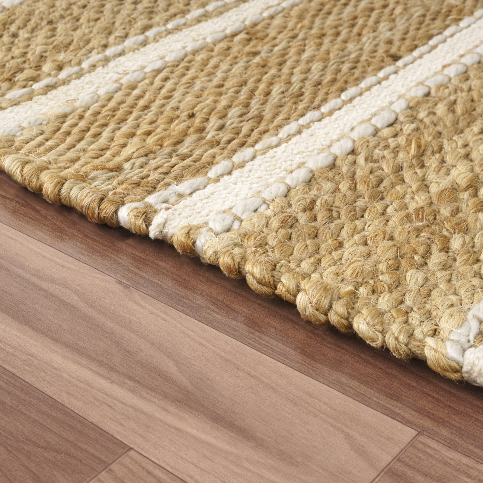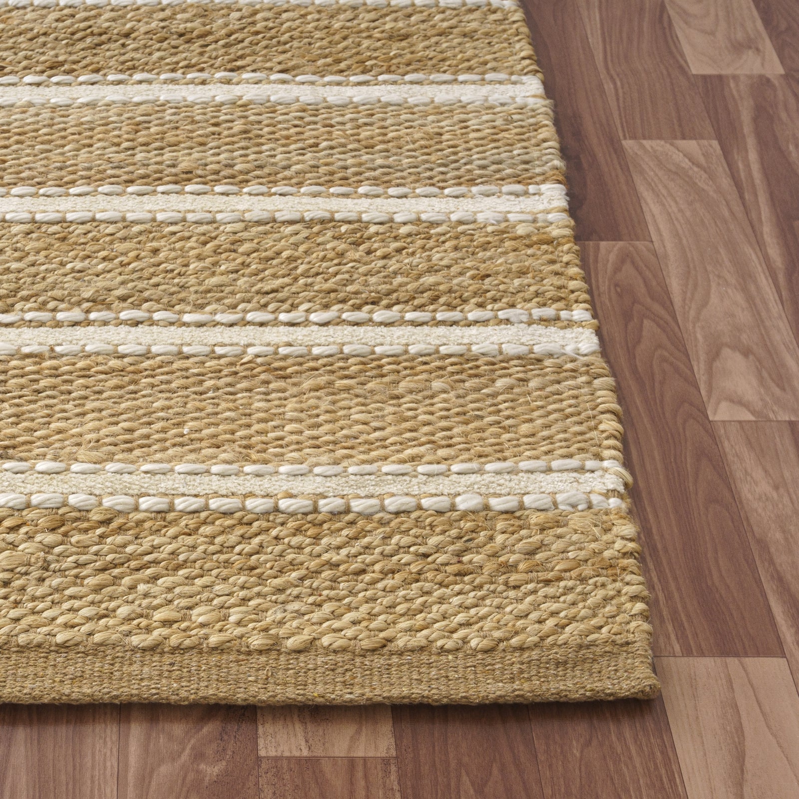 Transform your living space with the Ivory/Natural Nautical Coastal Striped Hand-Woven Indoor Area Rug, a masterpiece of craftsmanship originating from India. Hand-woven with precision, this rug boasts a composition of 67% Jute, 26% Cotton, and 7% PET, ensuring both durability and eco-friendliness. The tranquil Ivory hues and classic striped pattern evoke a coastal ambiance, seamlessly fitting into nautical, transitional, and casual-themed interiors. Enjoy the inviting texture underfoot, adding warmth and character to your home. Elevate your decor with this versatile indoor rug, perfectly balancing natural elements and contemporary style. Bring the essence of coastal living into your space with the Ivory/Natural Nautical Coastal Striped Hand-Woven Indoor Area Rug, where comfort meets timeless design.