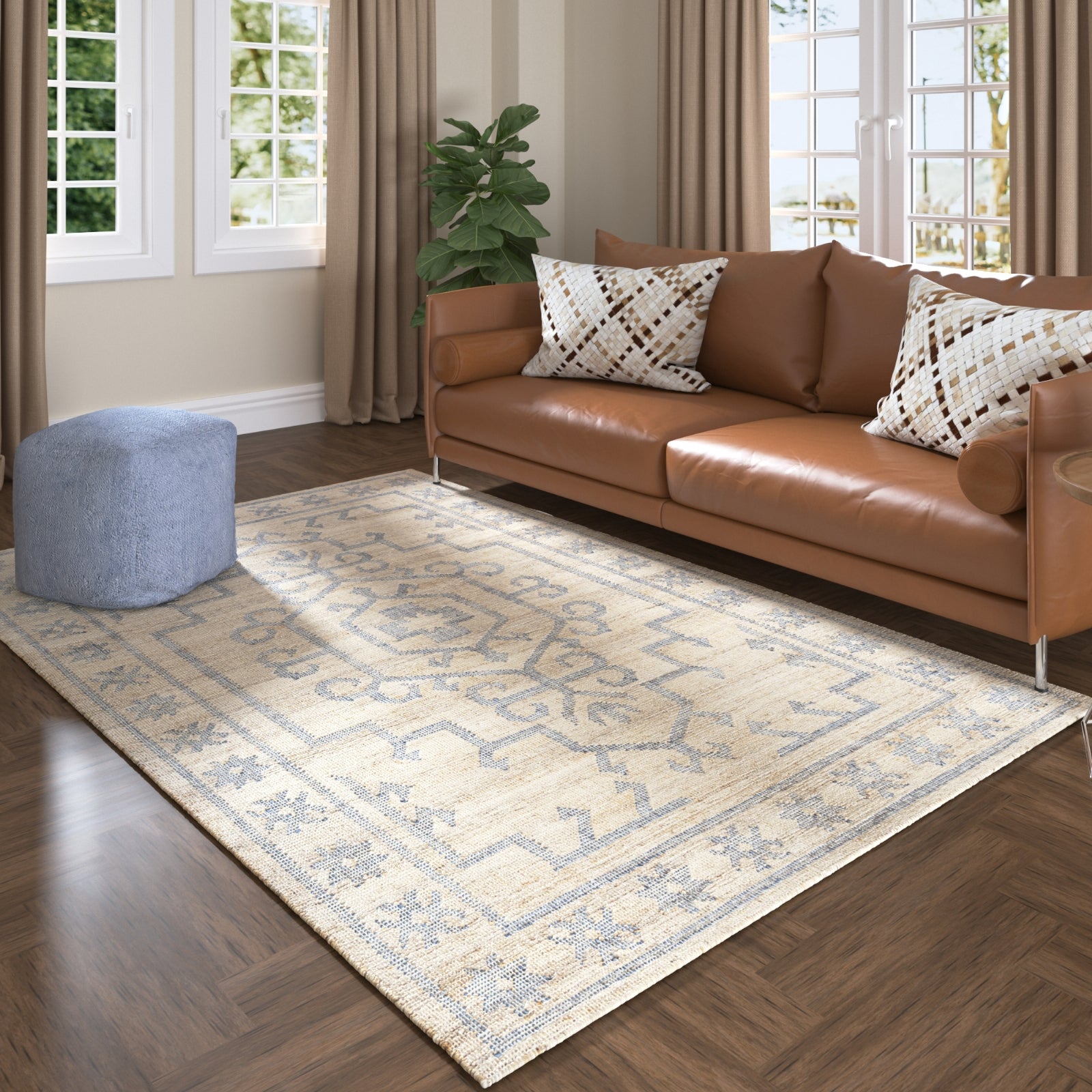 Discover timeless elegance with the Hand-Woven Indoor Area Rug. Hand-woven in India, this rug blends traditional craftsmanship with transitional style, making it a versatile addition to any space. Crafted from 65% jute, 15% wool, and 20% cotton, it offers durability and a natural feel underfoot. The classic medallion pattern in soothing blue tones enhances its visual appeal, complementing both classic and casual interiors effortlessly. Finished with a cotton backing for added stability, this rug is designed for easy maintenance-simply spot clean when needed. Whether placed in the living room, bedroom, or dining area, this rug brings warmth and character while anchoring your decor with understated charm. Ideal for those seeking quality, style, and enduring beauty in their home furnishings.
