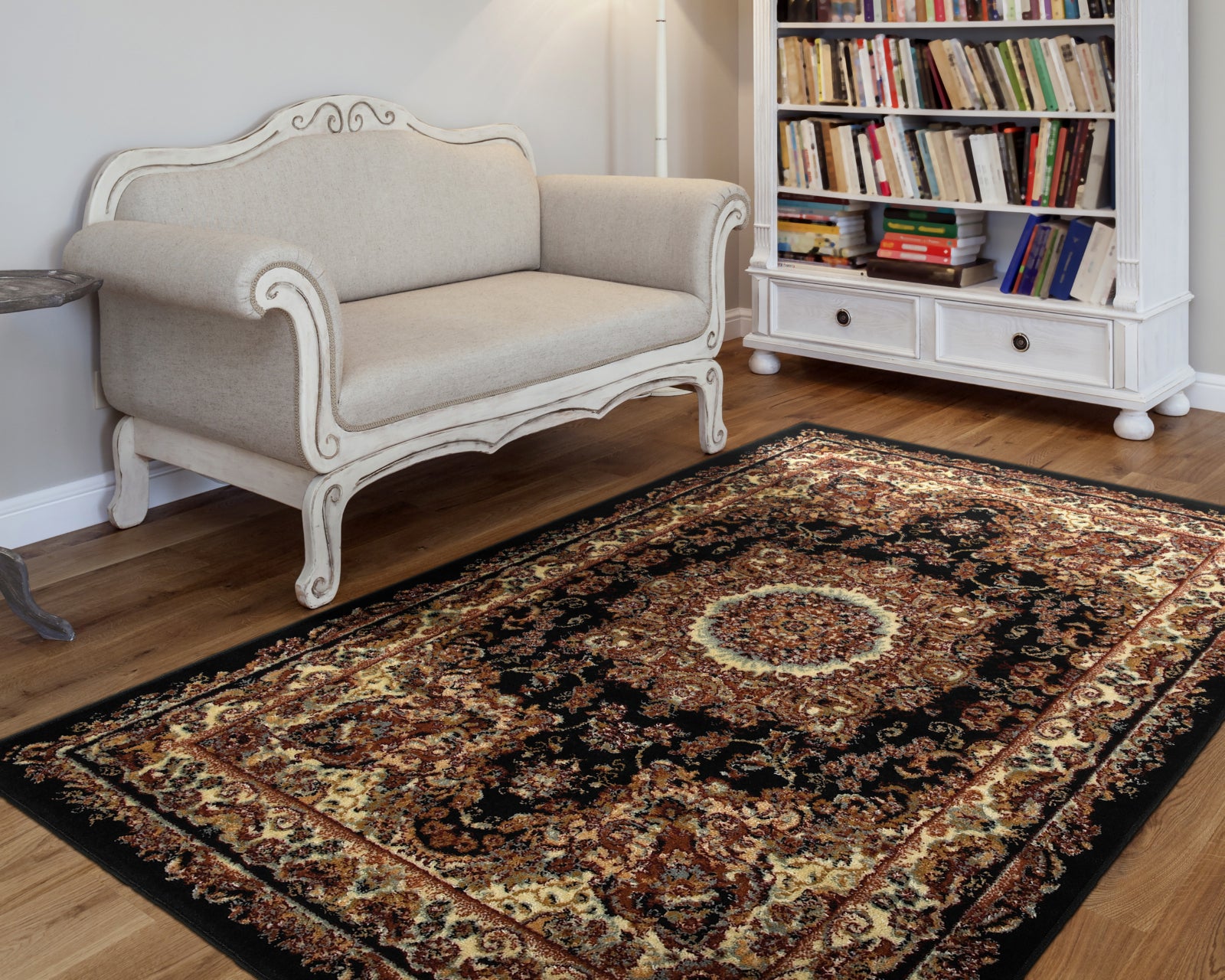 Lend a touch of elegance to any room with this exquisite area rug. It is machine woven to provide excellent quality and durability. The intricate traditional and oriental designs on a claret background make this rug attractive. As this rug is available in multiple sizes, you can choose the one that you prefer the most. This is ideal for any room decor and complements them naturally. It is easy to care for and can be vacuumed frequently. This area rug needs a rug pad.