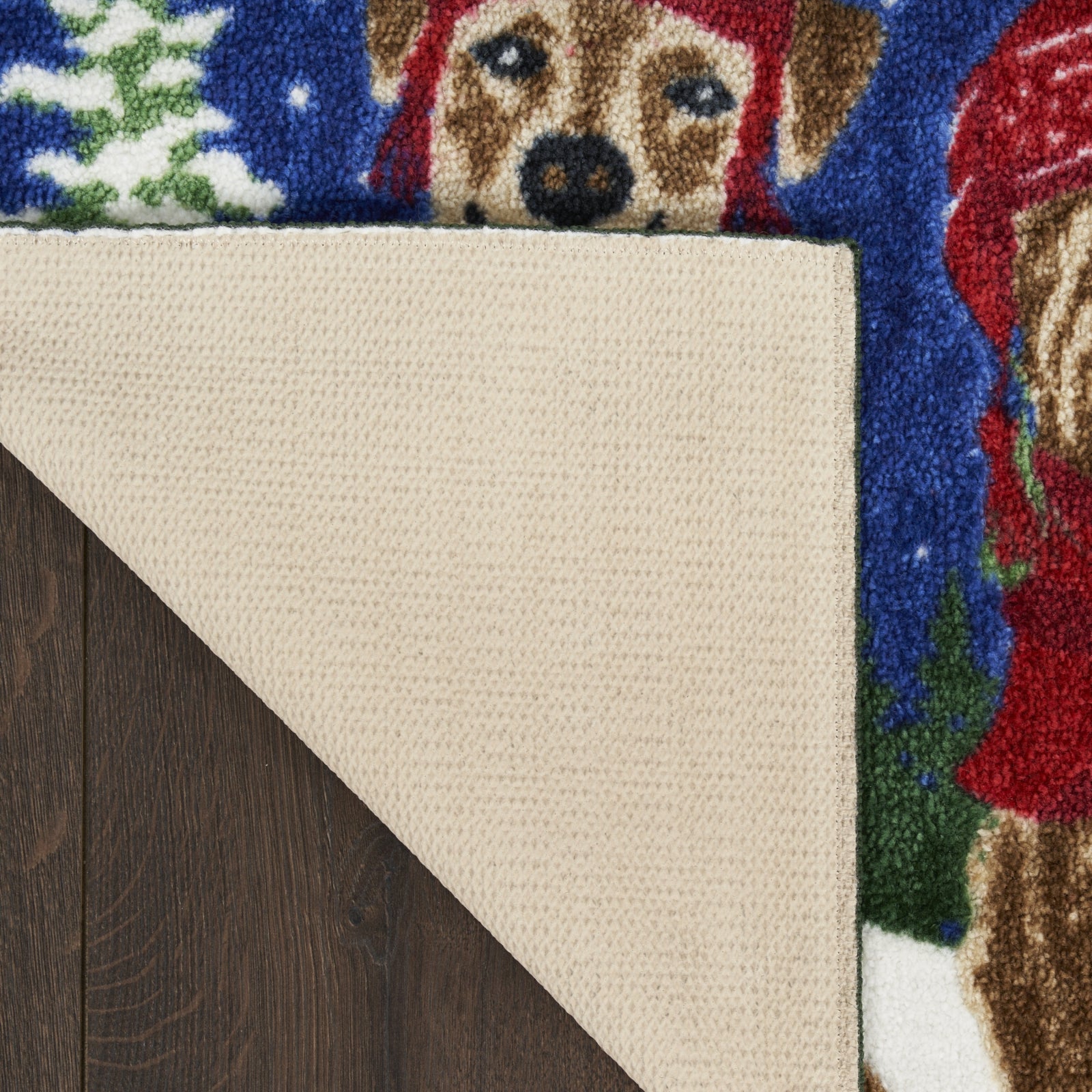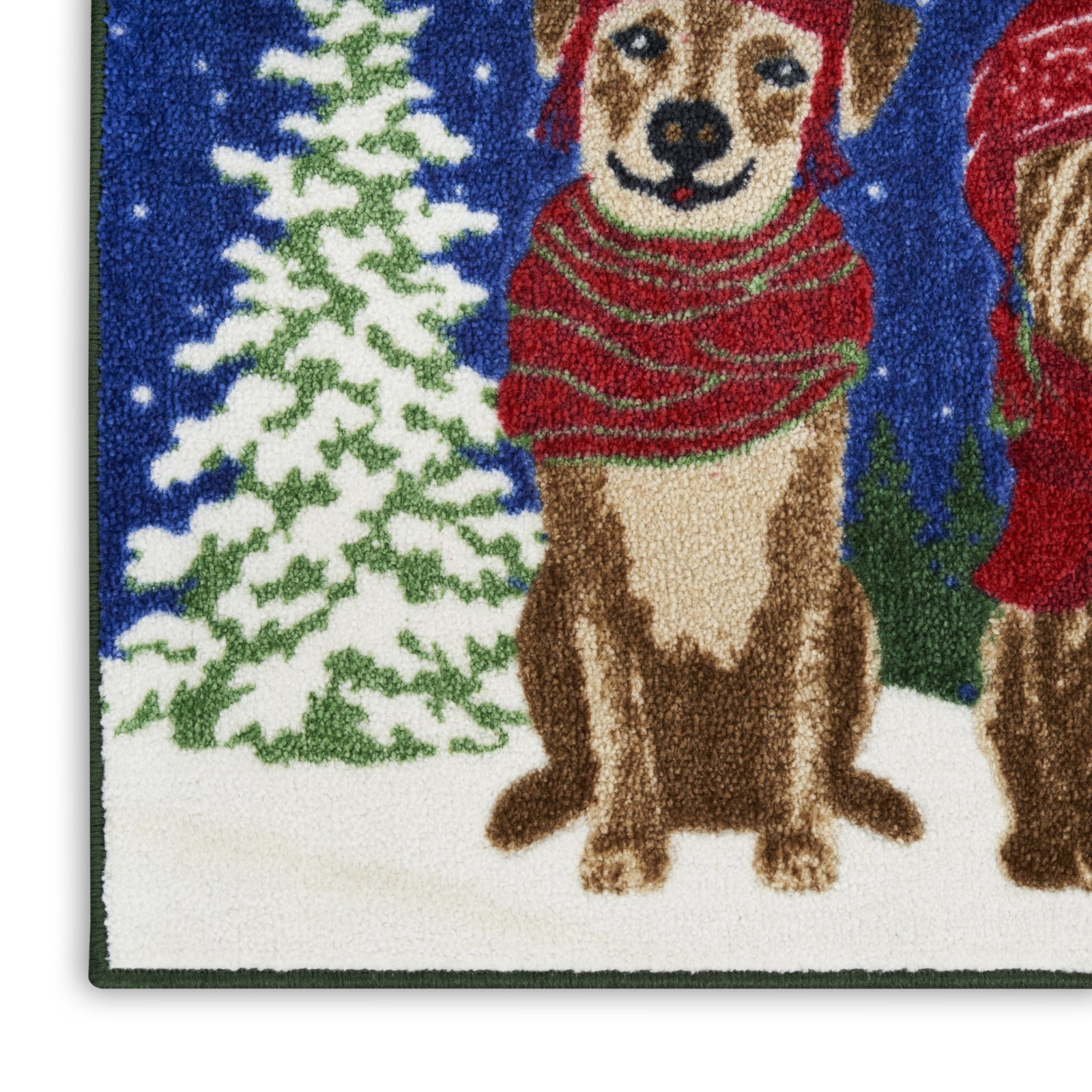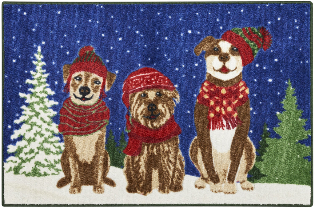 - Whether you're a dog owner or just love all pets, this holiday accent rug adds heartwarming energy to your seasonal decor. The trio of dogs, dressed up in knit hats and scarves, evokes a sense of comfort enhanced by its textured, tufted pile. Made from polyester for low maintenance style - great for placement in your entryway, bathroom, or kitchen.