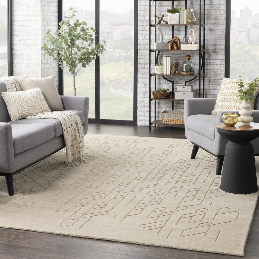 This modern beige rug from the Alessia Collection adds cozy style to your decor. Effortlessly blending style and function, this neutral rug features a heathered ground that adds nuanced color variations, a carved geometric pattern that offers a subtle layer of depth, and a medium-thick pile that has a softly cushioned texture. Handmade from 100% European wool