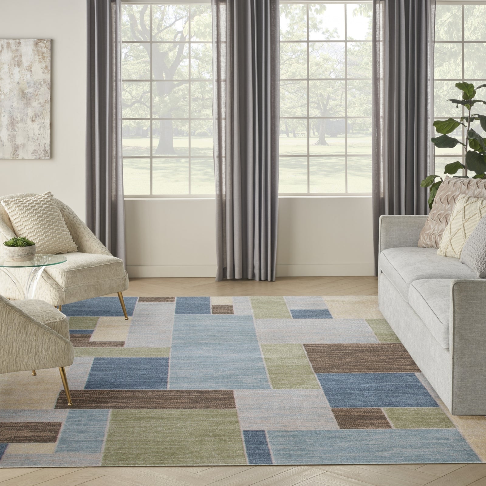 - Make a bold statement with this contemporary rug from the Astra Machine Washable Collection. The softly textured surface features a muted color block pattern in shades of blue, green, and brown, with a shimmery finish that shifts in tone under different light. Made from easy-clean yarns: simply place into your washing machine and air dry!