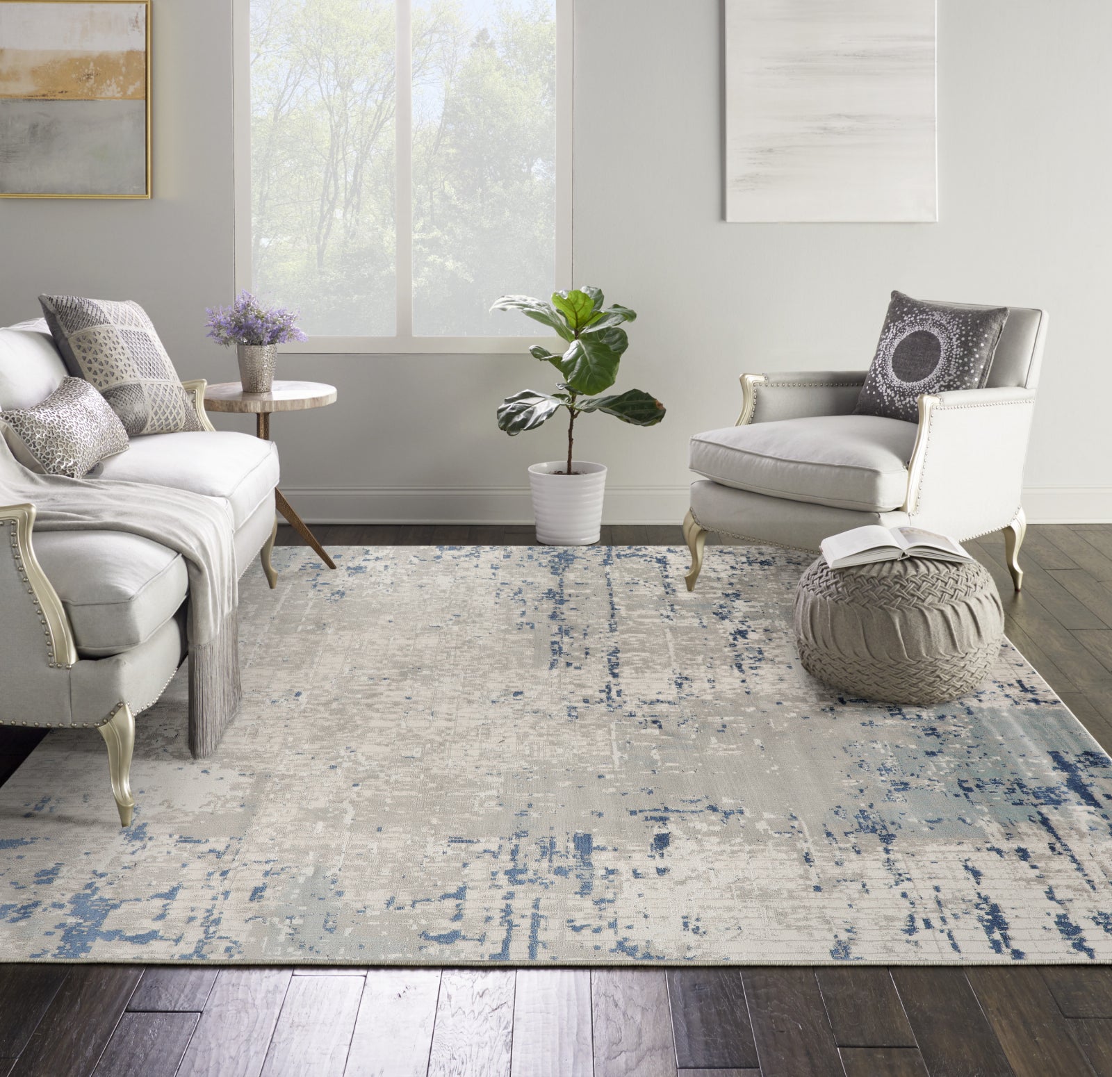 - Invite movement and depth to your space with this blue and grey abstract rug from the Concerto Collection. Pools of neutral colors tie together the various elements of your room without being overpowering, while the low-profile construction lays flat quickly and does not shed. Made from a softly textured blend of polypropylene and polyester yarns designed to hide dirt and the regular wear of family life. Choose from a variety of shapes and sizes to decorate any space including the living room, hallway, entryway, dining room, and kitchen.