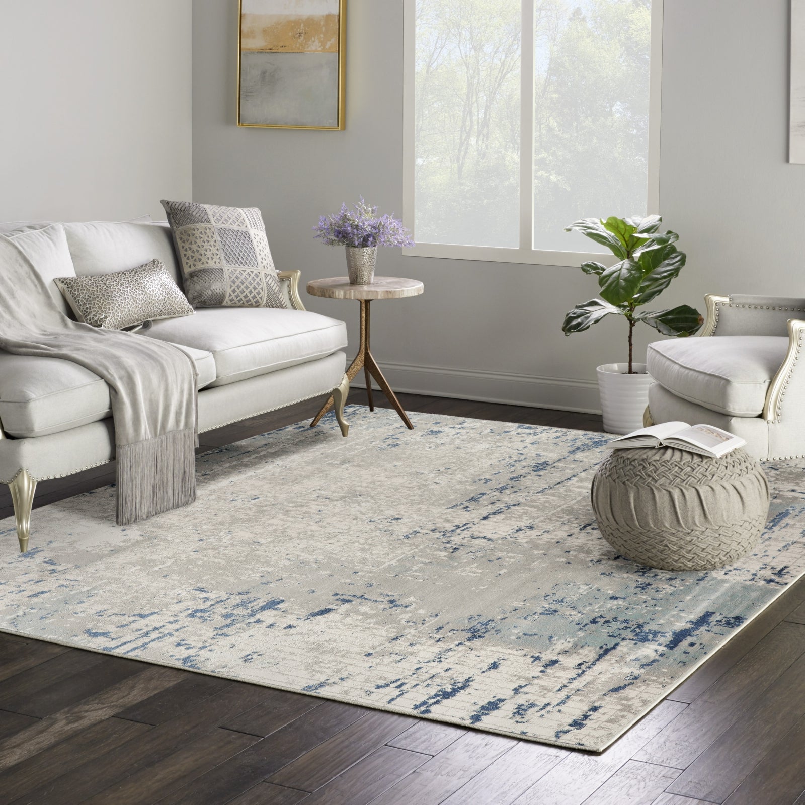 Invite movement and depth to your space with this blue and grey abstract rug from the Concerto Collection. Pools of neutral colors tie together the various elements of your room without being overpowering, while the low-profile construction lays flat quickly and does not shed. Made from a softly textured blend of polypropylene and polyester yarns designed to hide dirt and the regular wear of family life. Choose from a variety of shapes and sizes to decorate any space including the living room, hallway, entryway, dining room, and kitchen.