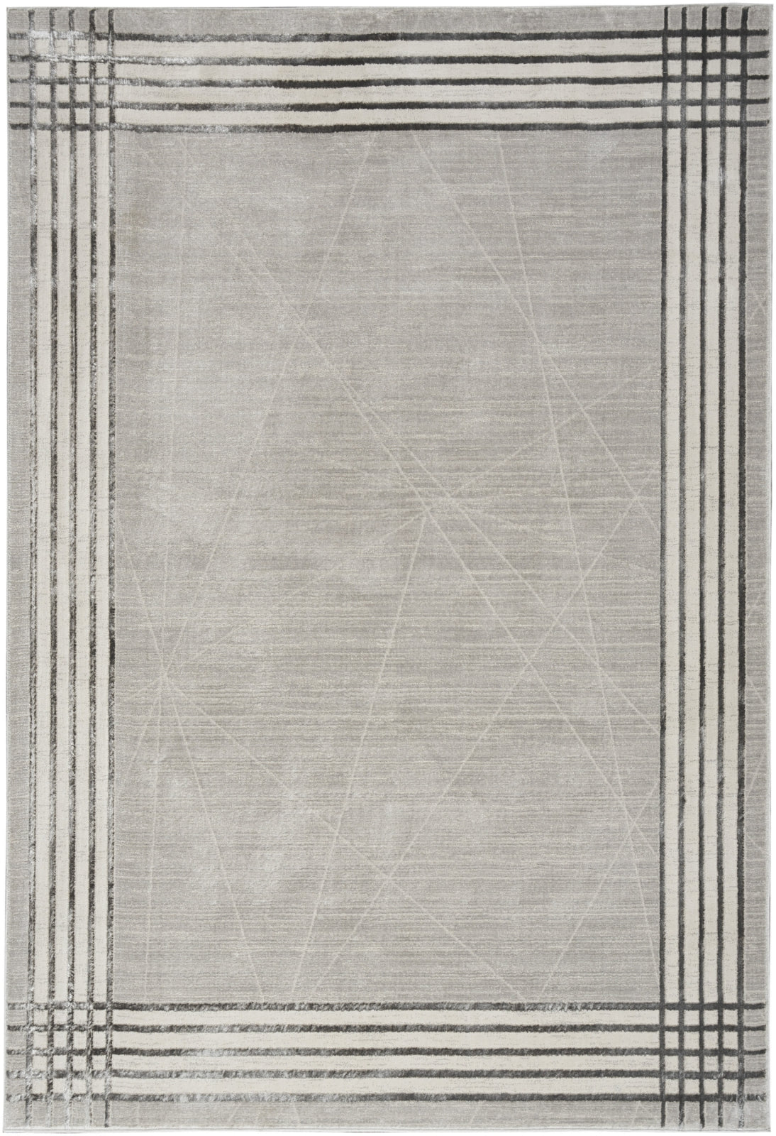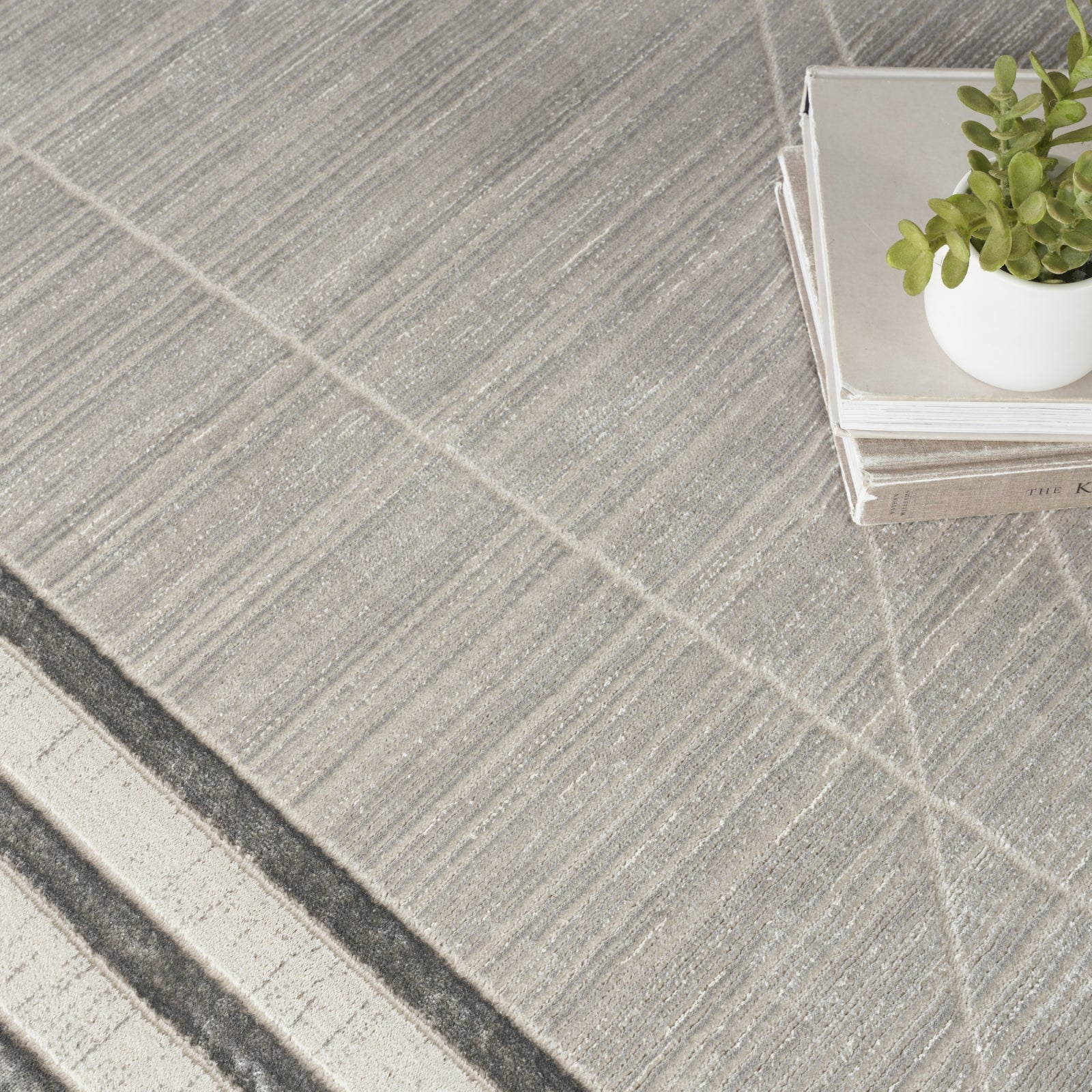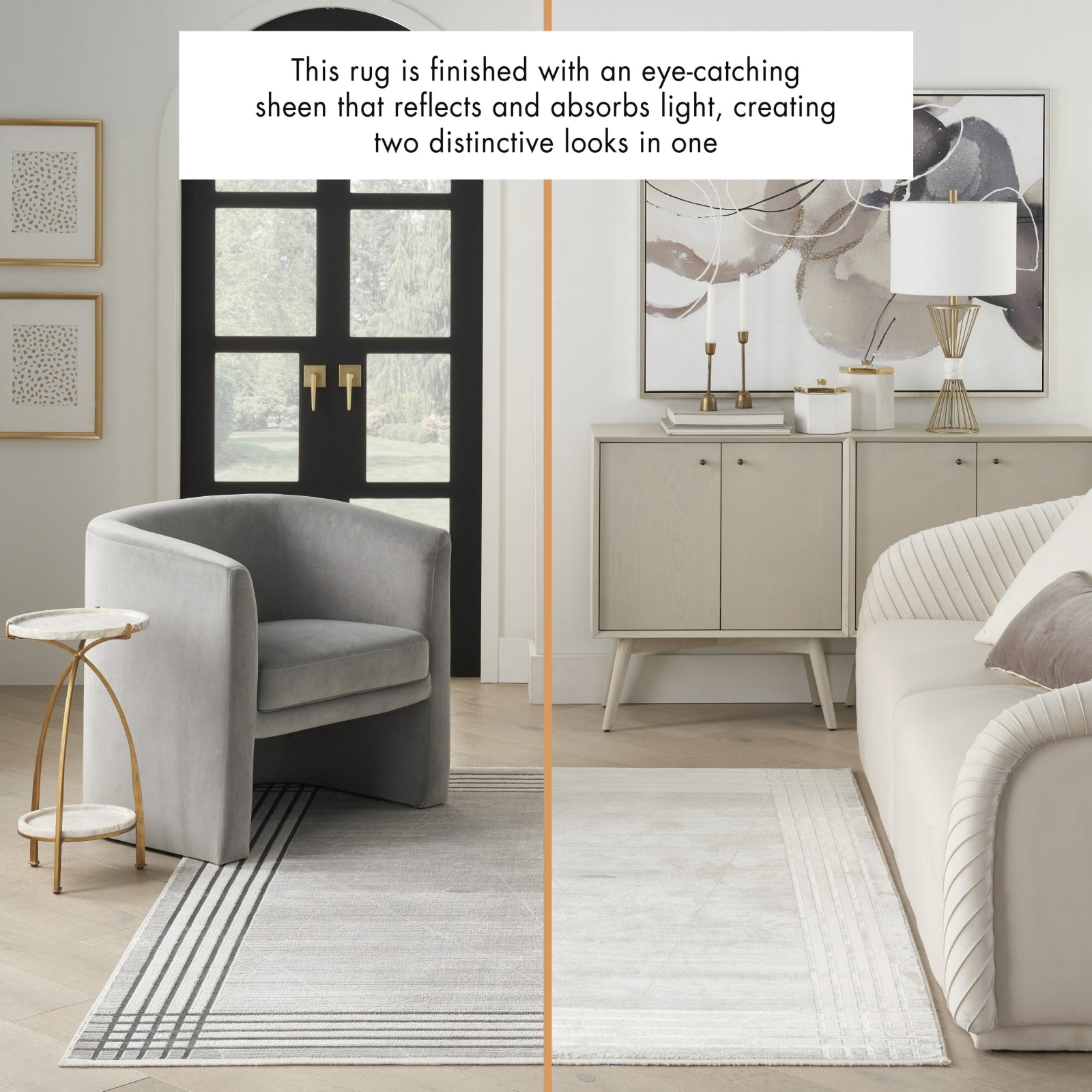 Refresh your space with the clean linear pattern of this abstract rug from the Desire Collection. The heathered grey base is overlaid with a broken stripe design, contrasting charcoal and white linear border, and subtly carved accents that create visual interest. Made from polyester yarns finished with an eye-catching shimmer that changes from black to silver with changes in light, this modern rug is great for busy households with a low-profile, easy to clean construction.