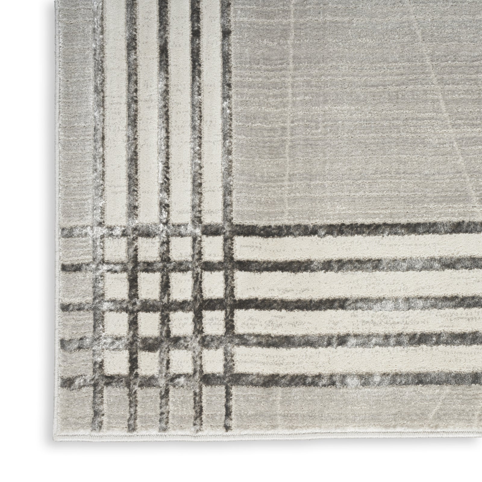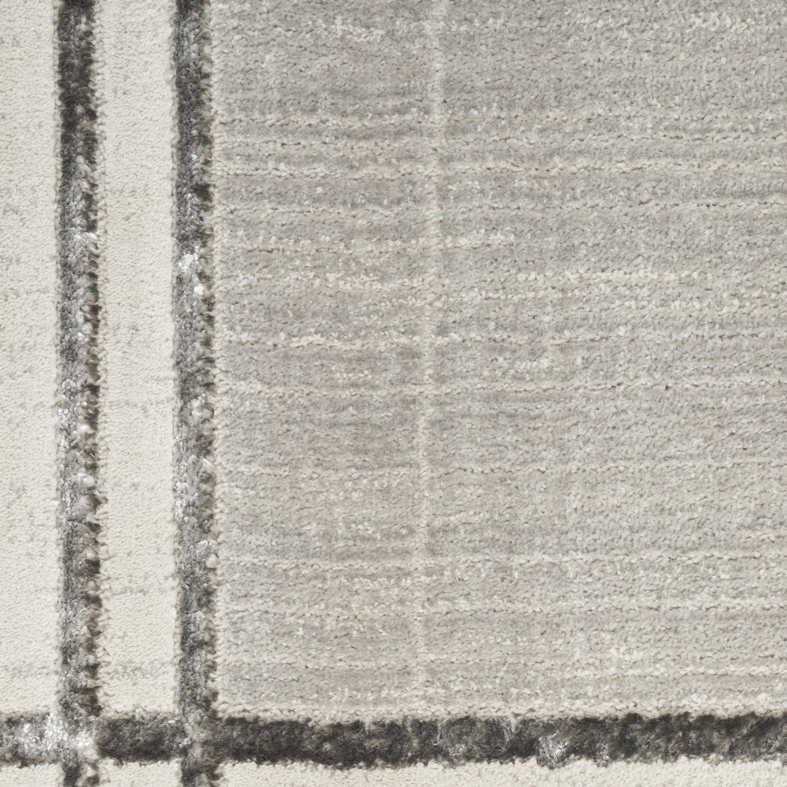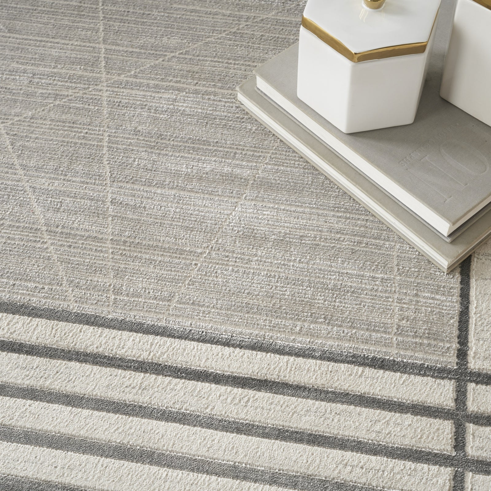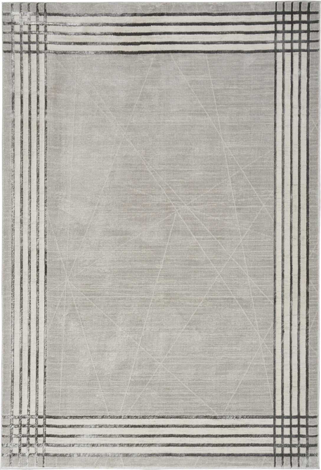 Refresh your space with the clean linear pattern of this abstract rug from the Desire Collection. The heathered grey base is overlaid with a broken stripe design, contrasting charcoal and white linear border, and subtly carved accents that create visual interest. Made from polyester yarns finished with an eye-catching shimmer that changes from black to silver with changes in light, this modern rug is great for busy households with a low-profile, easy to clean construction.