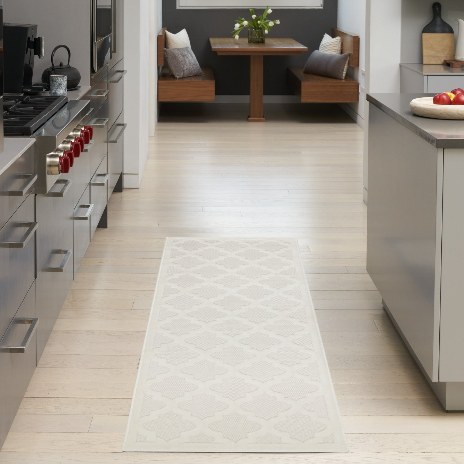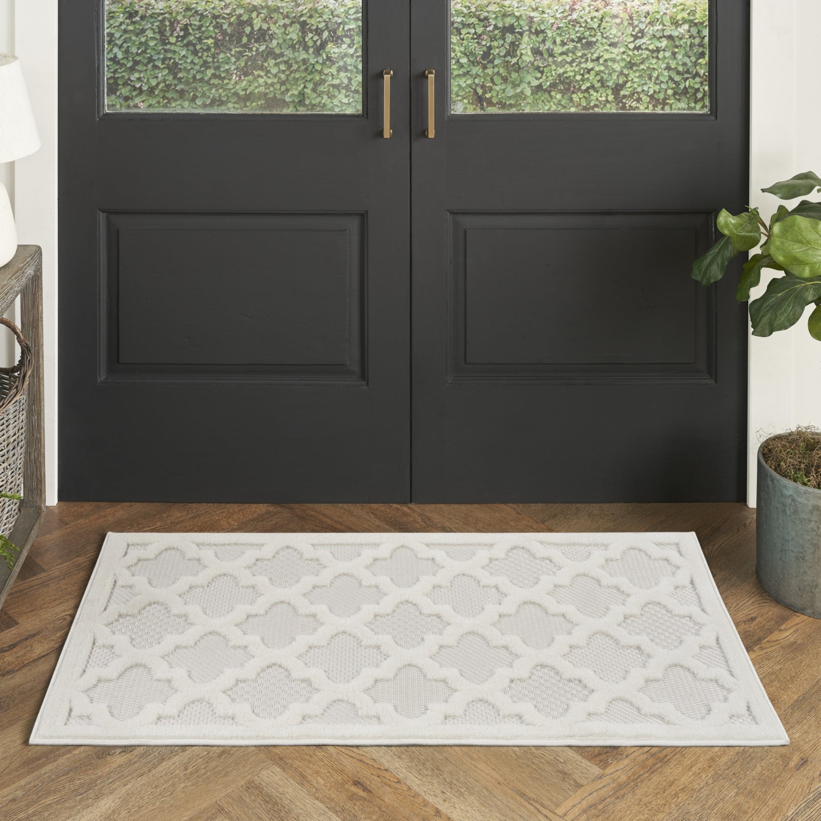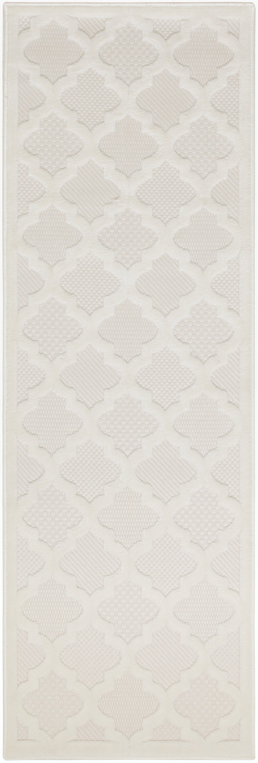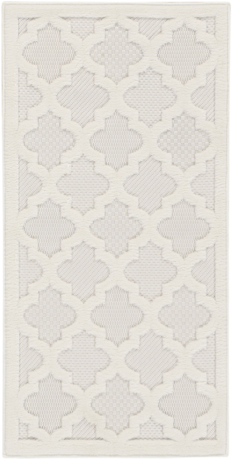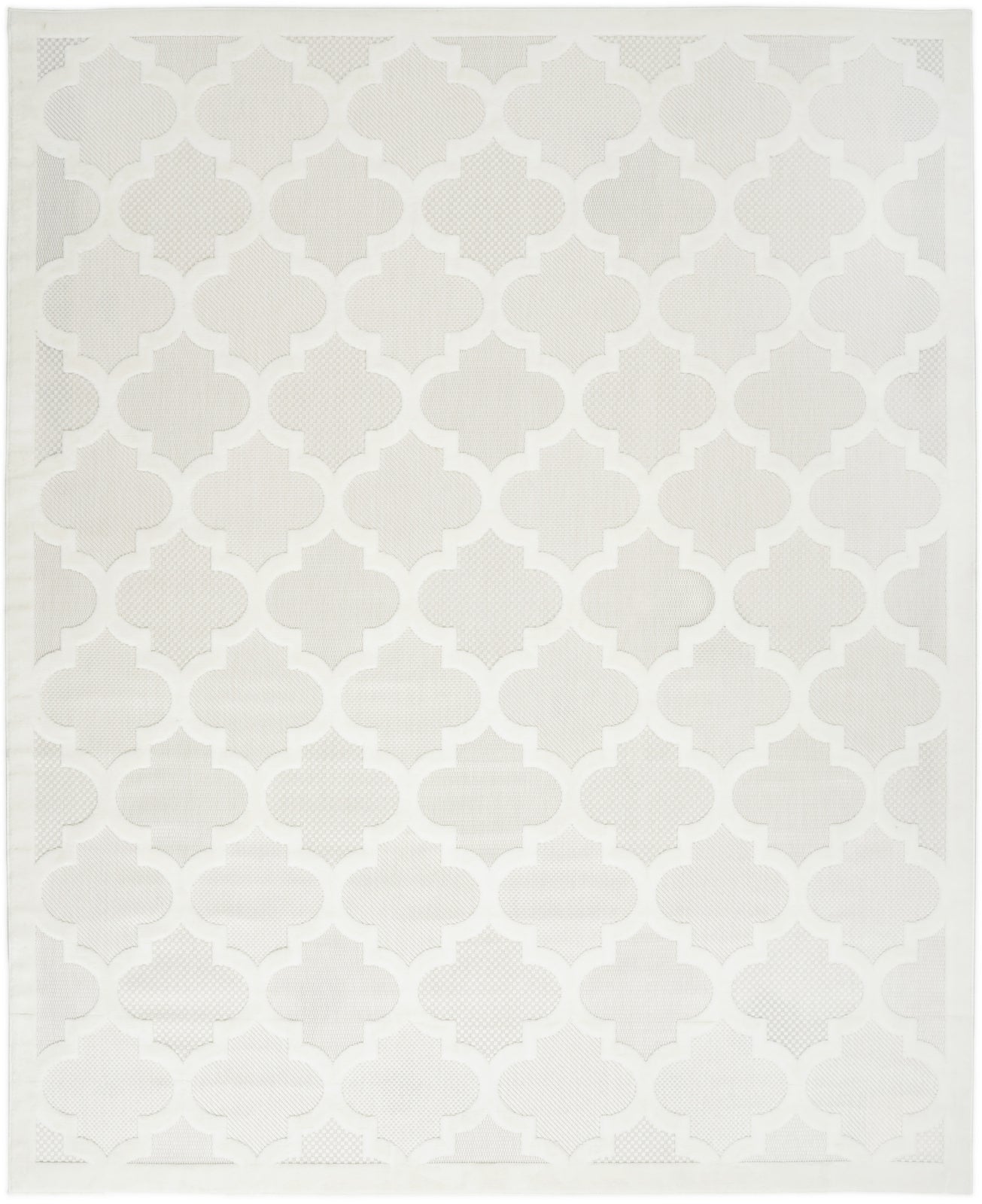 - Ground your indoor or outdoor seating area in the stylish appeal of this indoor/outdoor rug from the Easy Care Collection. With a white backdrop that showcases multiple flatweave styles, enhanced by a raised Moroccan trellis pattern in ivory, this contemporary rug adds an appealing sense of depth to your surroundings. Place it in your living room, dining room, entryway, or favorite outdoor space such as the patio, porch, or deck for an instant style boost. Machine-made from durable, low-shed fibers that are easy to clean, making this a great choice for all seasons spent outdoors. Hand washable outdoors: rinse with a hose and air dry.