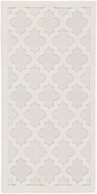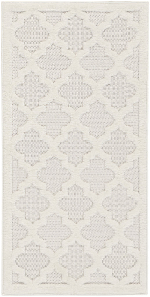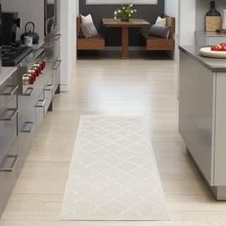Ground your indoor or outdoor seating area in the stylish appeal of this indoor/outdoor rug from the Easy Care Collection. With a white backdrop that showcases multiple flatweave styles, enhanced by a raised Moroccan trellis pattern in ivory, this contemporary rug adds an appealing sense of depth to your surroundings. Place it in your living room, dining room, entryway, or favorite outdoor space such as the patio, porch, or deck for an instant style boost. Machine-made from durable, low-shed fibers that are easy to clean, making this a great choice for all seasons spent outdoors. Hand washable outdoors: rinse with a hose and air dry.