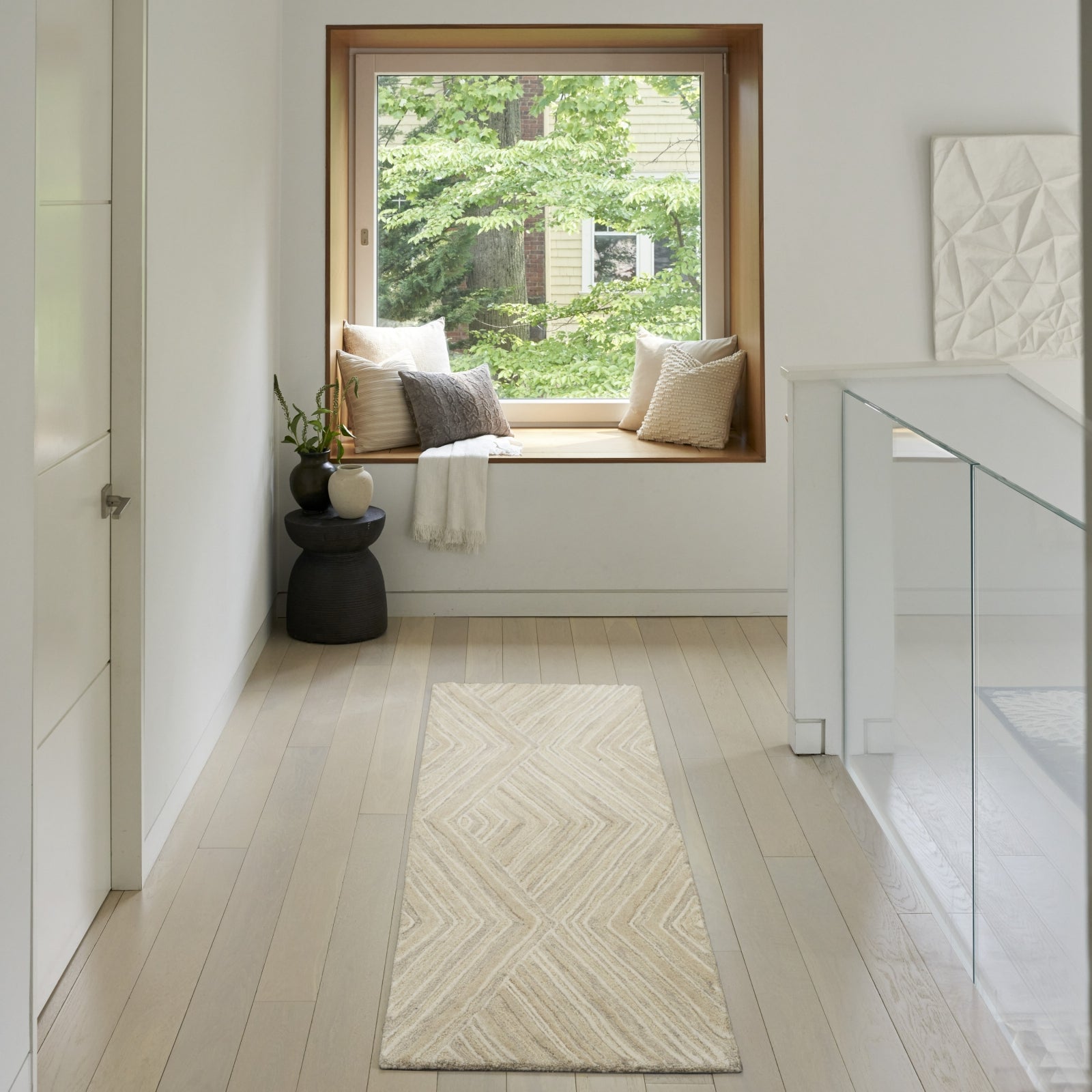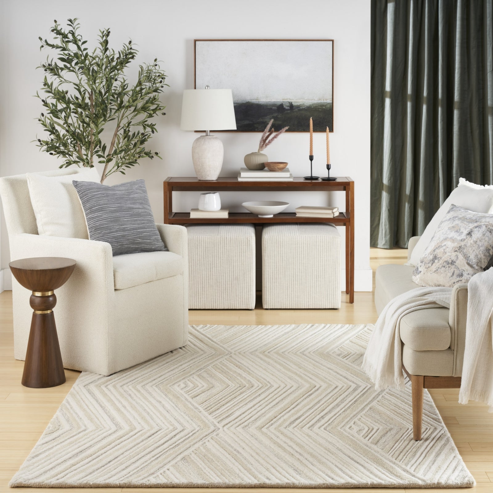 - Infuse sophisticated flair into your home with this ivory geometric rug from the Graceful Collection. The handmade design creates the illusion of two patterns in one, punctuated by a cut-and-loop pile that adds depth and textural appeal. Hand tufted of wool for lasting style and comfort.