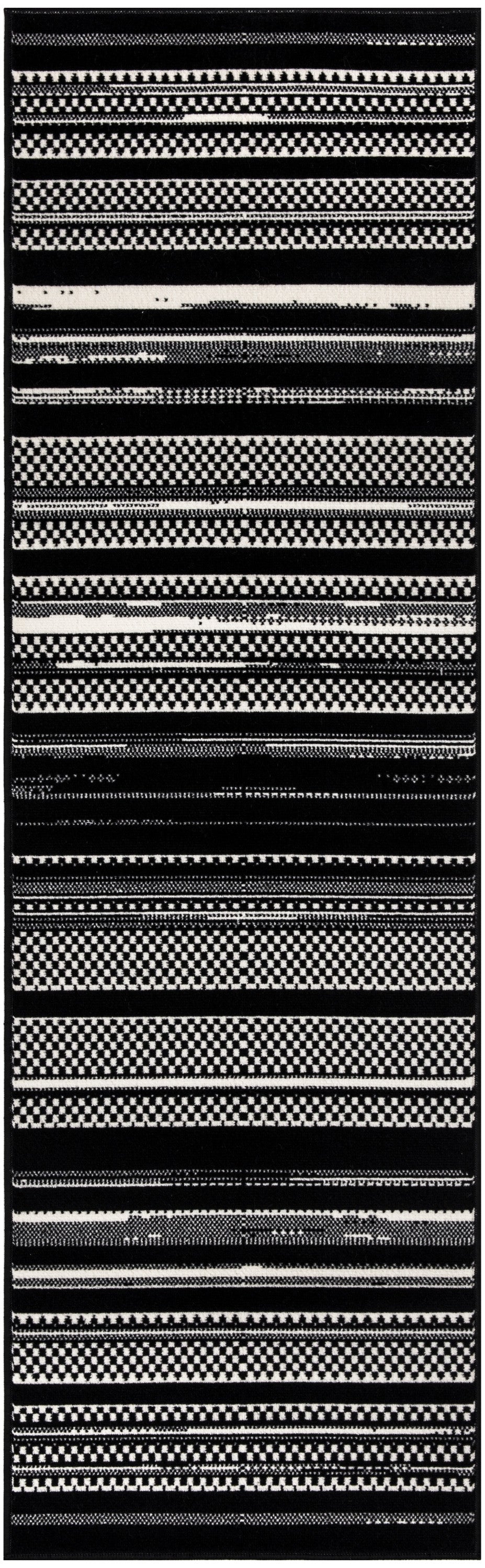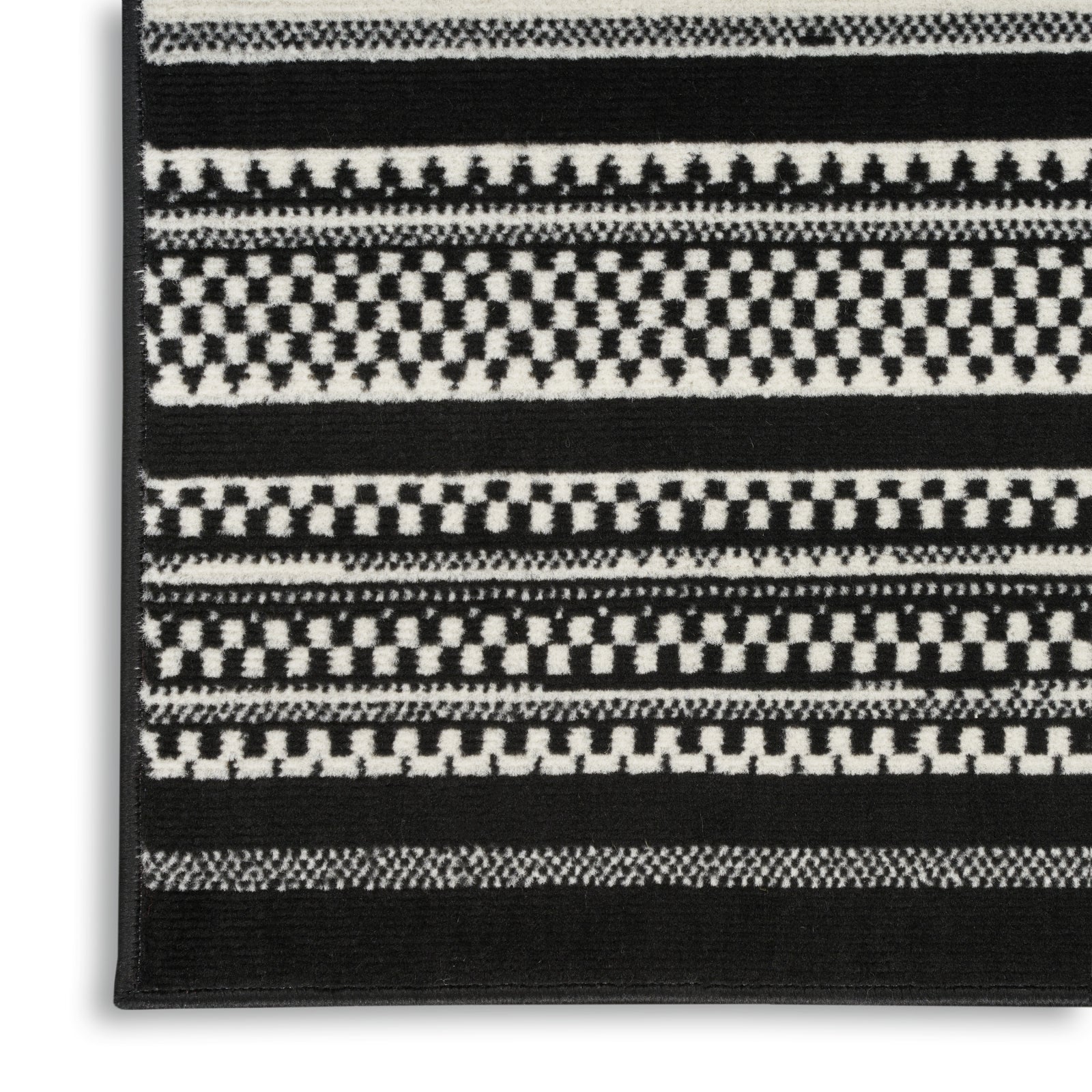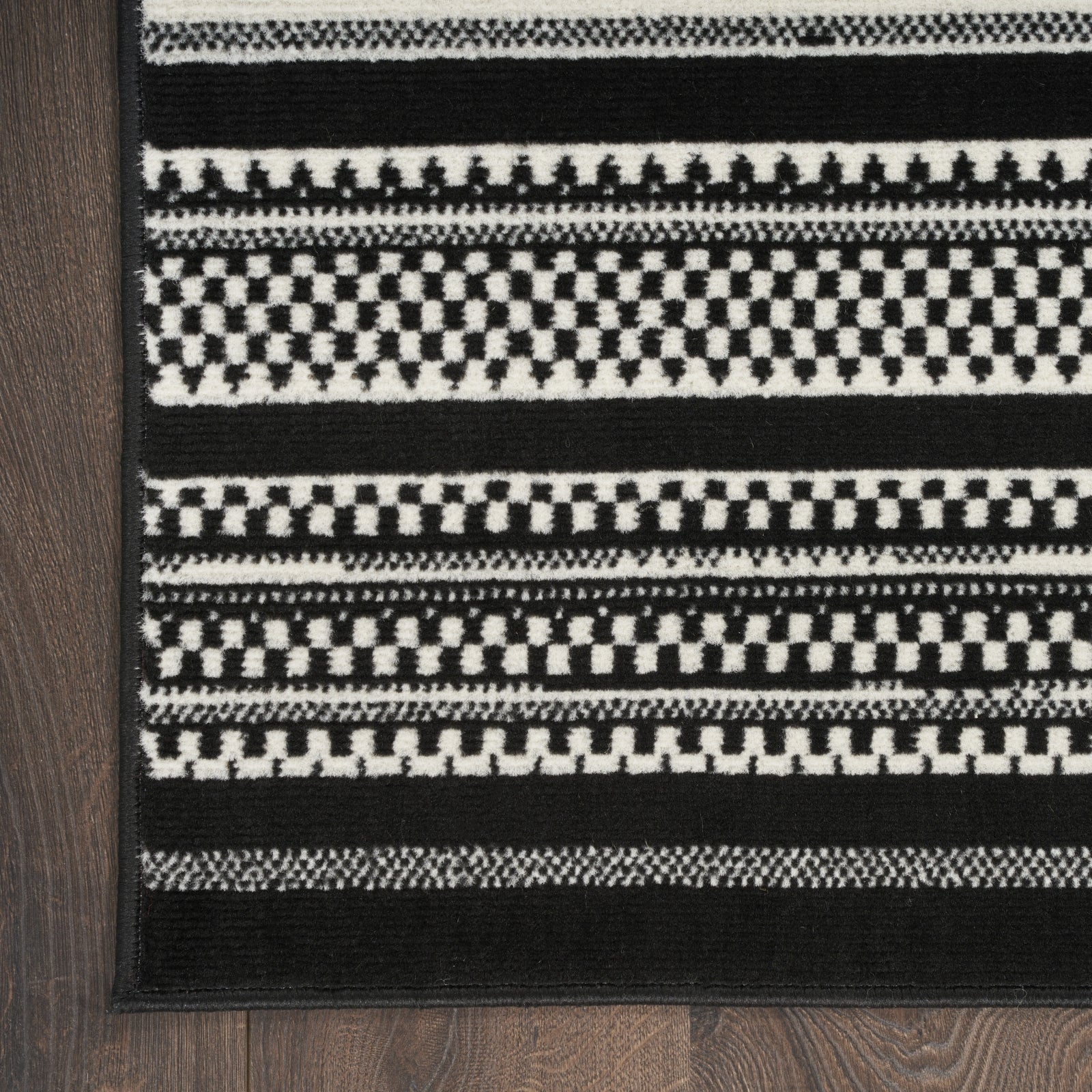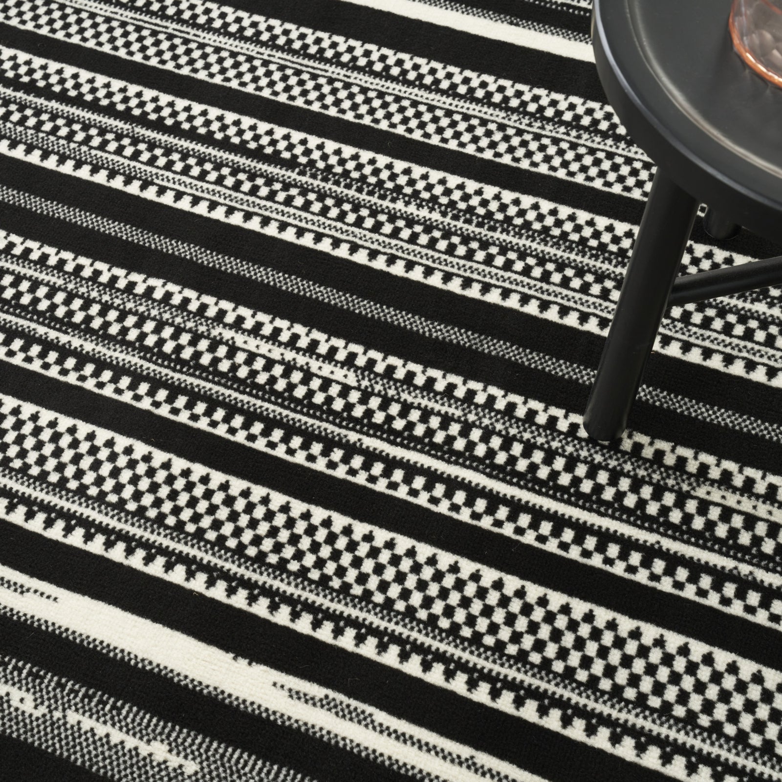 - For the modern maximalist, this black and white abstract striped rug from the Grafix Collection adds bold pattern to your space. The combination of solid stripes, checkered blocks, and lightly distressed lines creates visual interest when added to your kitchen, entryway, bedroom, or living room decor. Machine-made from durable polypropylene yarns that are easy to maintain - great for busy households with pets, young kids, and frequent guests.