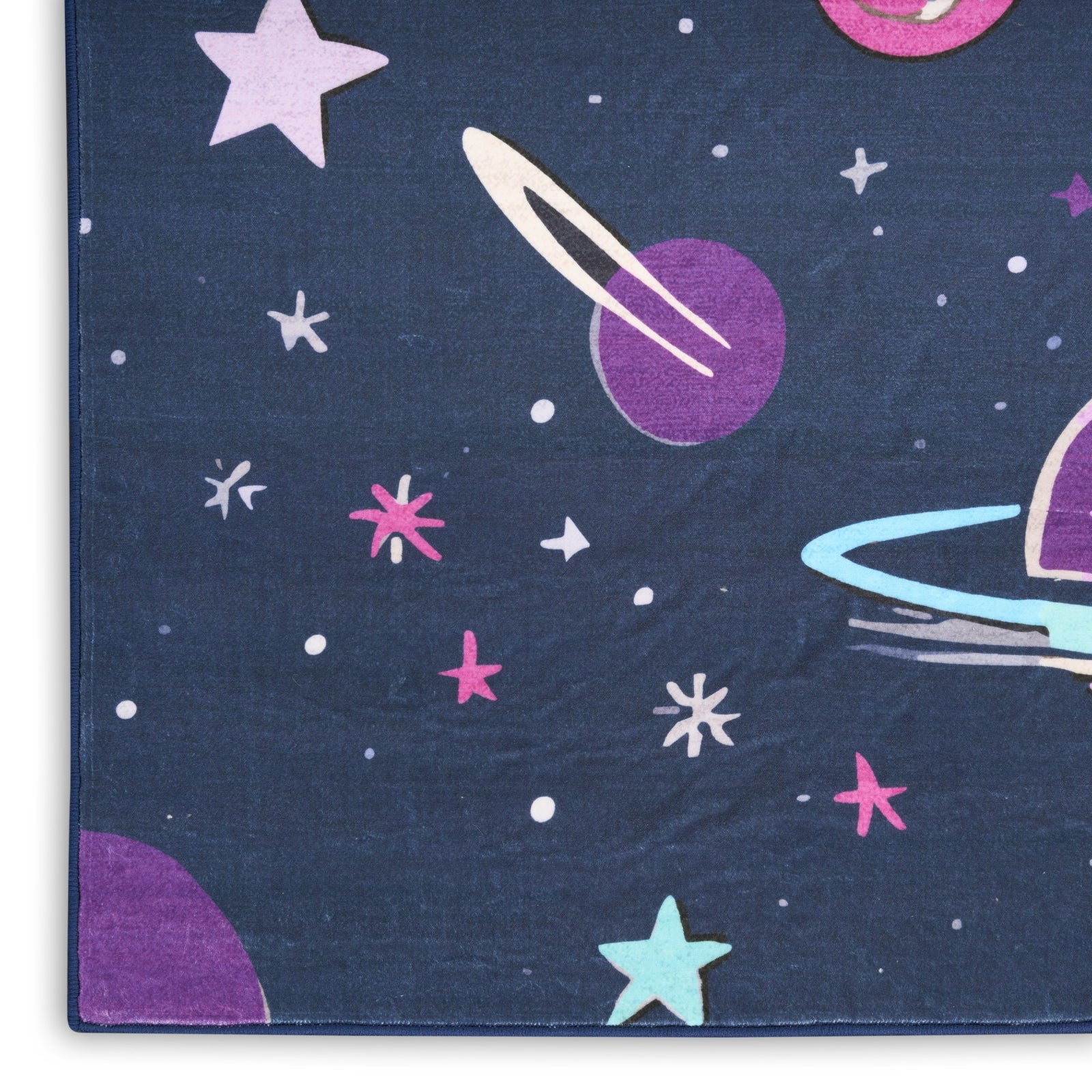 - Inspire a love for the cosmos with this space-themed kids' rug from the Imagination collection. The dark background brings out the charm of the printed purple and blue planetary scene, making this rug perfect for aspiring astronauts. This rug is machine washable with a soft polyester construction and non-skid backing.