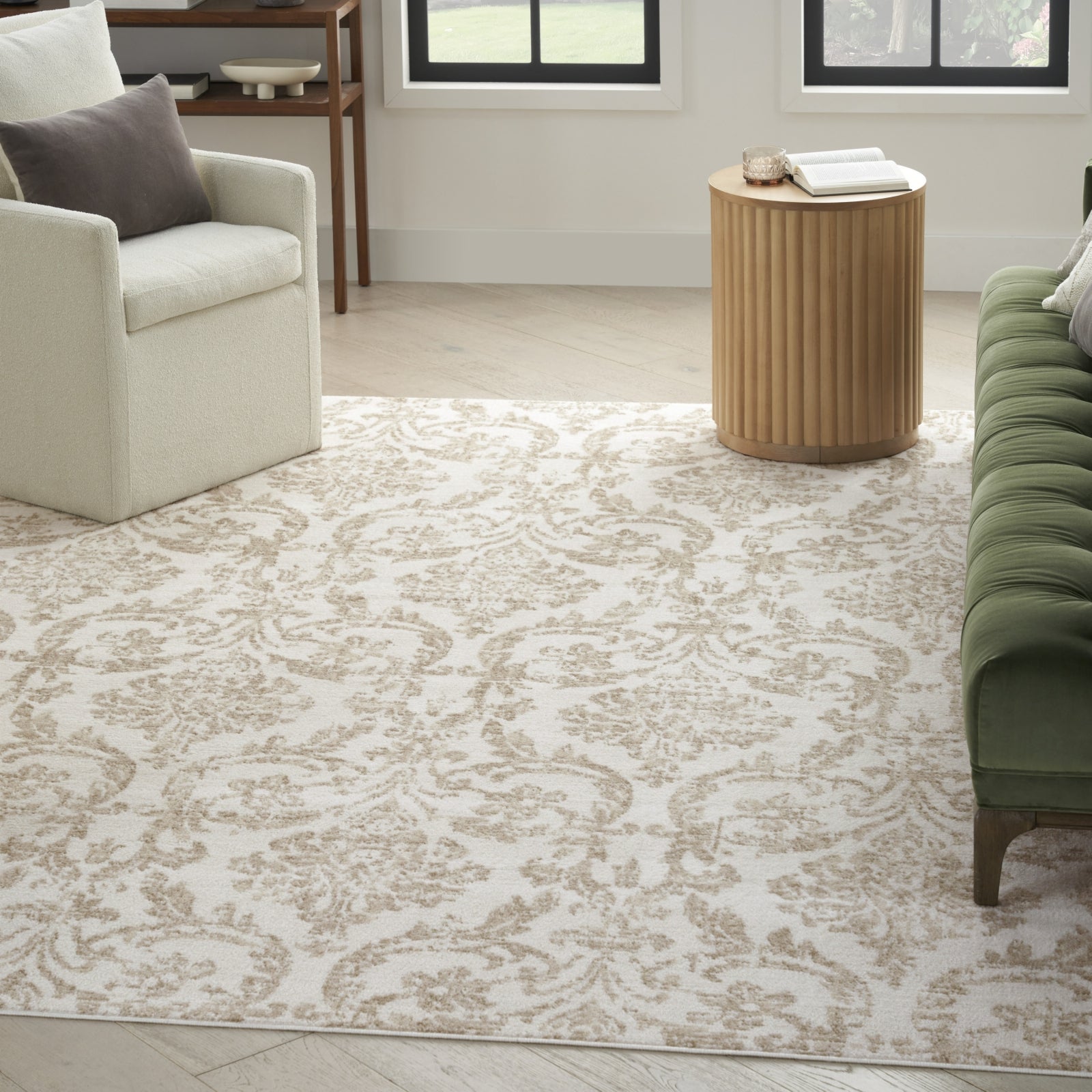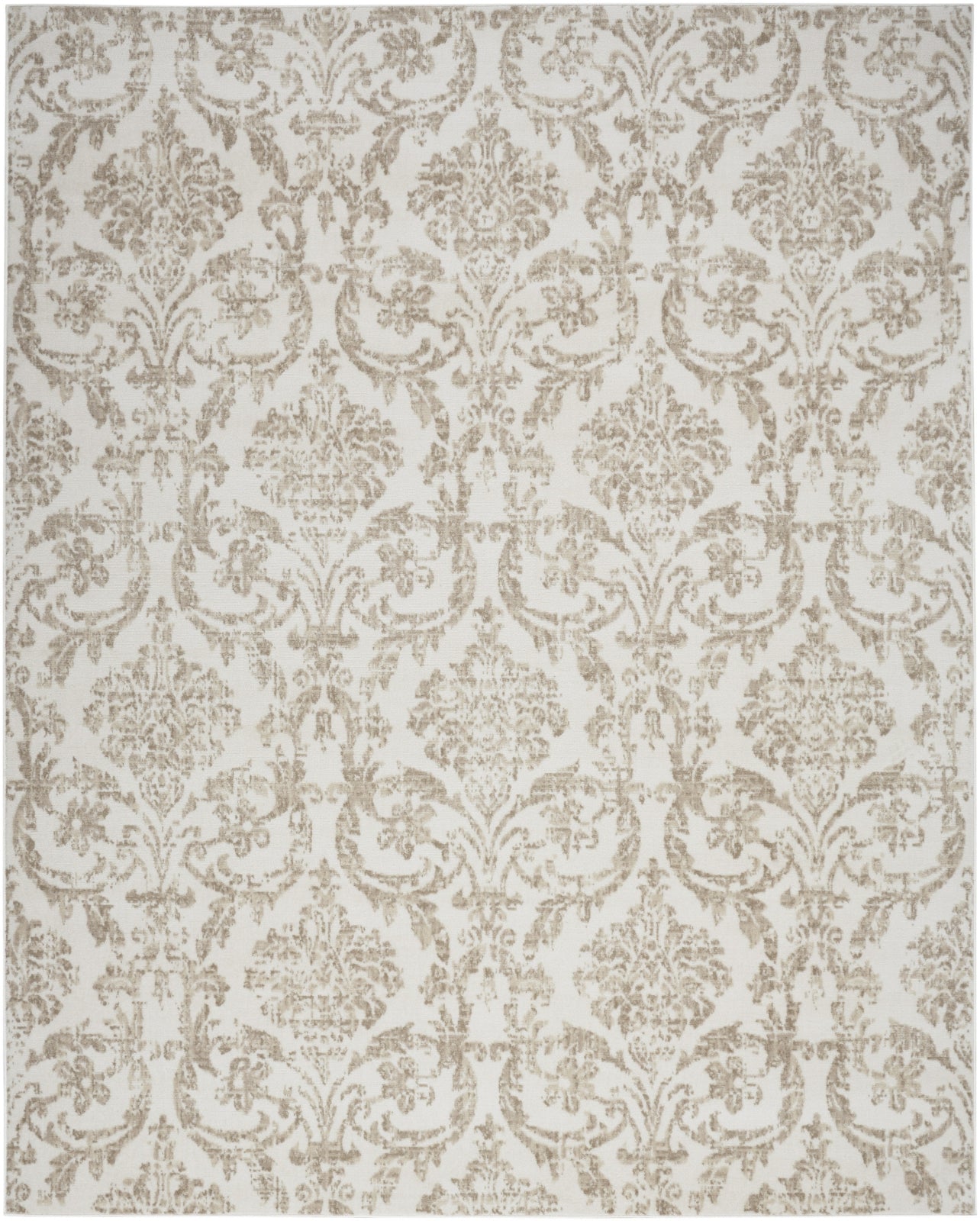 - Bring a storied look to your home with this ivory and beige damask rug from the Jubilant Collection. The classic scrolling pattern channels a vintage feel through a tastefully distressed finish, inviting a sense of old-world elegance. Made from durable polypropylene for easy cleaning and lasting style, with a sleek low pile great for the most regularly trafficked areas of your home.