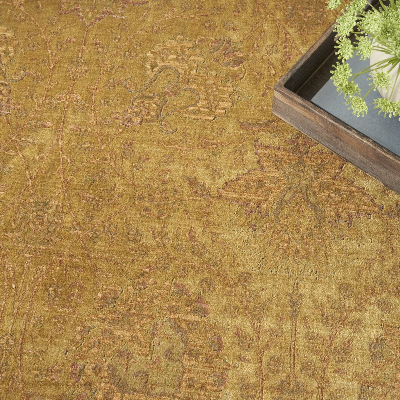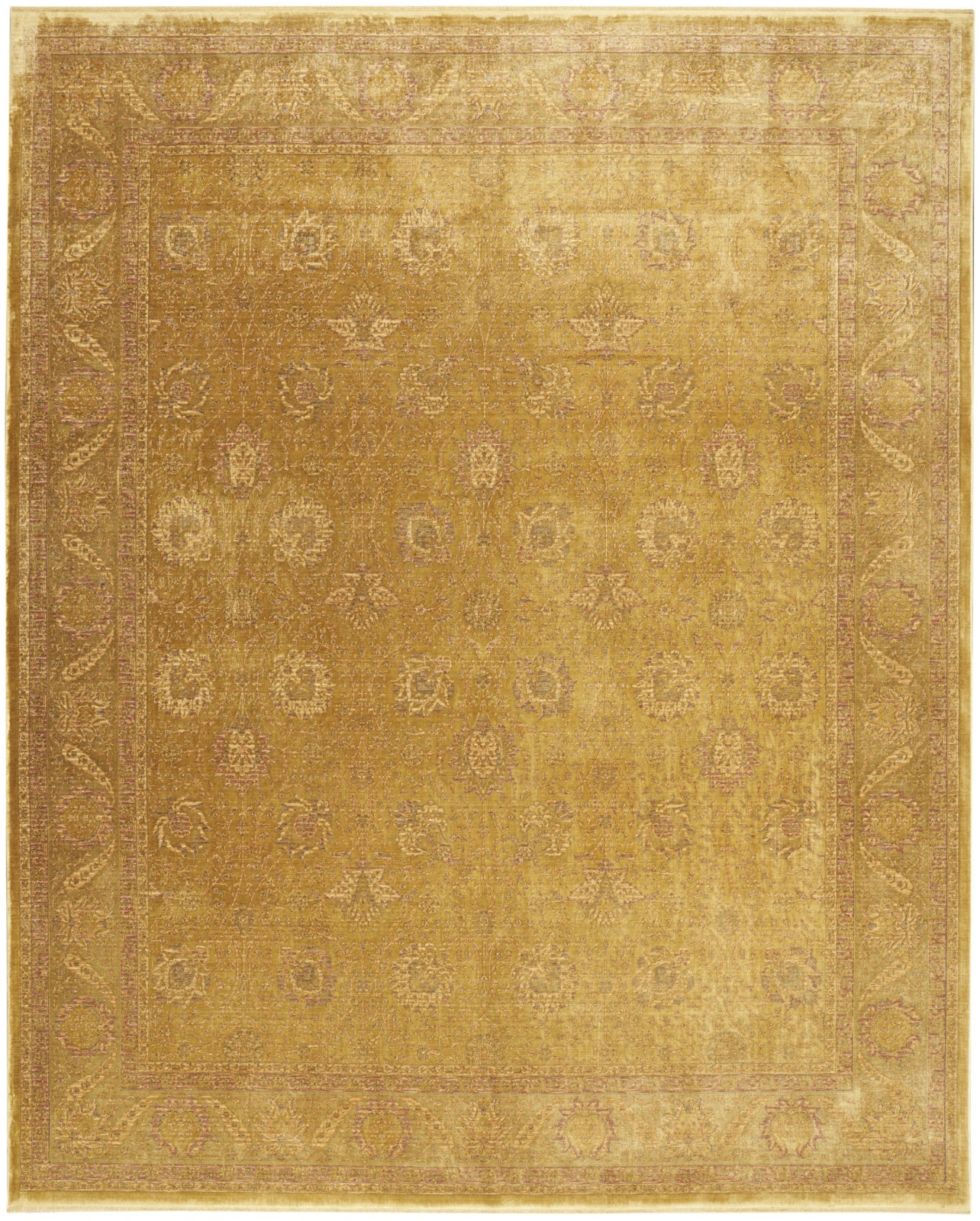 Lay out a slice of history, reimagined with this gold Persian style rug from the Luxurious Collection. The vintage-inspired floral pattern, made with a blend of stain-resistant silk-like yarns, faithfully channels the look and feel of a rug passed down over generations. Choose from a variety of sizes including 5x7 rugs for apartments and other small spaces, or large 8x10 and 9x12 rugs for the living room. Finished with an eye-catching sheen.