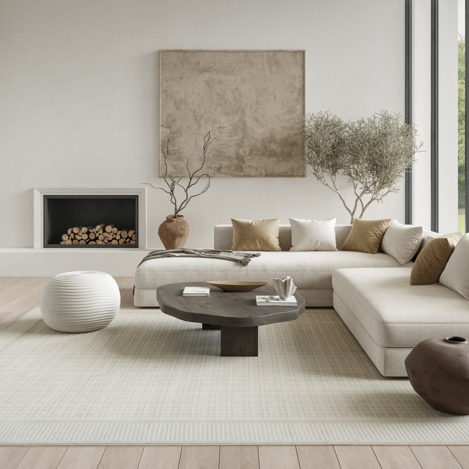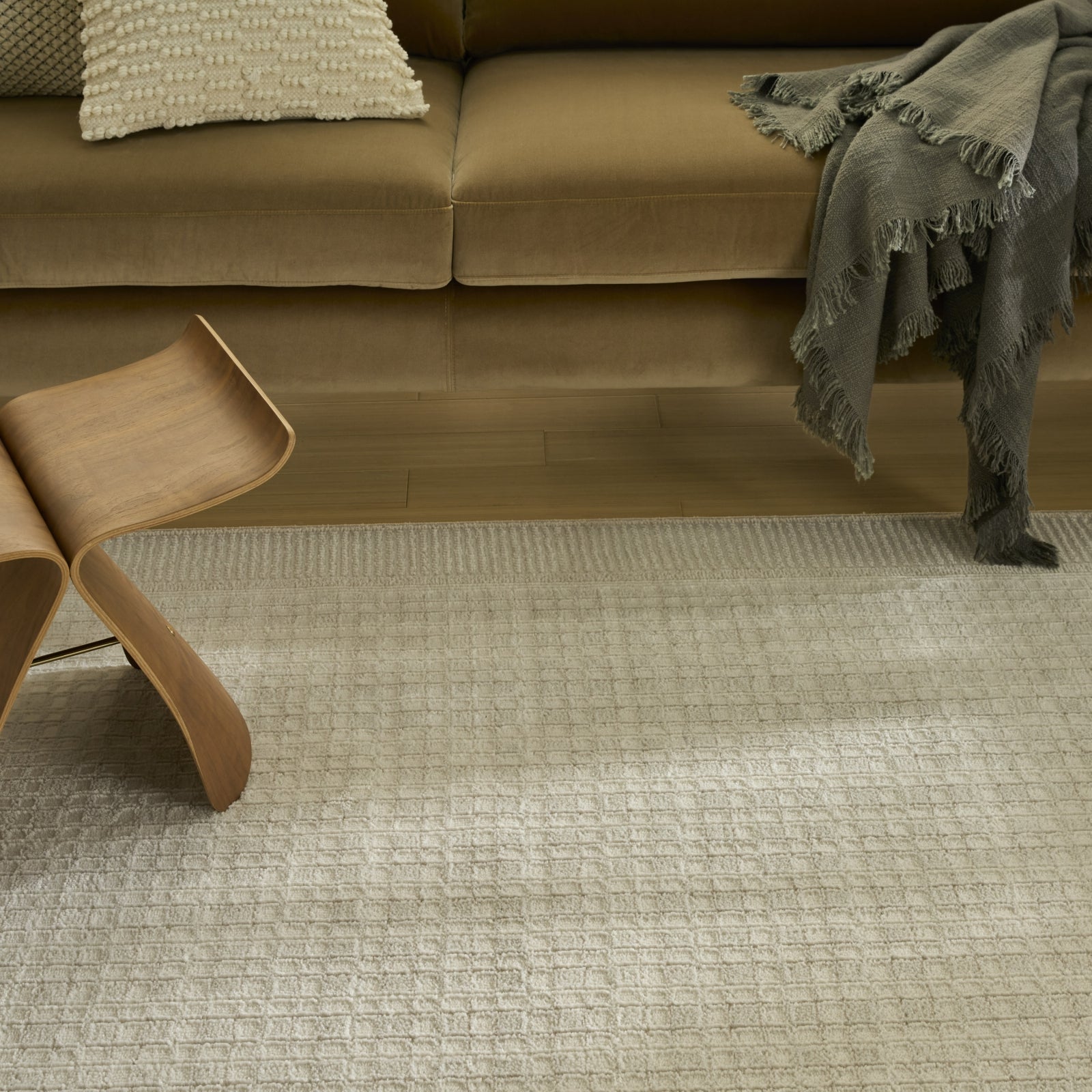 - Bring simple yet sophisticated style to your decor with this ivory geometric rug from the Nordic Collection. The tile-like pattern, framed by a linear double border, helps frame your furniture with ease. This modern rug has a silky sheen and high-low dimensional pile for added movement and depth.