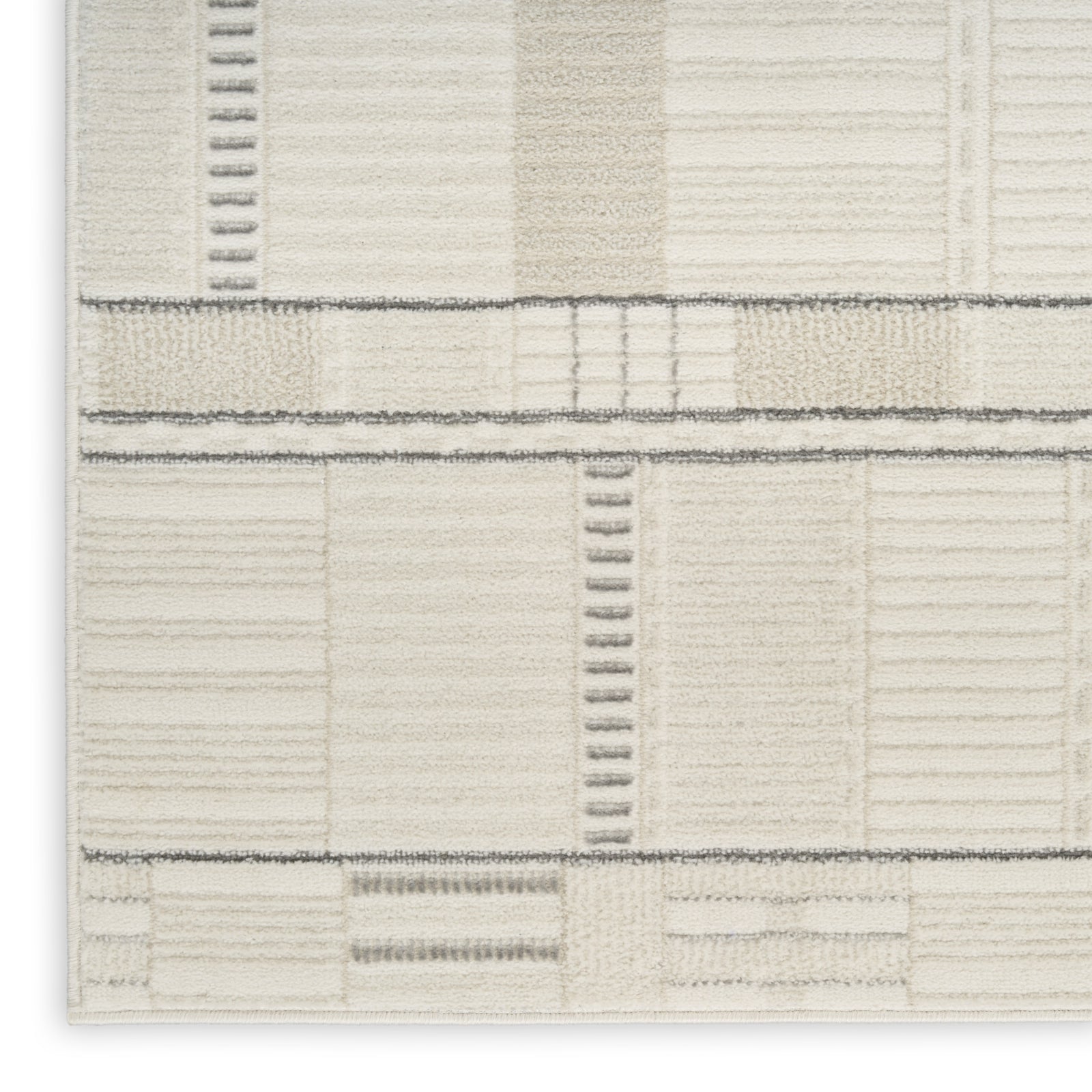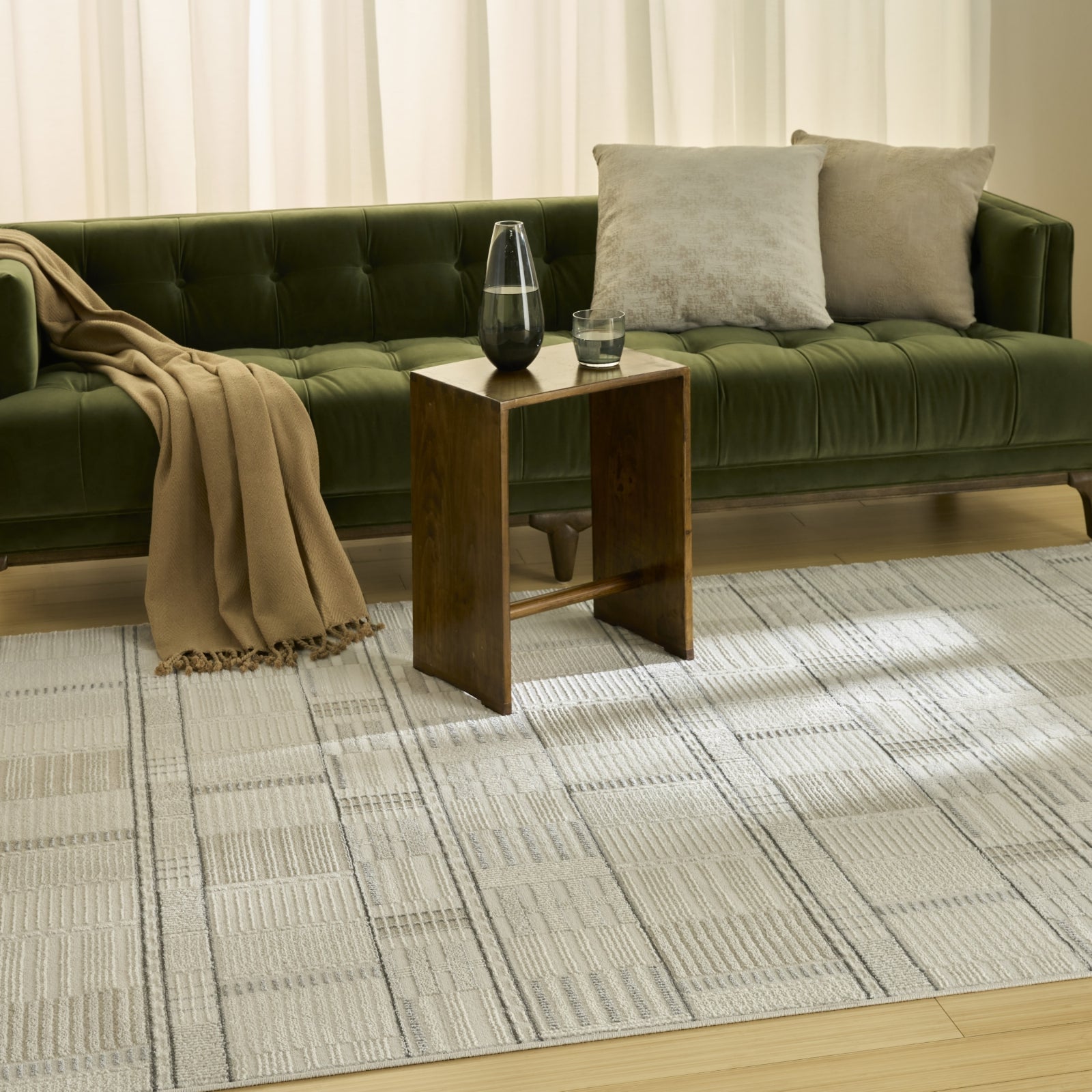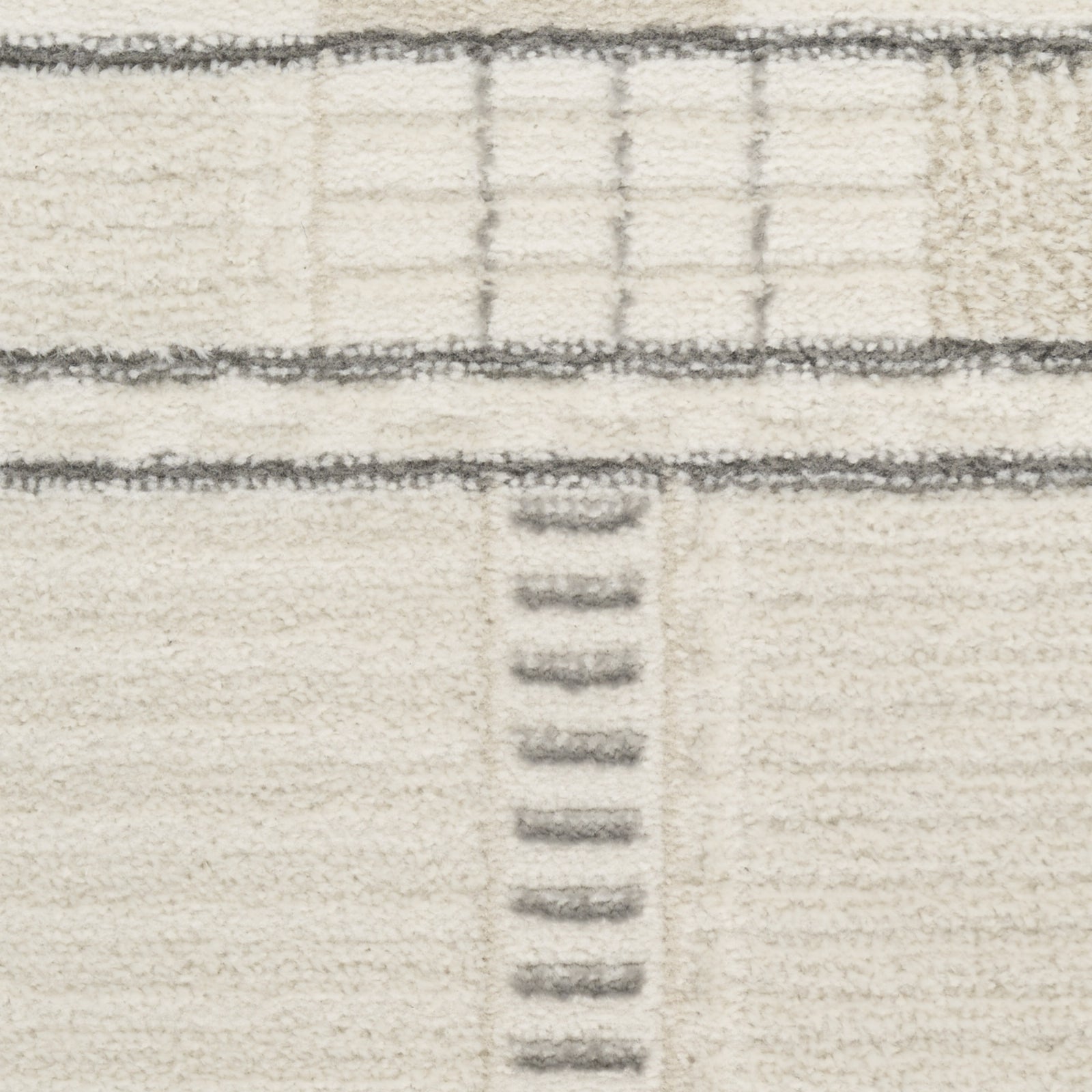 - Invite a touch of contemporary flair to your home with this grey and ivory geometric rug from the Nordic collection. The structured, block-like pattern creates a visually engaging foundation for your decor, enhanced by a high-low pile and subtle sheen for added dimension. Expertly crafted in a low-profile construction that's easy to clean - perfect for busy households with pets and young kids.