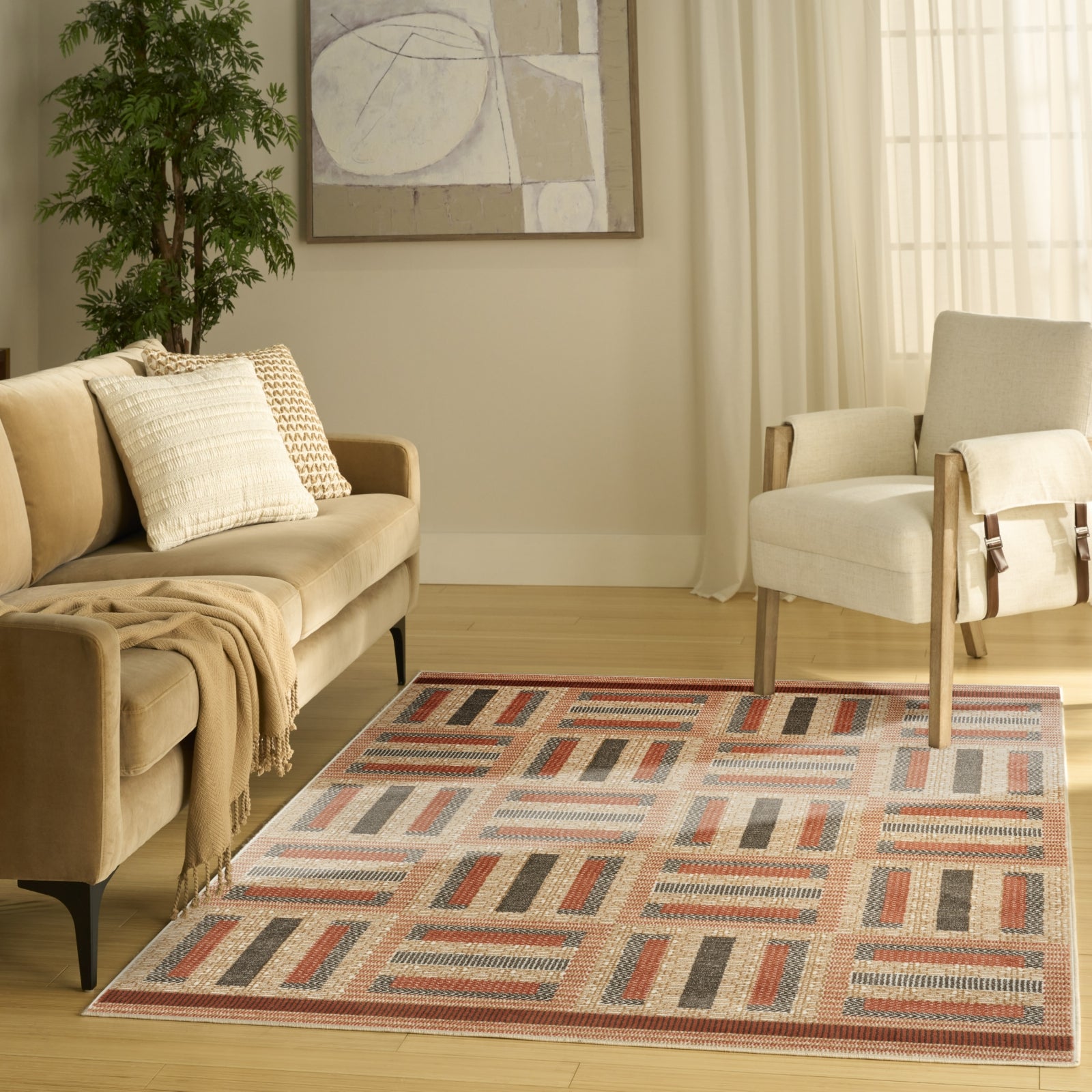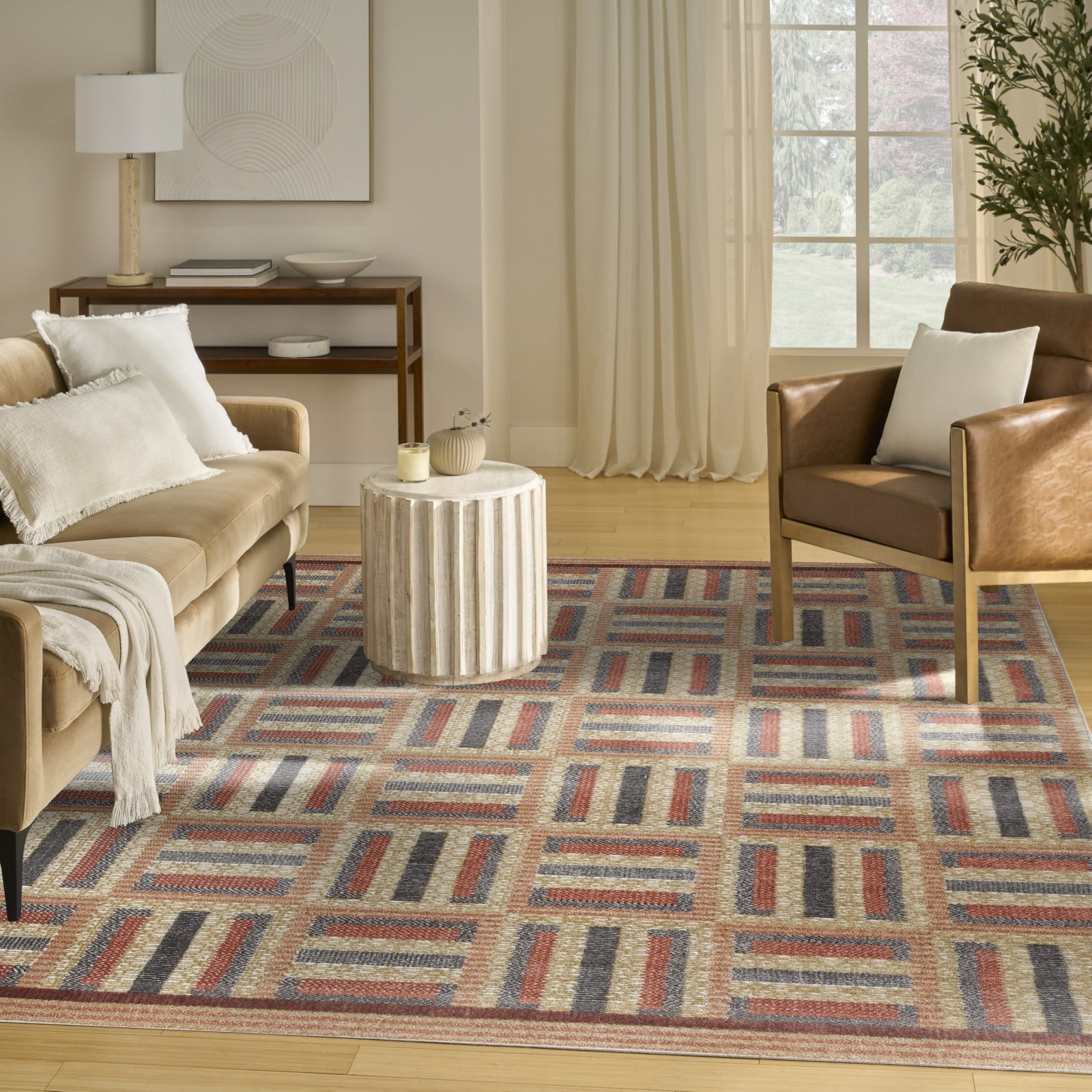 - Elevate your living space with this multicolored geometric rug from the Nordic collection. Showcasing a clean, minimalist pattern, this modern rug infuses a unique touch of elegance into any room. The subtle sheen and high-low dimensional pile create a visually dynamic texture designed to wow friends and family. Expertly crafted in a low-profile construction that's easy to clean - perfect for busy households with pets and young kids.