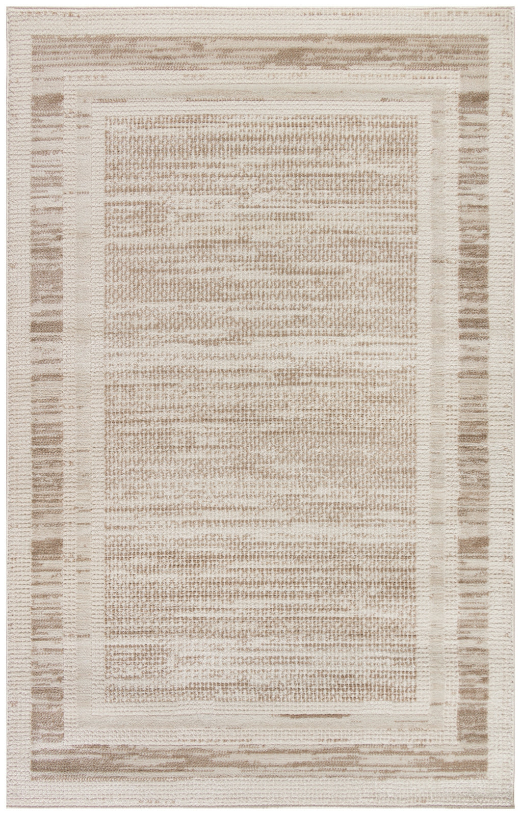 - Bring a modern spin to coastal style with this taupe geometric rug from the Serenity Home Collection. The classic double border design frames a heathered neutral ground, which is enhanced with a raised grid pattern that adds a unique pop of texture and dimension. This family-friendly rug is machine-made from a blend of durable polyester and polypropylene for soft comfort and easy cleaning.