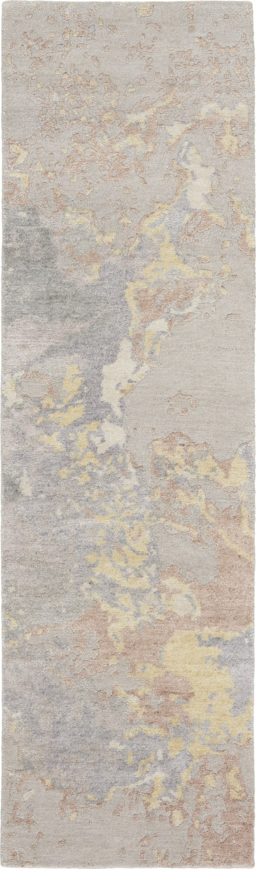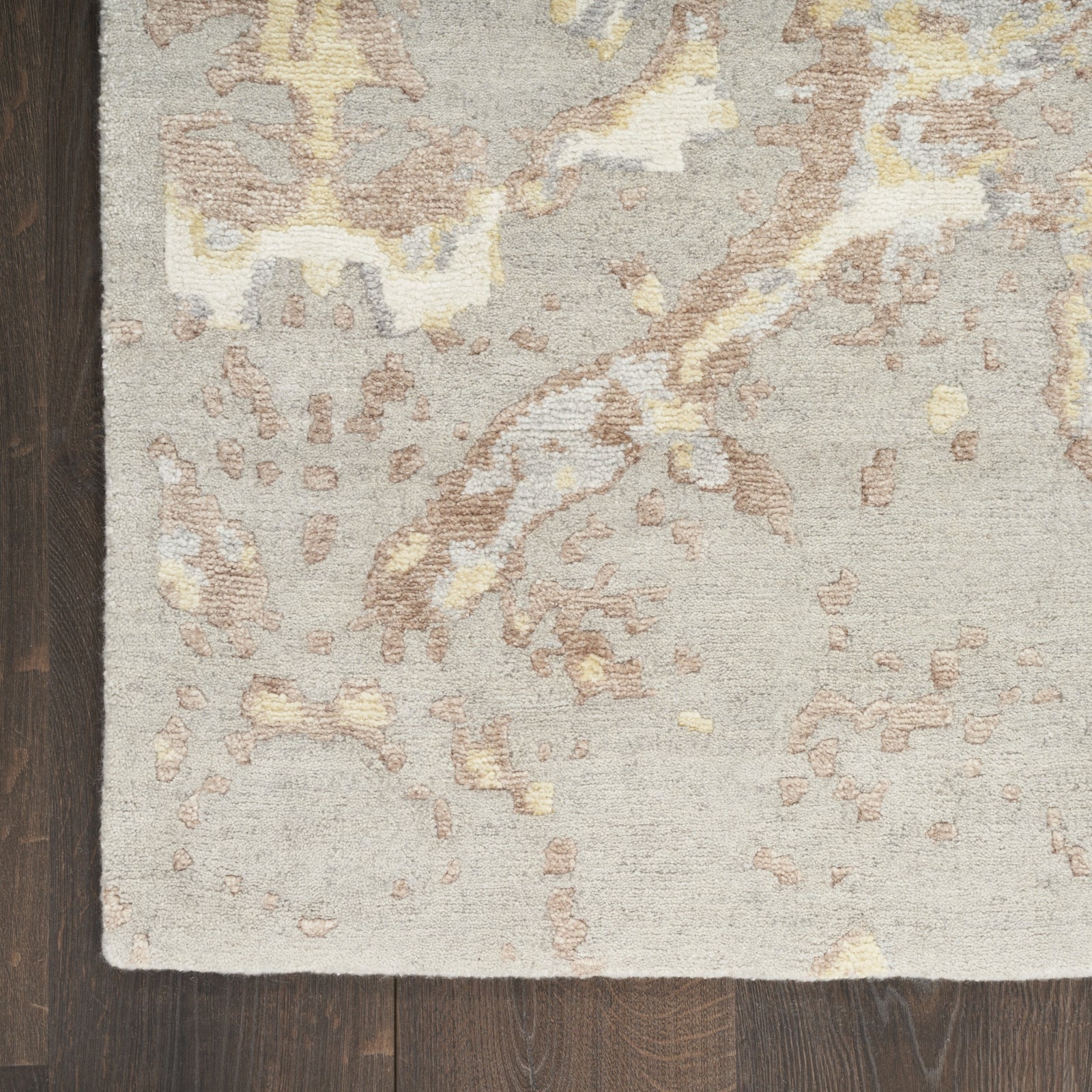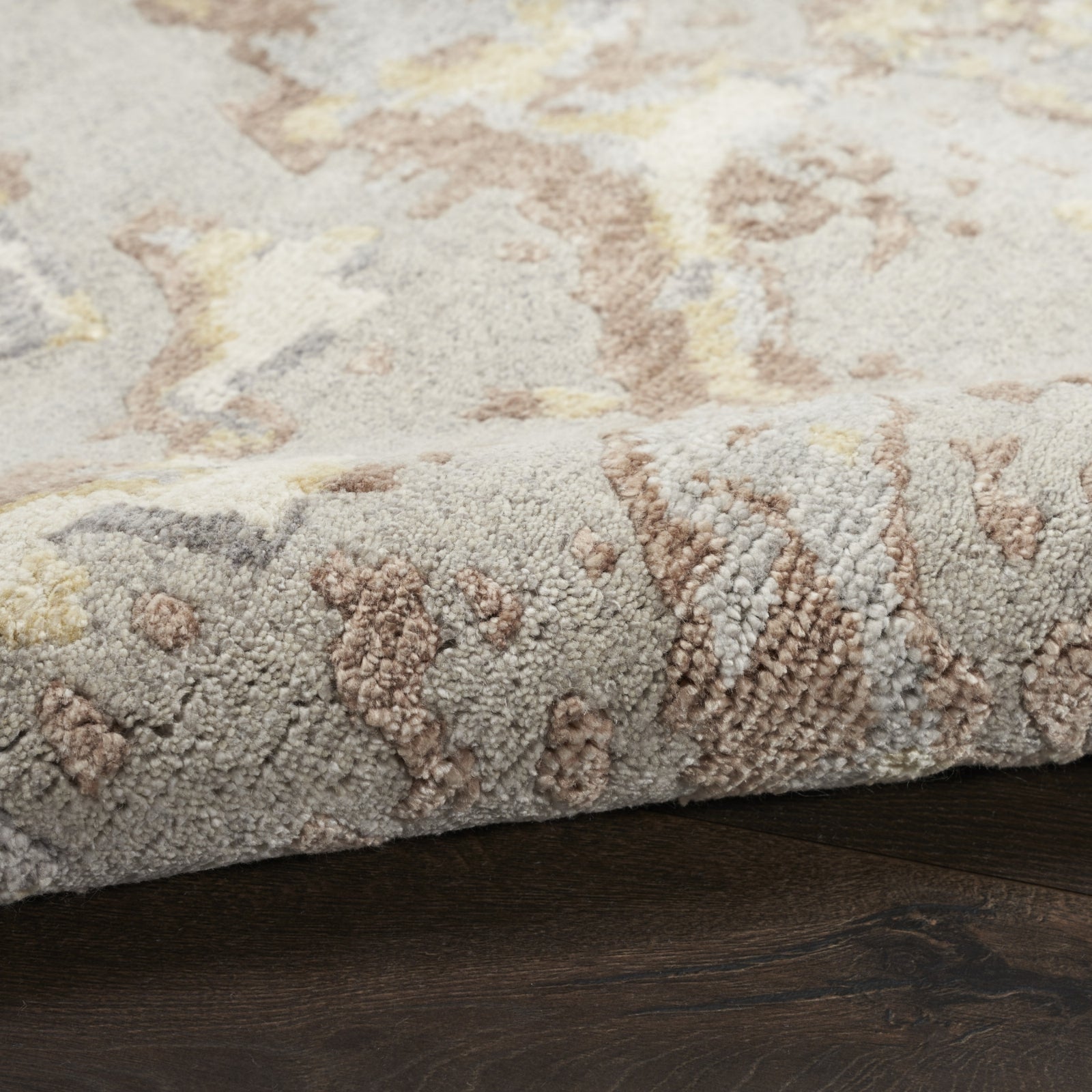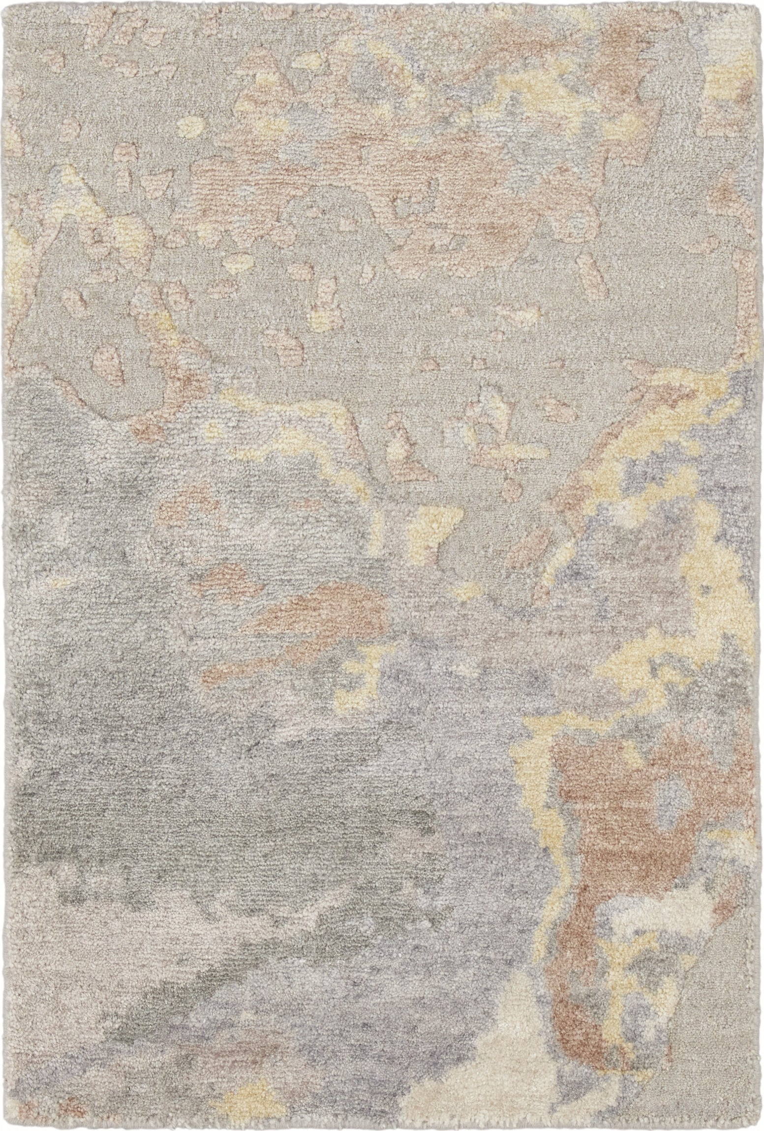 In a gorgeous interpretation of modern impressionist design, this Silk Shadows rug presents an abstract free-form design in dramatic shades of grey, gold, brown, and ivory. Hand-knotted from a premium blend of New Zealand wool and silk-like bamboo fibers, with carved accents that add a subtle layer of dimension.