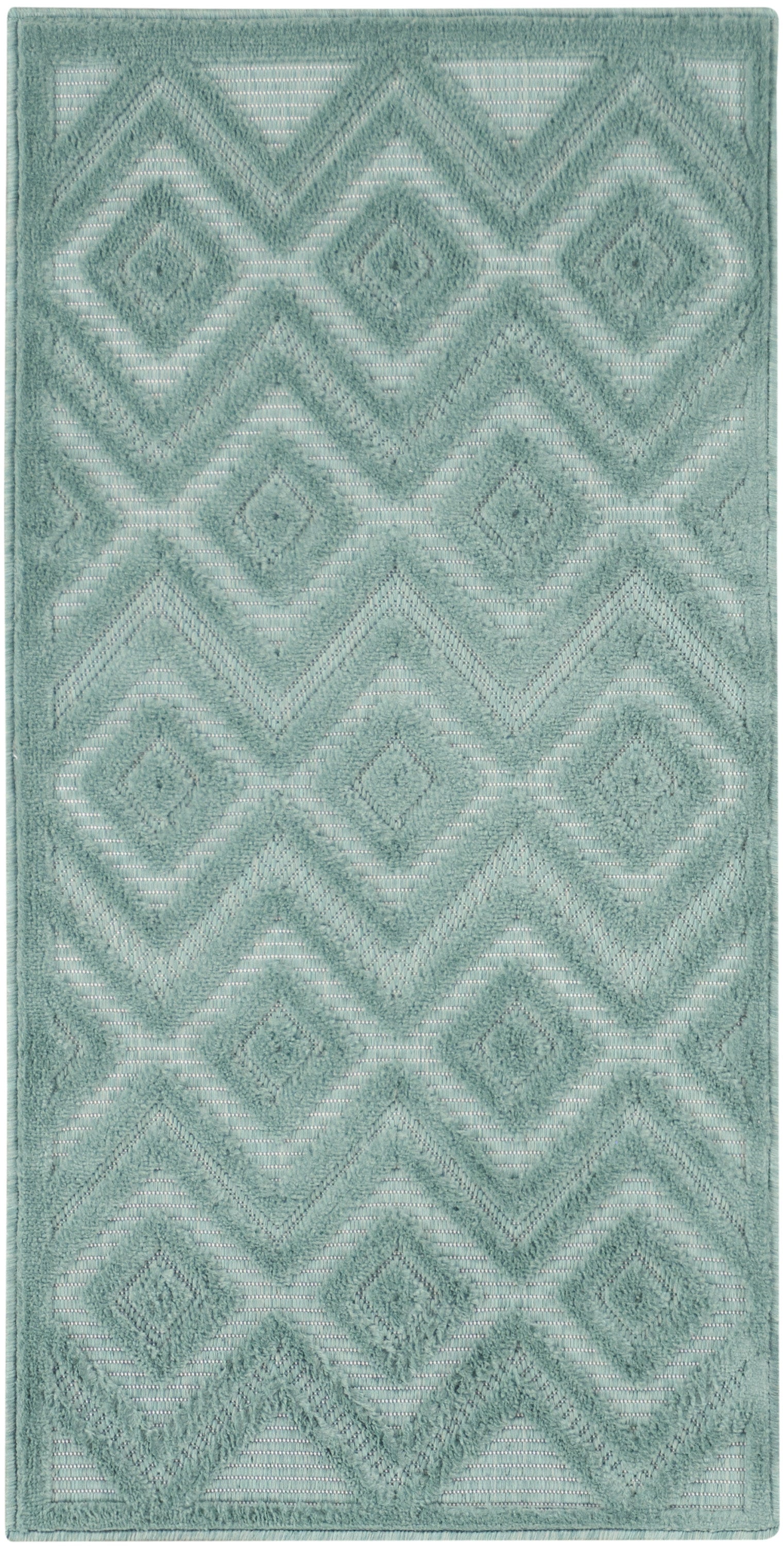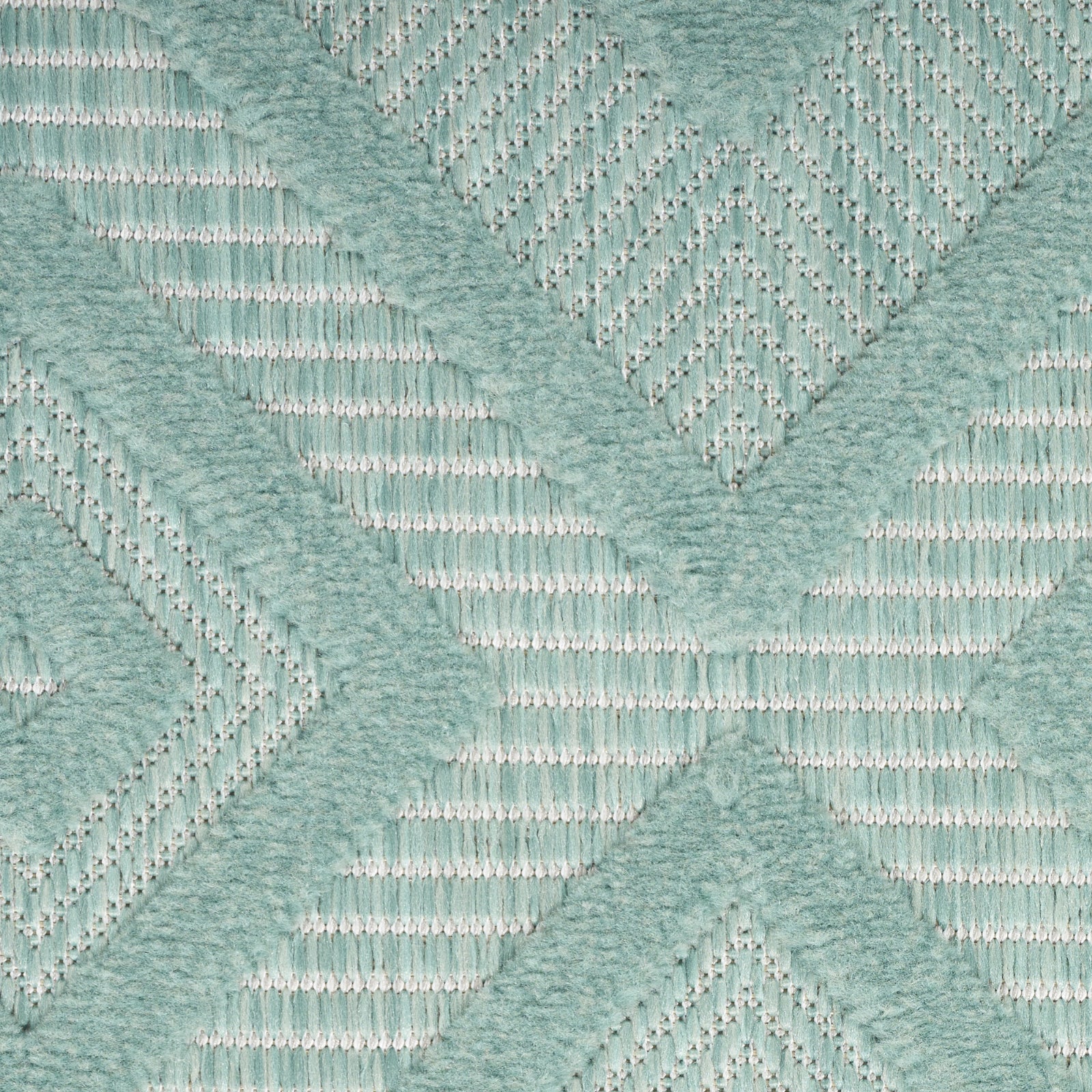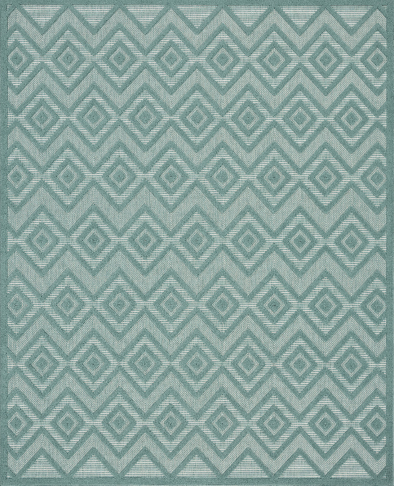 - This aqua blue and teal Nourison Versatile Collection rug brings inviting style to your favorite indoor or outdoor space. With a raised diamond design that stands out beautifully against its flatwoven ground, this outdoor rug enhances your space with delightful texture and modern appeal. Machine-made from durable, easy-to-clean fibers, Versatile is great for high-traffic areas inside the home as well as all seasons spent outdoors. To care for this rug, we recommend rinsing outdoors with a hose. Air dry both sides fully- do not place into a washing machine.