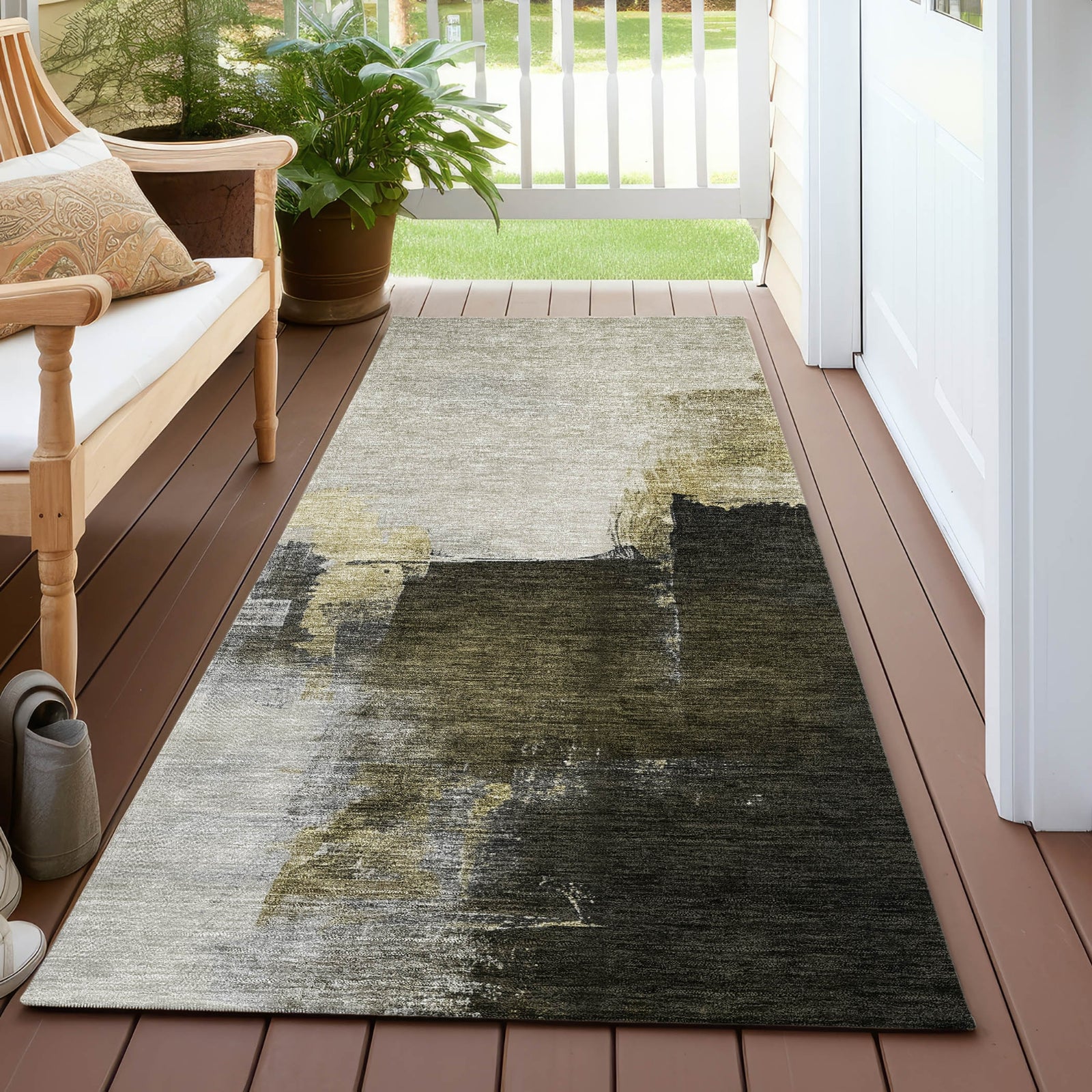Step into contemporary elegance with our chic area rug, showcasing a stacked color palette that creates a textured effect, perfect for transitional and abstract decor. Meticulously crafted, this rug adds a touch of sophistication to any room with its unique design. UV stabilized for both indoor and outdoor use, it retains its vibrant colors over time. Its ultra-thin construction adds a sleek and modern touch to your decor while offering versatility in placement. With machine-washable features, maintaining the rug is simple, ideal for busy households. And, it's family and pet-friendly, providing a cozy and resilient surface for everyone to enjoy.