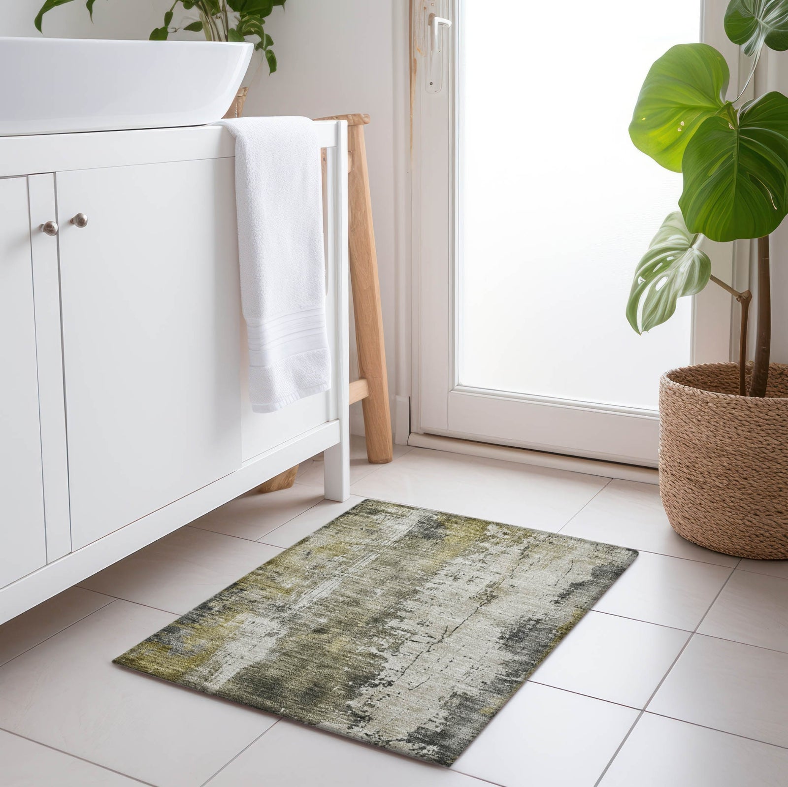 This area rug showcases a soft abstract design with distressed waves, introducing a calm and modern touch to your transitional decor. The flowing wave pattern adds a sophisticated and relaxed feel to any room, blending effortlessly with various styles. Its abstract design provides a serene visual effect that enhances your space. UV stabilized to ensure long-lasting color and performance both indoors and outdoors, it maintains its gentle hues over time. The ultra-thin profile offers a sleek, elegant finish, and the rug is machine-washable for easy care. Ideal for families and pets, it combines artistic charm with practical functionality.