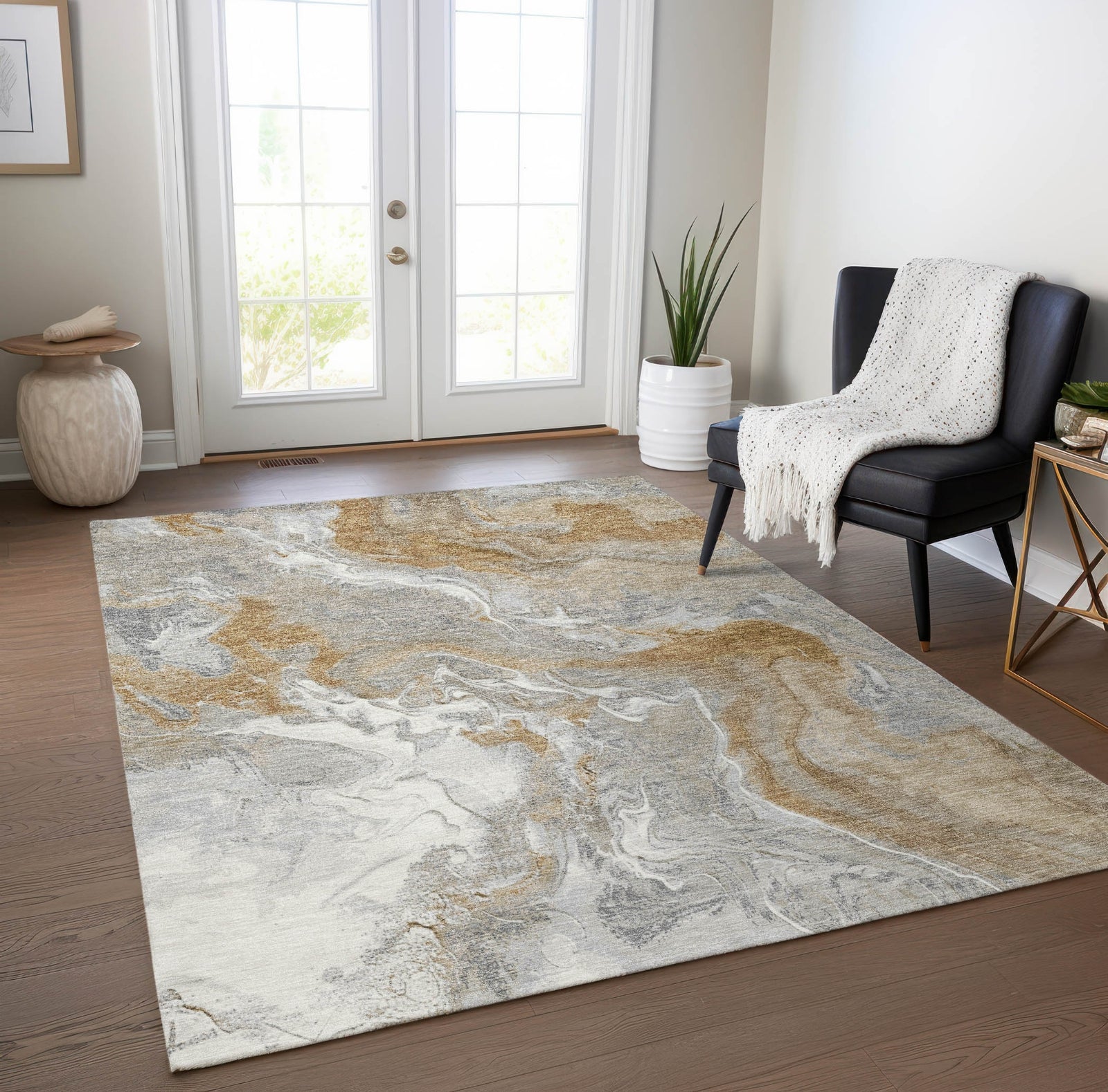 This area rug features an abstract pattern with vibrant splashes of colors and a watercolor effect, adding a dynamic artistic element to any transitional room. The fluid design seamlessly integrates bold and subtle hues, offering a modern touch that complements both contemporary and traditional styles. Its abstract pattern provides visual interest and enhances the overall aesthetic of your space. UV stabilized to withstand both indoor and outdoor conditions, it ensures lasting color and durability. The ultra-thin profile offers a sleek, refined look, and the rug is machine-washable for easy upkeep. Ideal for families and pets, it combines design appeal with practical functionality.