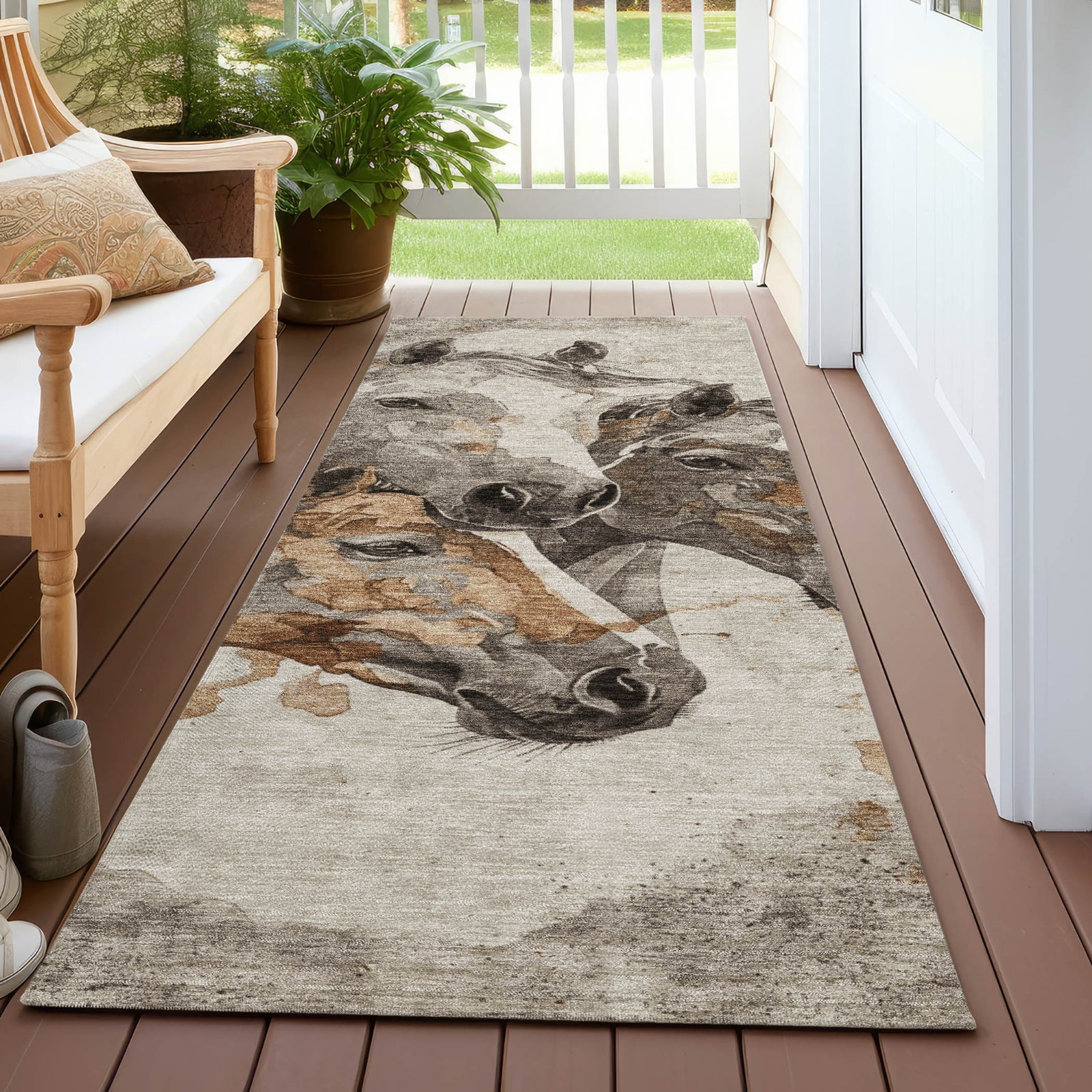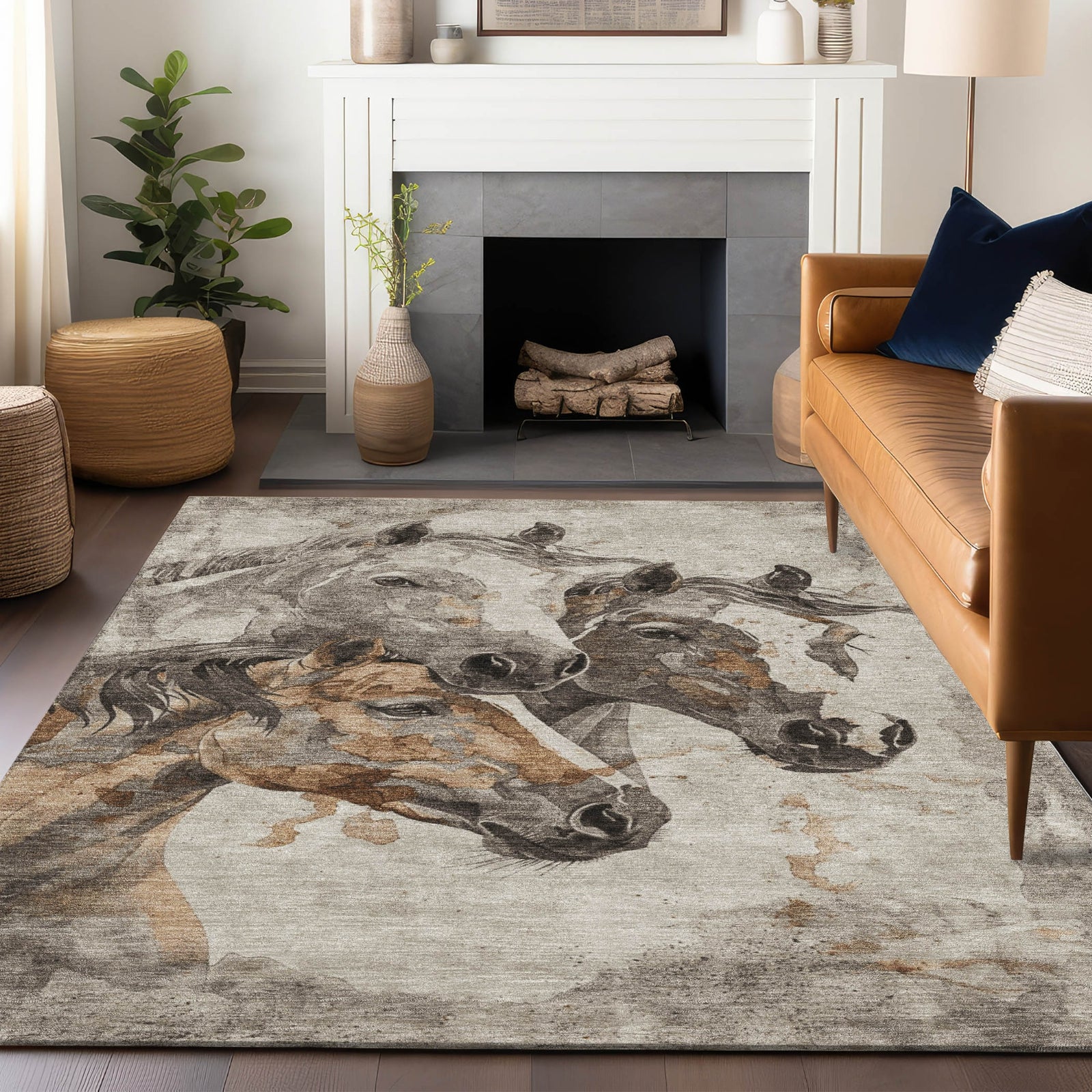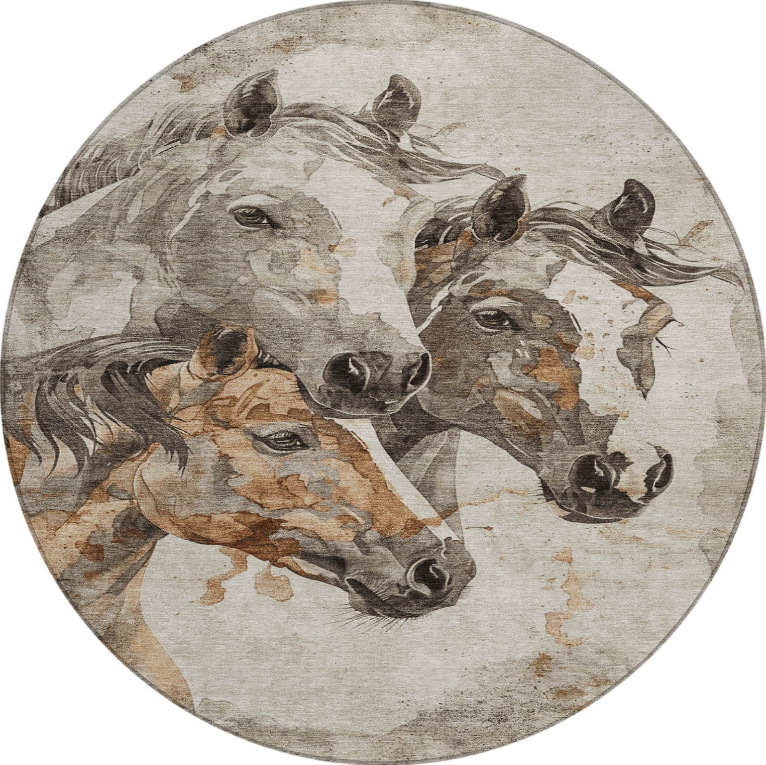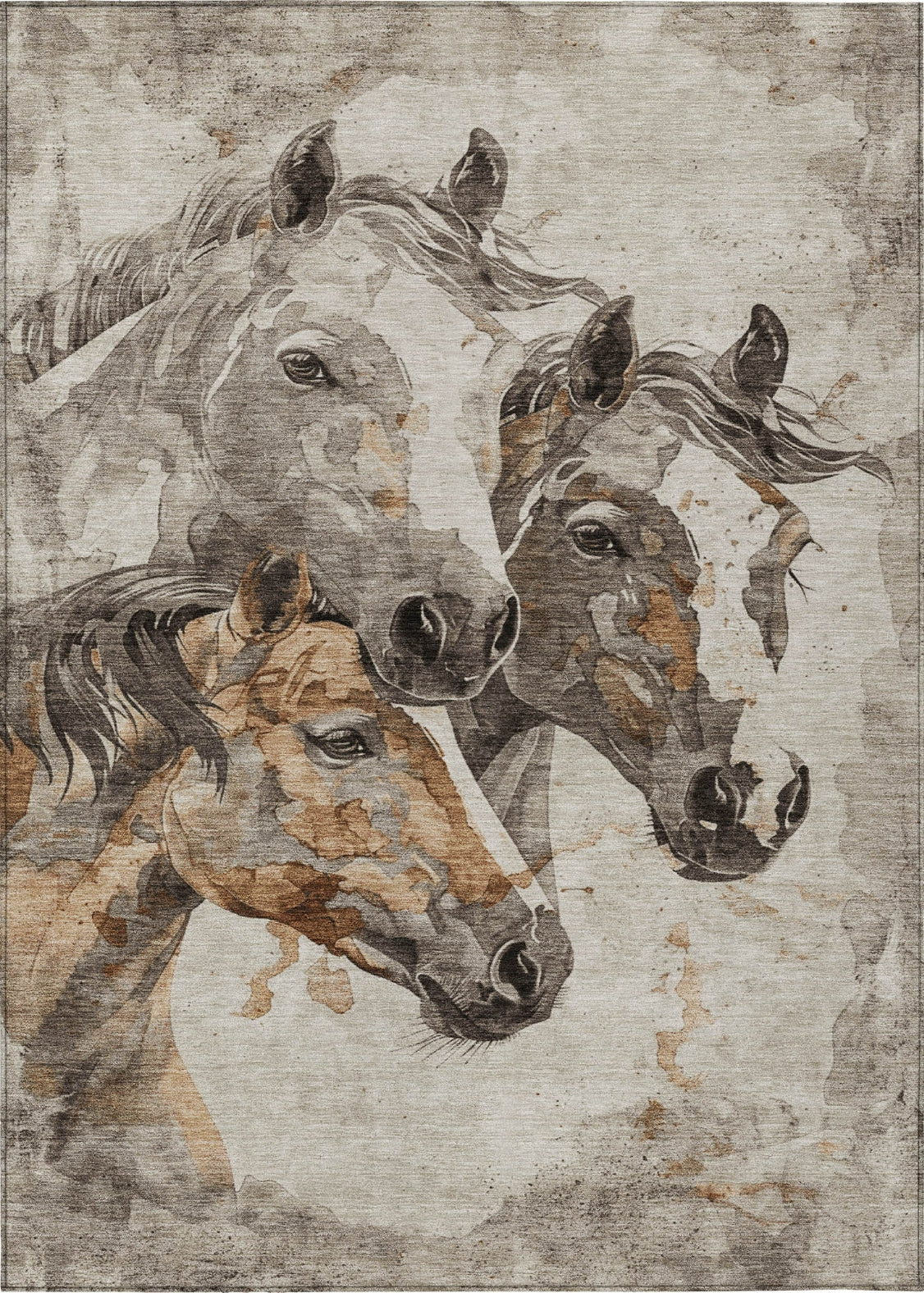 With three horse heads rendered in a distressed pattern, this rug brings a touch of transitional elegance to any interior. The intricate, aged design of the horses enhances the rug's visual appeal, fitting seamlessly with contemporary styles. Its durable construction and low-maintenance qualities ensure lasting beauty and practicality.