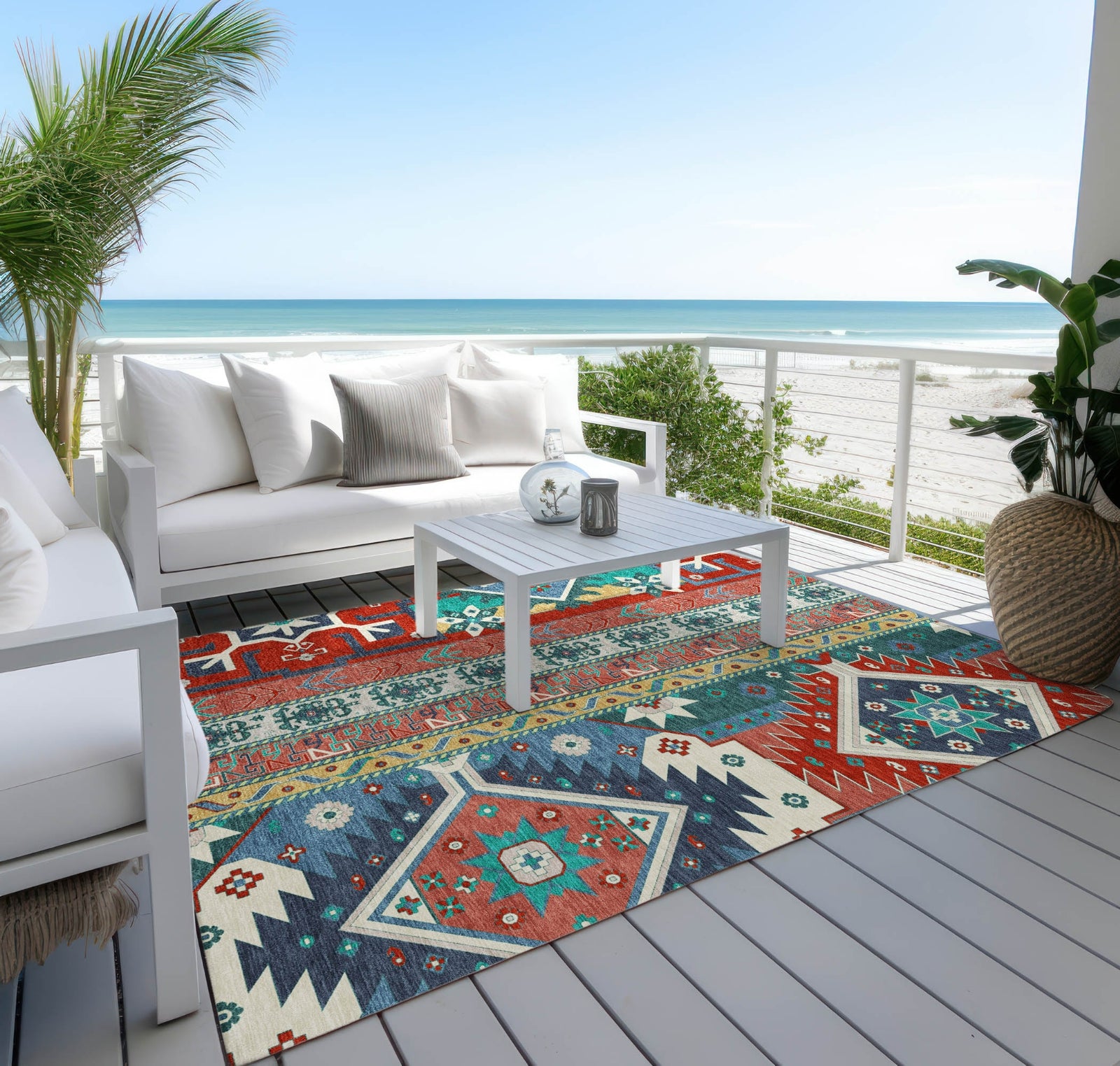 Our Aztec-inspired area rug, with its delightful boho flair and transitional design, will instantly enhance the look of your living space. This rug is not only a decorative piece but also built to last, UV stabilized to protect against sun damage whether used indoors or outdoors. The ultra-thin construction ensures it fits easily anywhere in your home, and it's machine-washable for easy care. Plus, it's designed to be both family and pet friendly, making it a practical choice for any household.