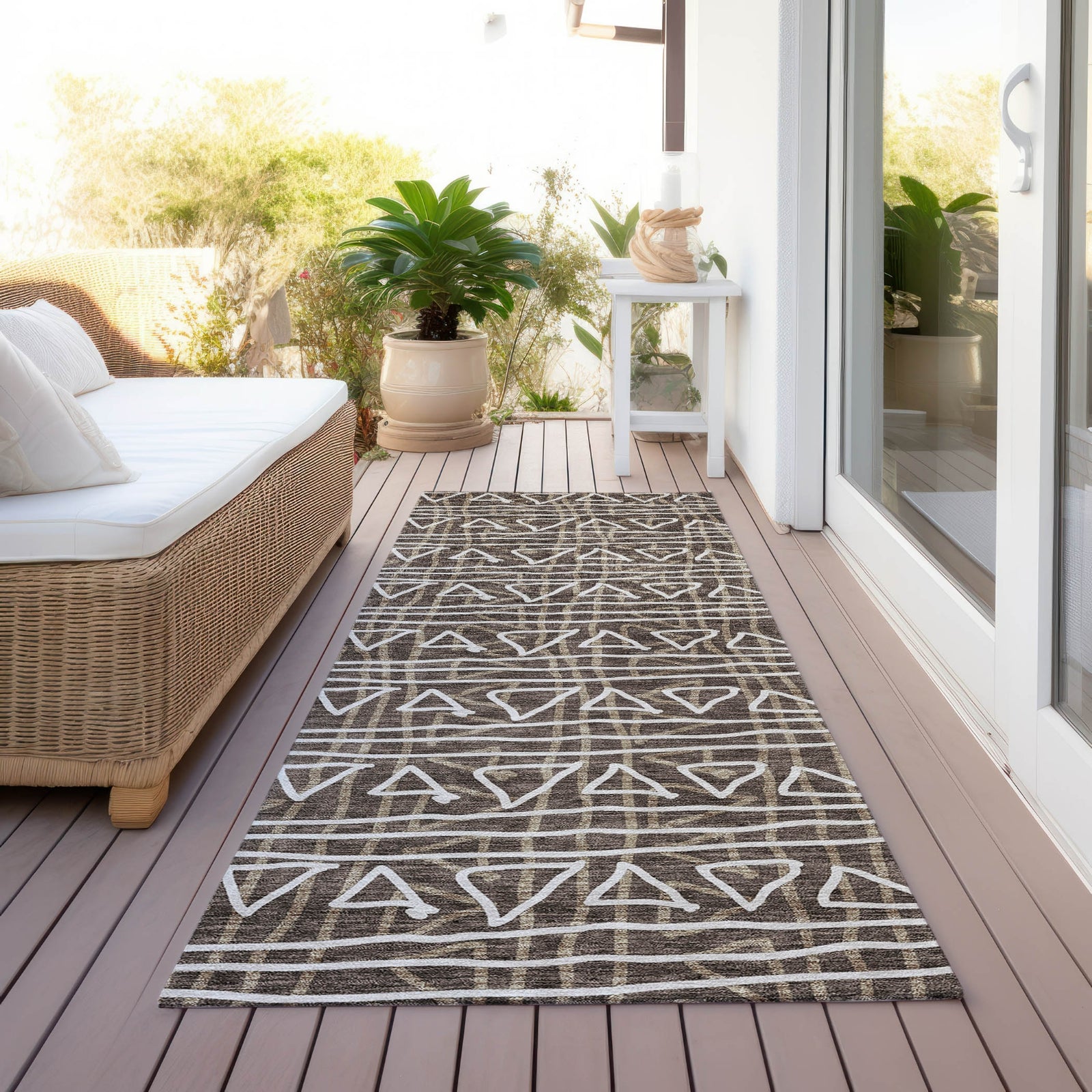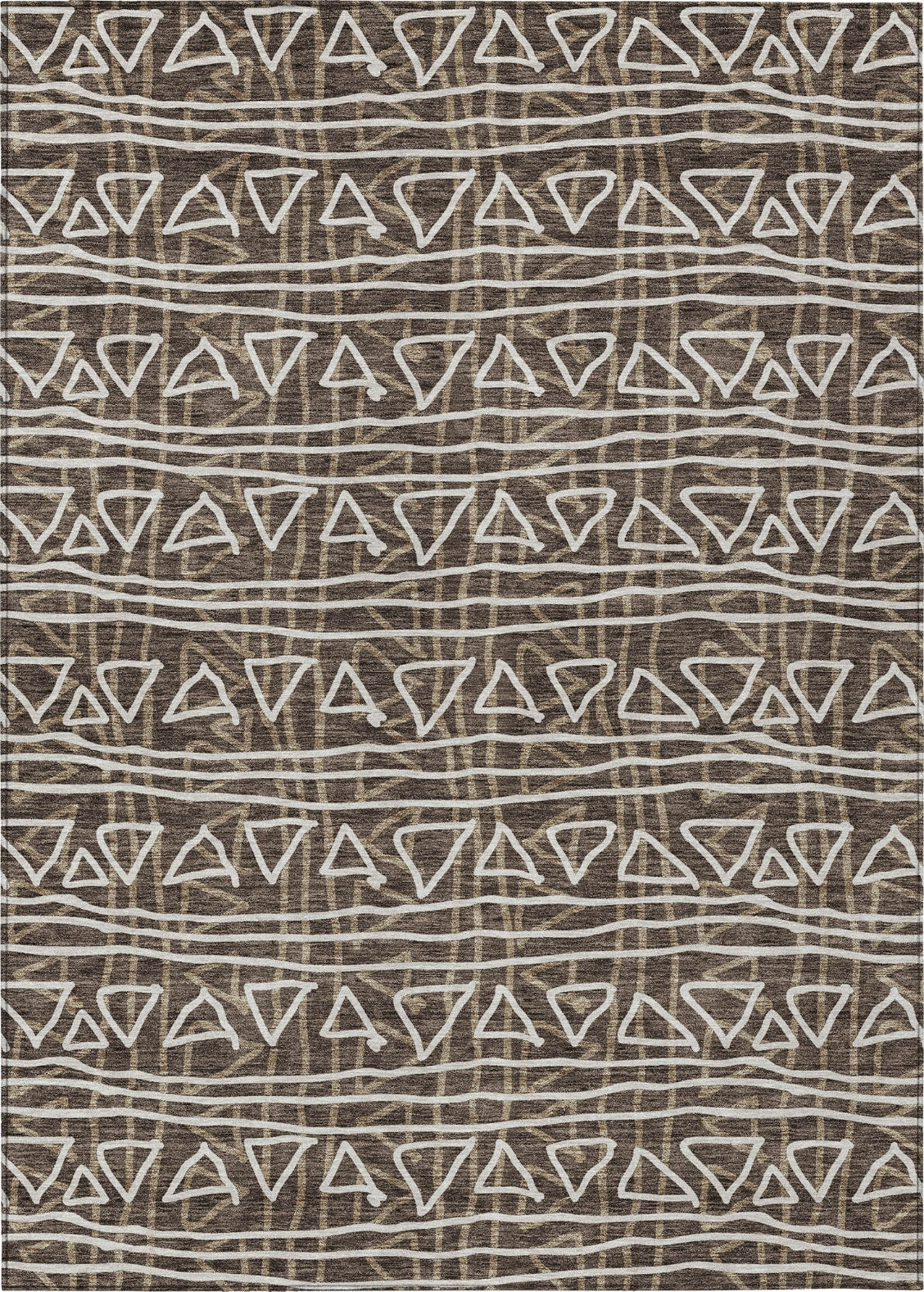 Our area rug showcases the simplicity and elegance of hand-drawn stripes and triangles, forming a striking transitional bohemian pattern. Crafted for your lifestyle, it's UV stabilized for any setting, ultra-thin for easy integration, machine-washable for straightforward upkeep, and ideal for households with kids and pets.