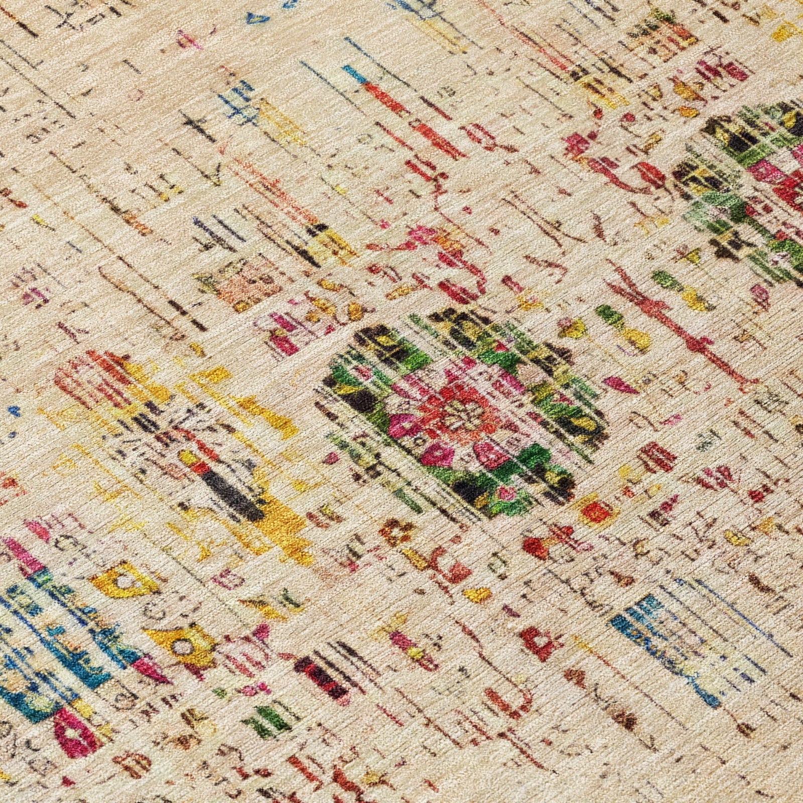 Smaller scaled medallions sit within a bordered design on this rug, offering a detailed yet structured look. The medallions bring a touch of intricacy, while the border provides a polished finish, making the rug feel balanced and refined. Its transitional style and bordered pattern offer the perfect mix of contemporary and traditional design. This UV-stabilized rug is designed for both indoor and outdoor use, with an ultra-thin construction that makes it easy to manage and maintain. Machine-washable for convenience, it's also family and pet-friendly, ensuring it holds up to daily traffic and activity. Bring effortless style and durability to your space with this versatile rug.