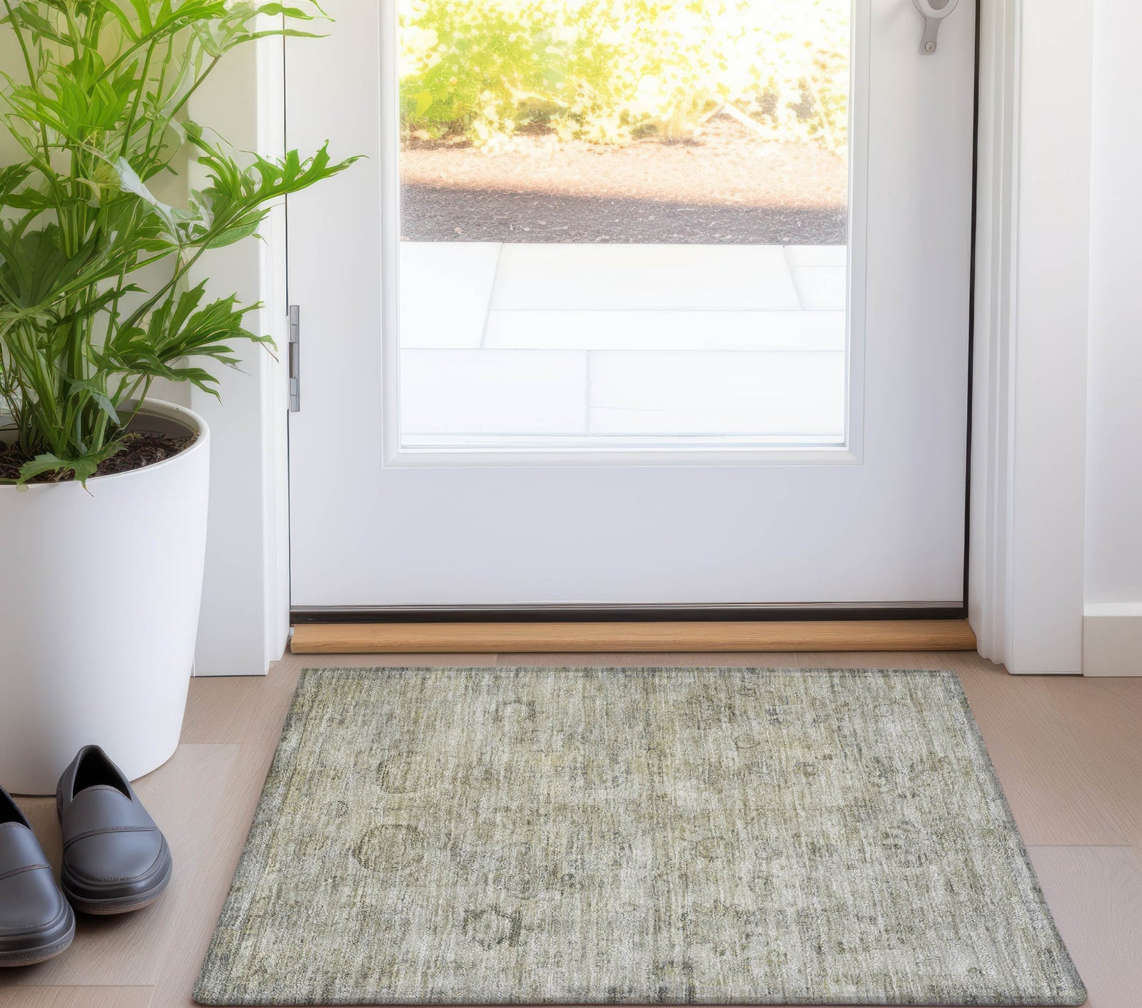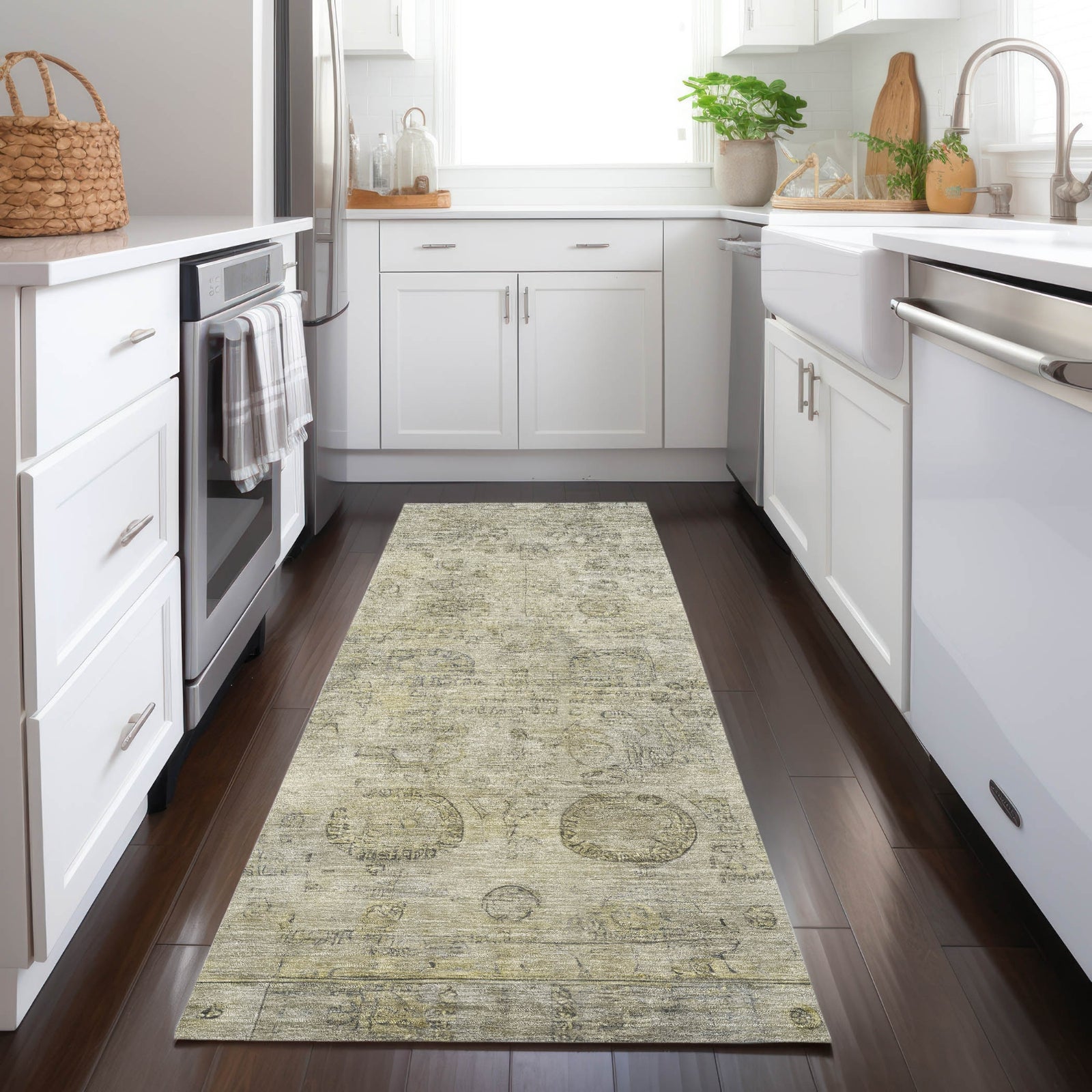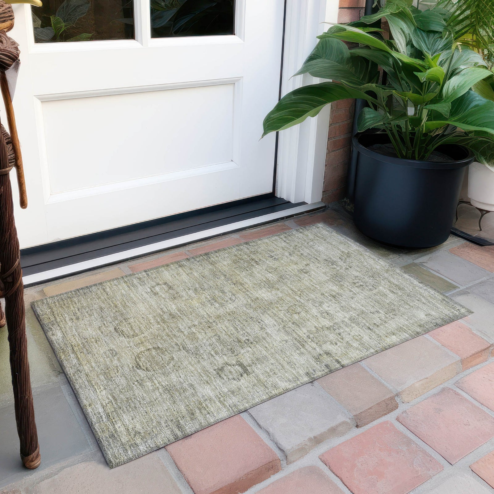 A distressed border surrounds the global motifs of this rug, offering a sense of timelessness and character. The intricate designs add a layer of cultural richness, while the faded edges give it a soft, relaxed feel. With its transitional style, this rug is ideal for spaces that embrace both traditional and modern elements. This UV-stabilized rug is designed for both indoor and outdoor use, with an ultra-thin construction that makes it easy to manage and maintain. Machine-washable for convenience, it's also family and pet-friendly, ensuring it holds up to daily traffic and activity. Bring effortless style and durability to your space with this versatile rug.