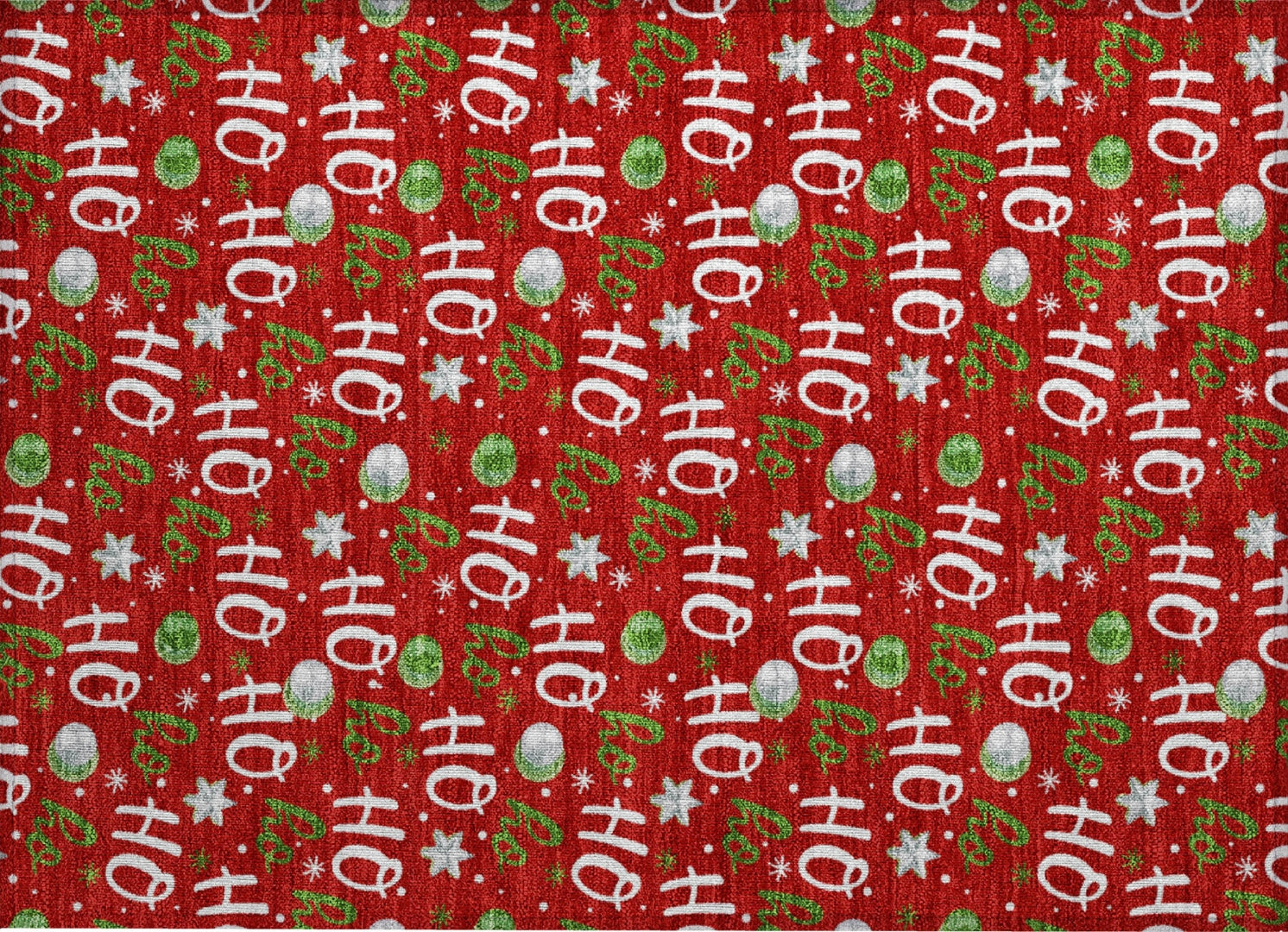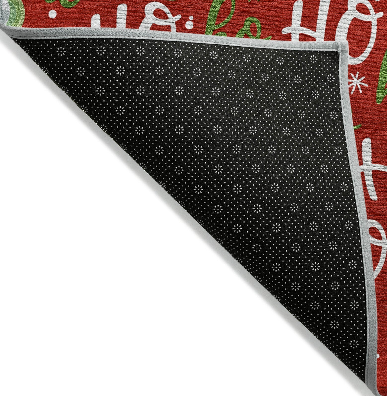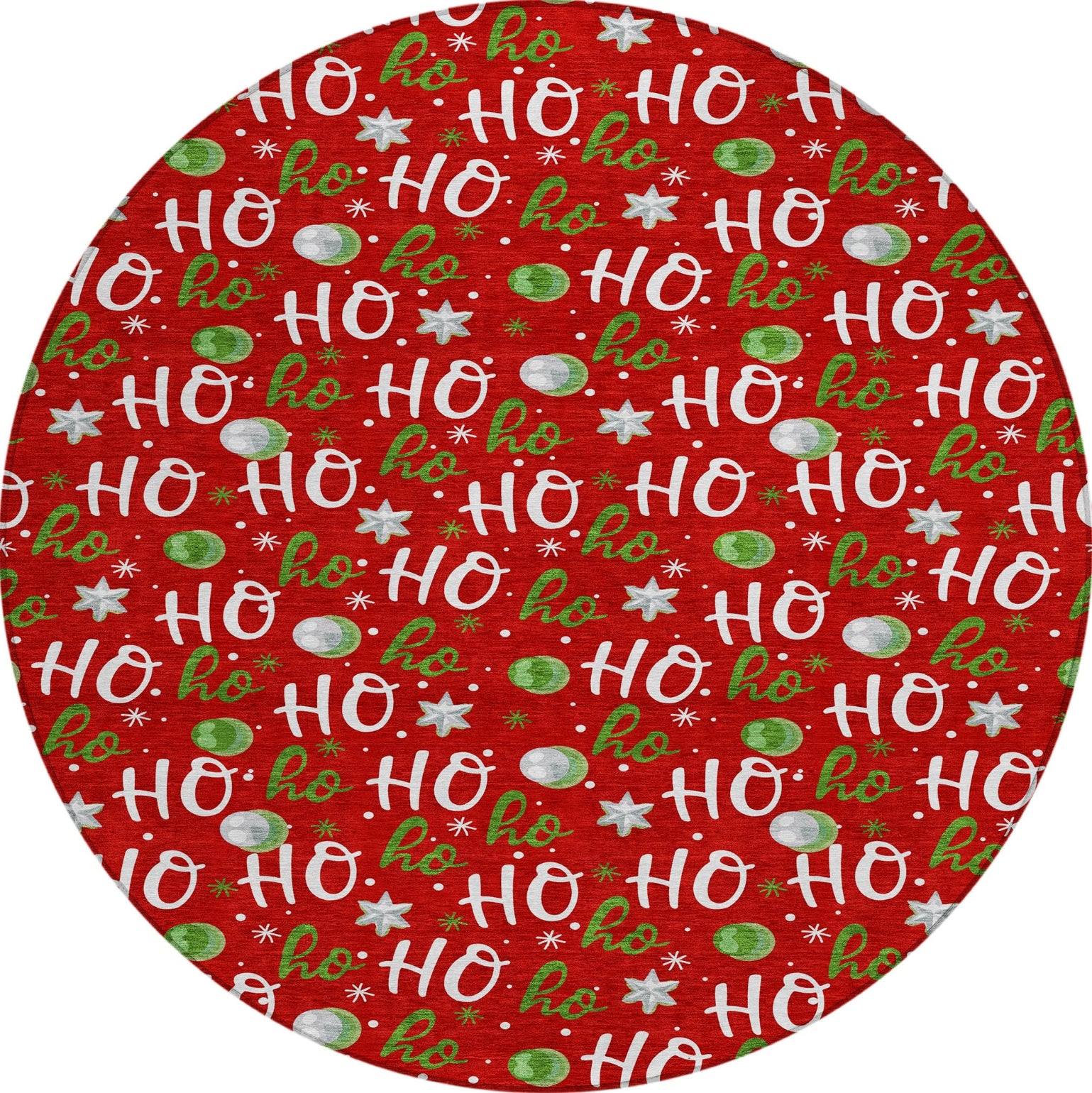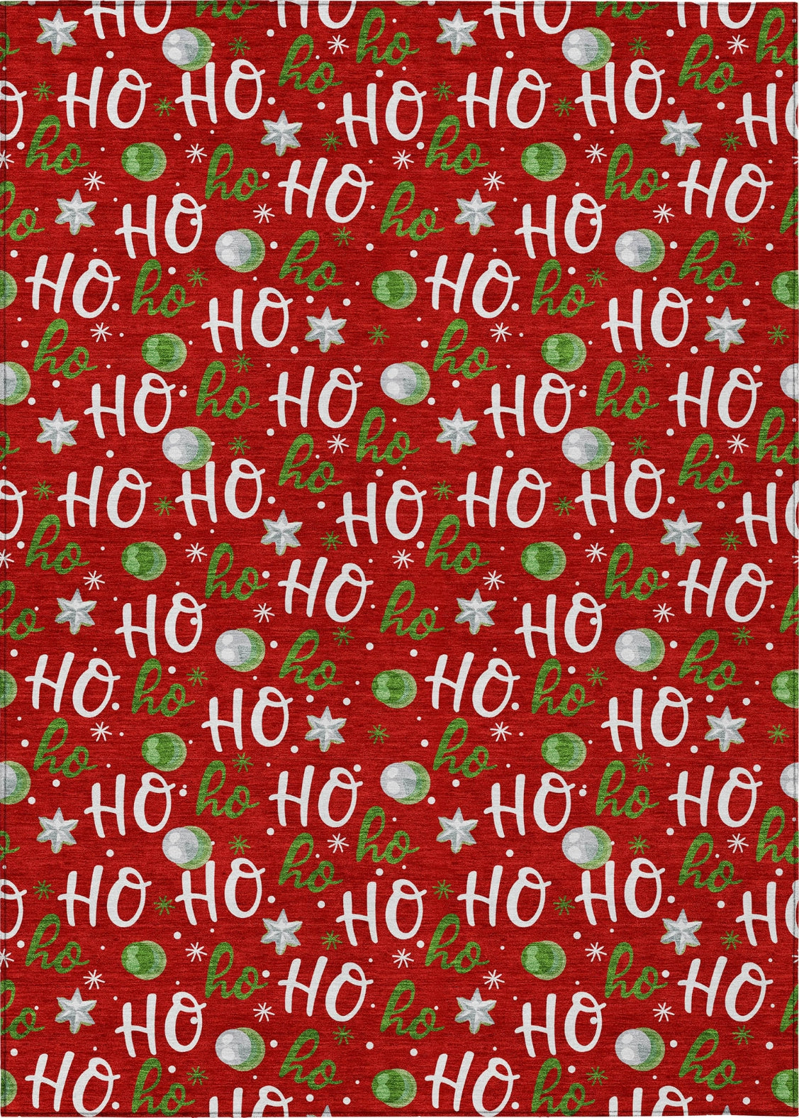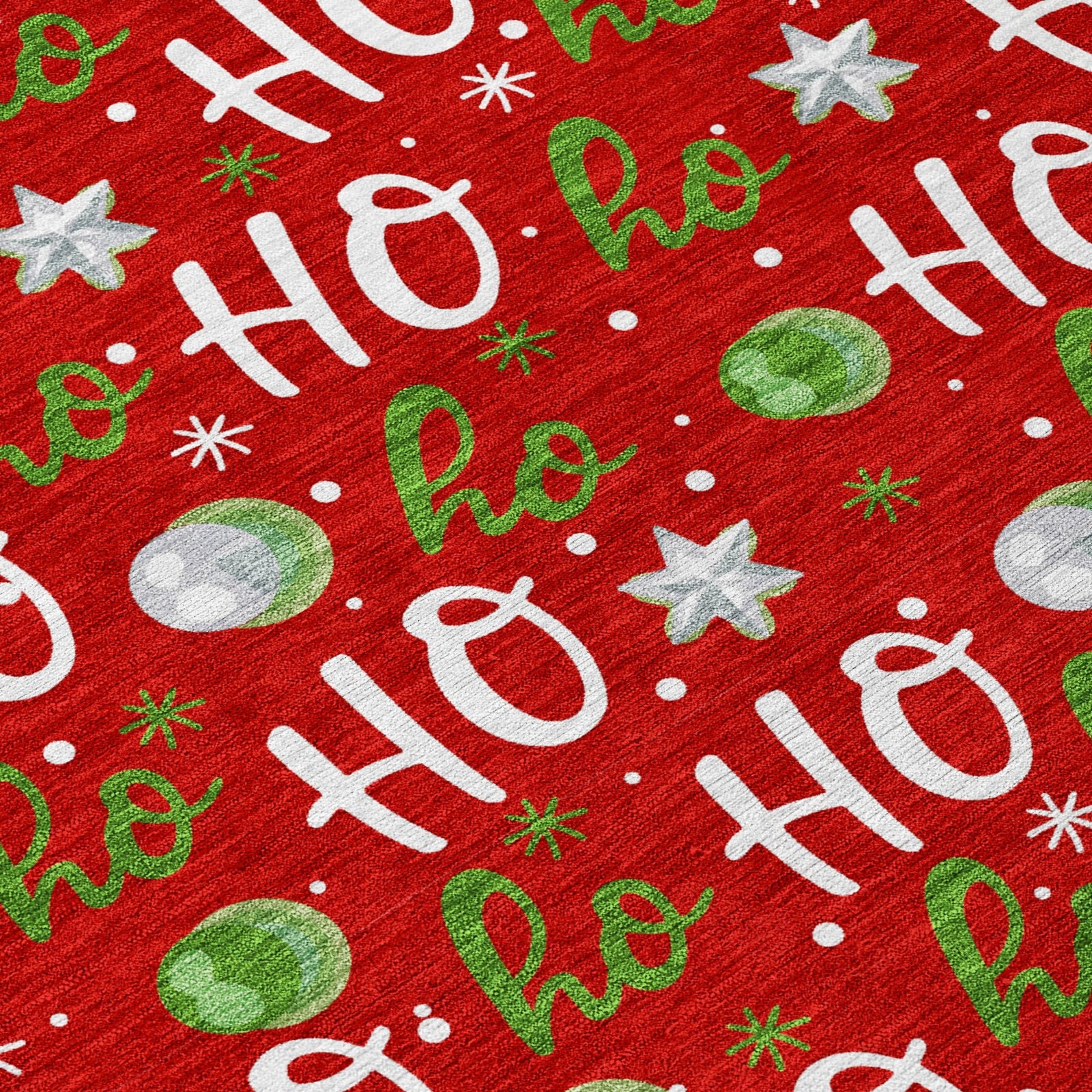 Vibrant ornaments and ''''Ho Ho Ho'''' lettering adorn this rug, adding a touch of festive charm to your holiday decor. The transitional style makes it a perfect fit for both classic and modern spaces, bringing warmth and cheer to any room. This UV-stabilized rug is designed for both indoor and outdoor use, with an ultra-thin construction that makes it easy to manage and maintain. Machine-washable for convenience, it's also family and pet-friendly, ensuring it holds up to daily traffic and activity. Bring effortless style and durability to your space with this versatile rug.
