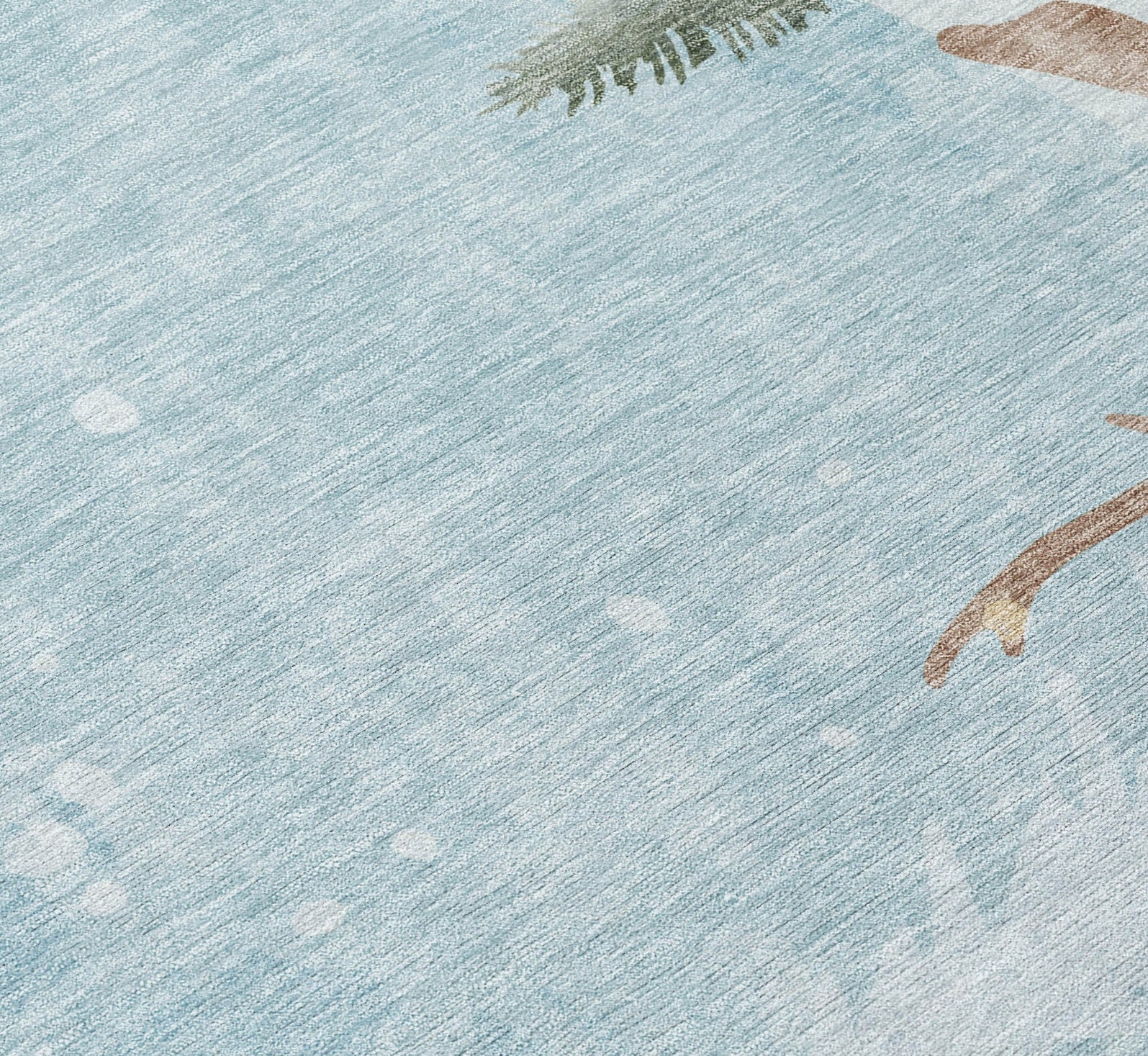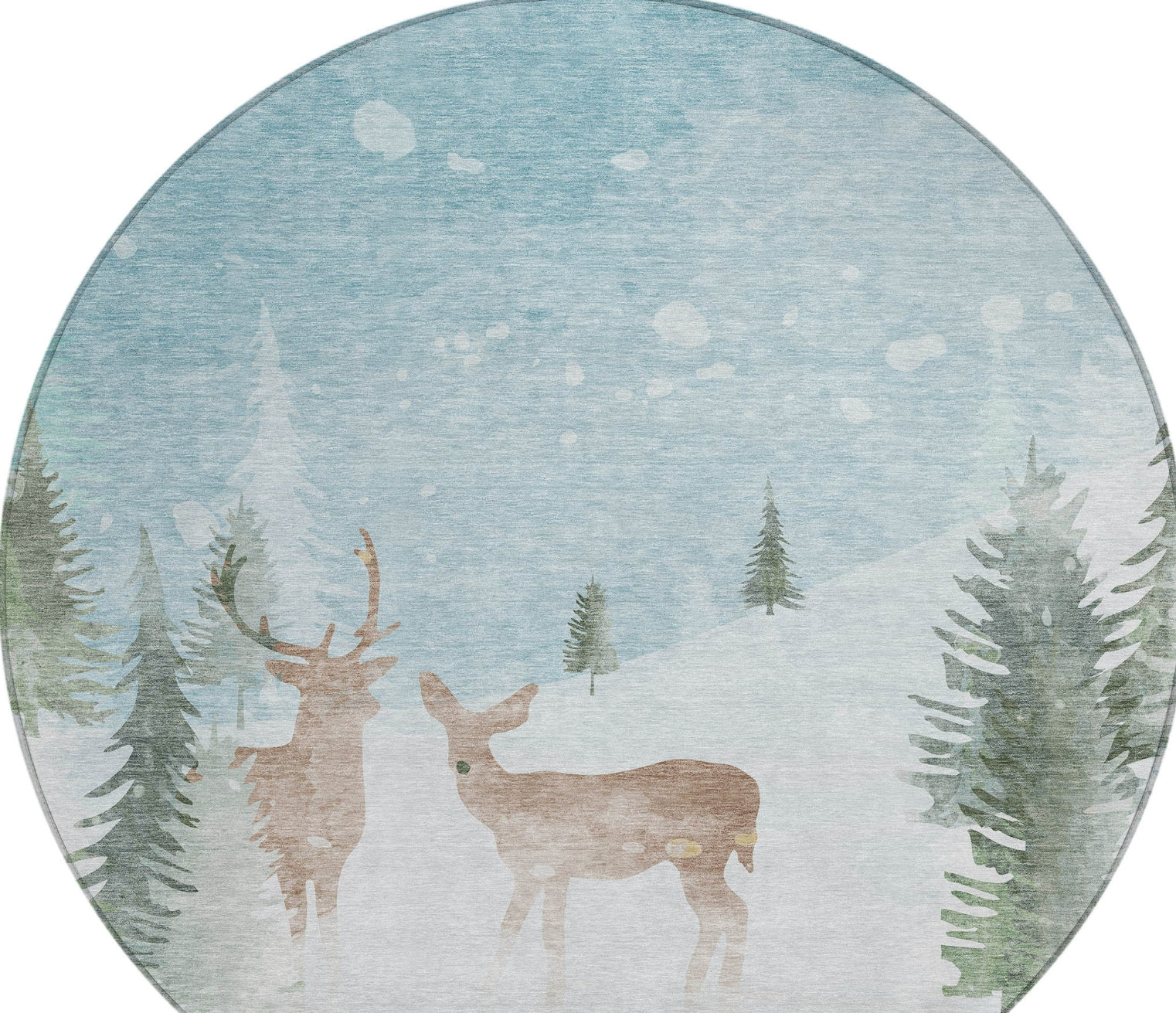 The image of two deer on a snow-covered hill, framed by trees and clouds, creates a serene holiday landscape on this rug. The festive design adds a warm, cozy feel to any room, and the transitional style ensures it fits seamlessly into both contemporary and traditional homes. This UV-stabilized rug is designed for both indoor and outdoor use, with an ultra-thin construction that makes it easy to manage and maintain. Machine-washable for convenience, it's also family and pet-friendly, ensuring it holds up to daily traffic and activity. Bring effortless style and durability to your space with this versatile rug.