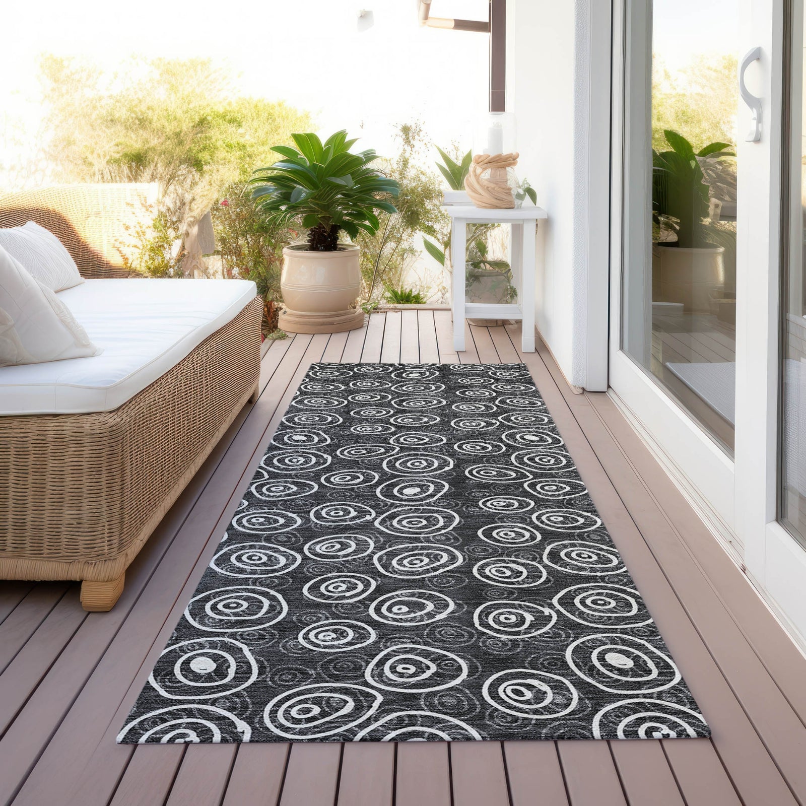 Our area rug showcases a geometric design of layered circles, offering a blend of transitional style and modern charm. Crafted for contemporary living, it's UV stabilized for any environment, ultra-thin for smooth integration, machine-washable for easy maintenance, and family- and pet-friendly.