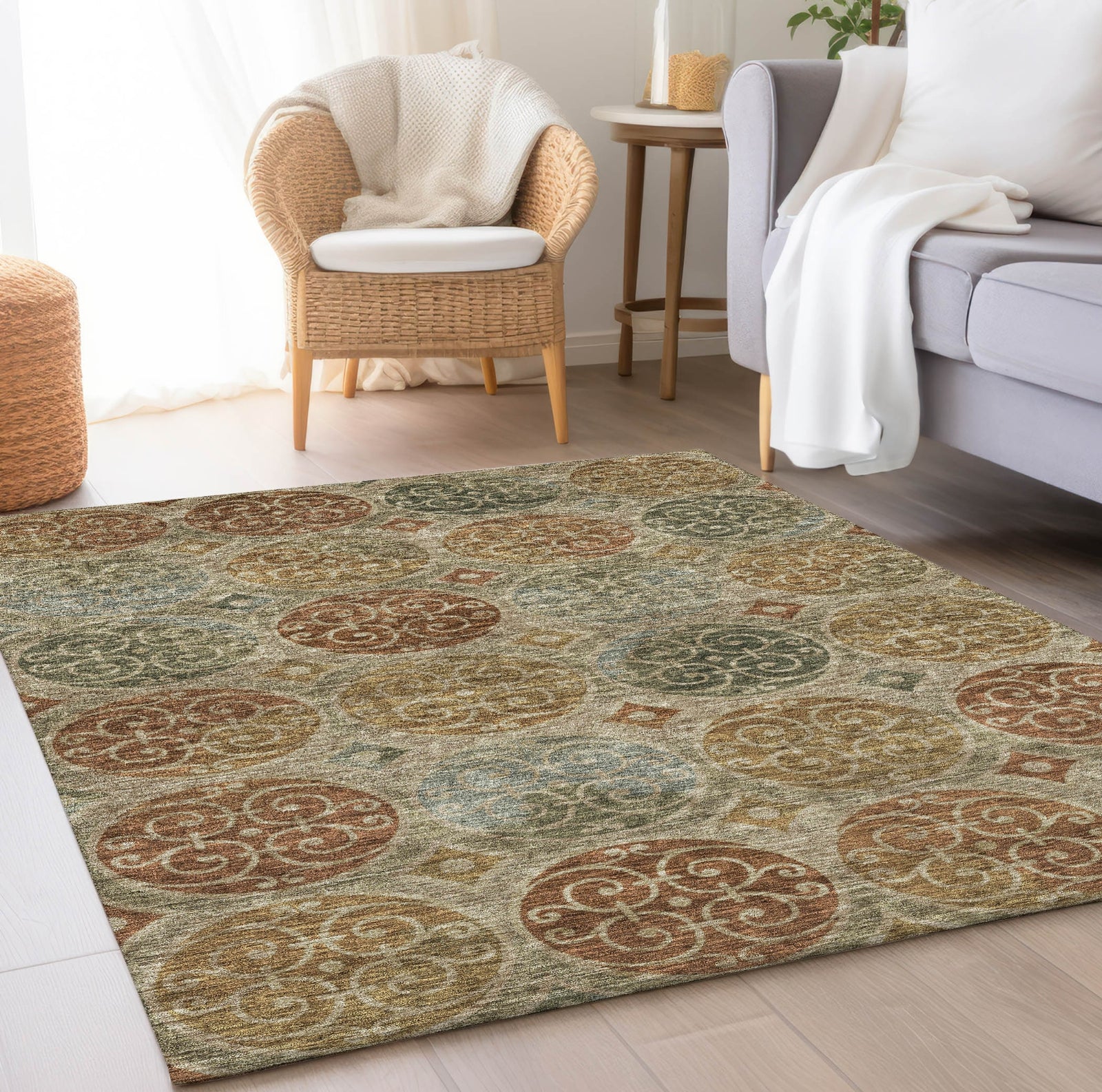 Indulge in the grandeur of our rug, featuring ornate circles that mirror the complexity of wrought iron designs. This transitional piece with its circular patterns is a testament to sophisticated decor, offering a unique and upscale touch to your home. It's UV stabilized for diverse environments, ultra-thin for modern aesthetics, machine-washable for your convenience, and family and pet-friendly, making it a must-have for any stylish abode.