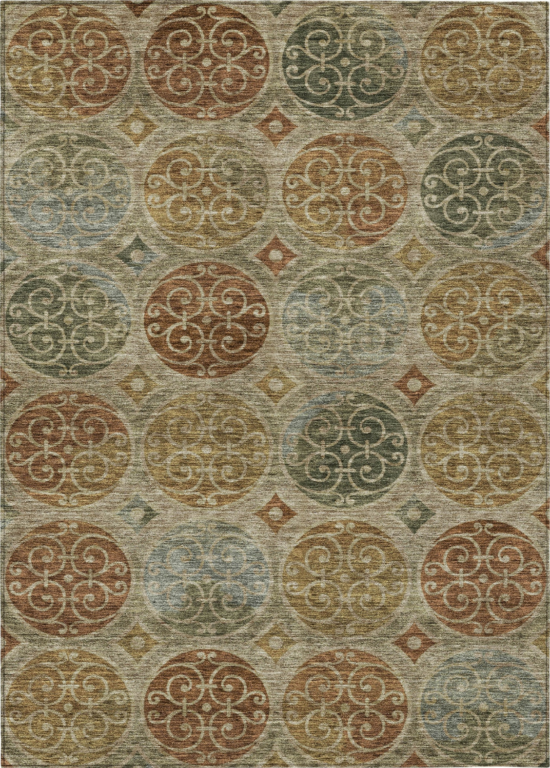 - Colors include: taupe, green, paprika, gold, copper,