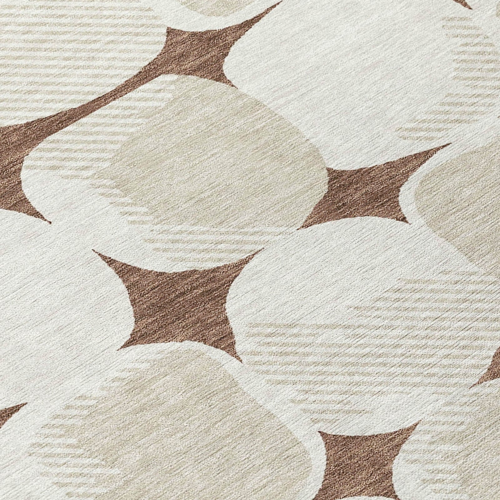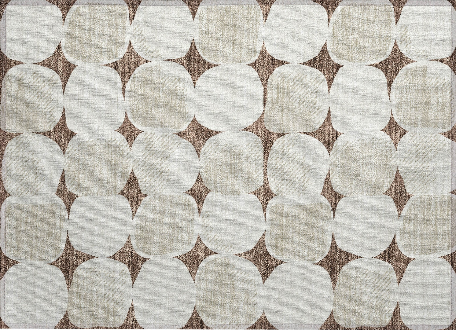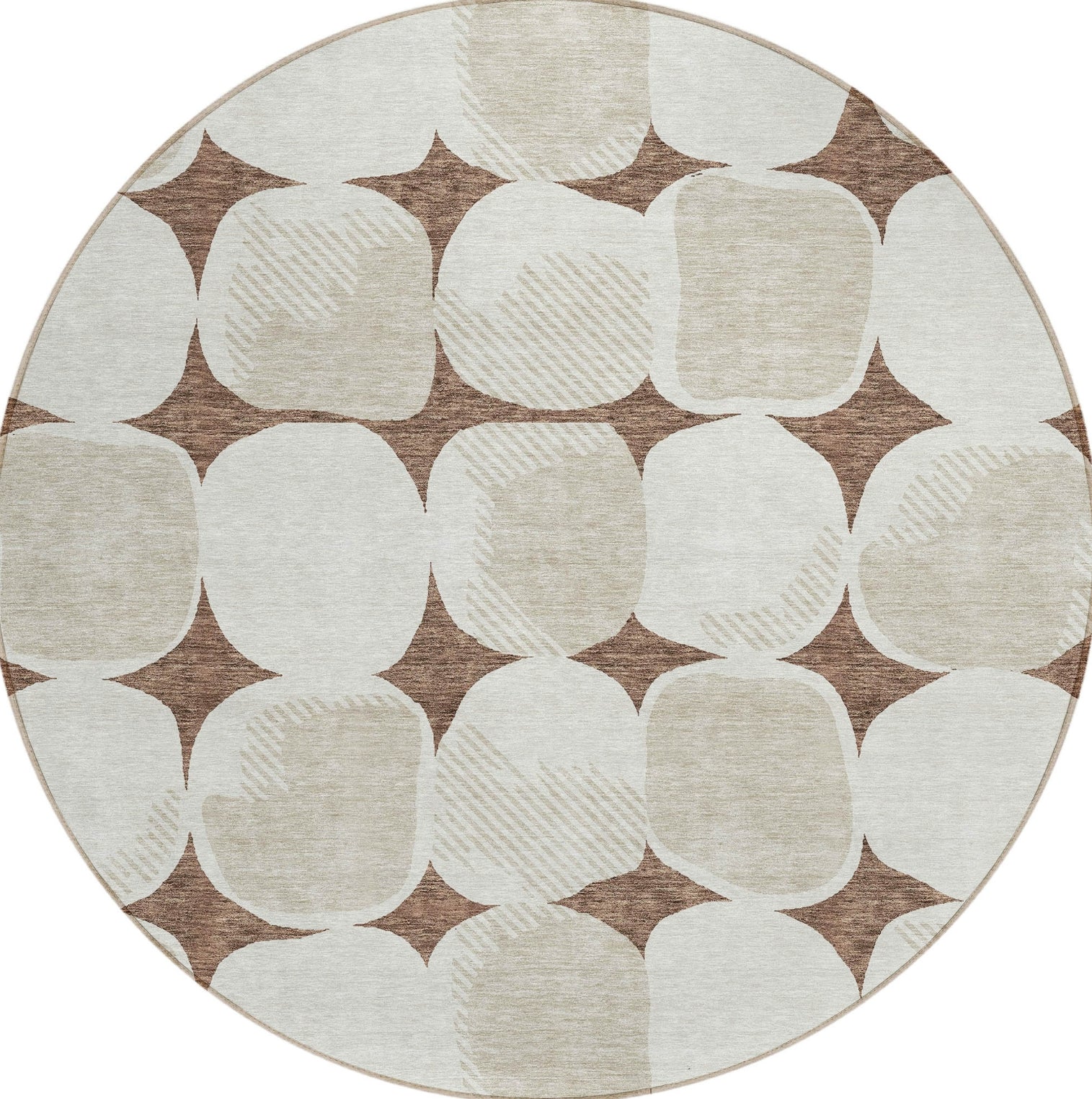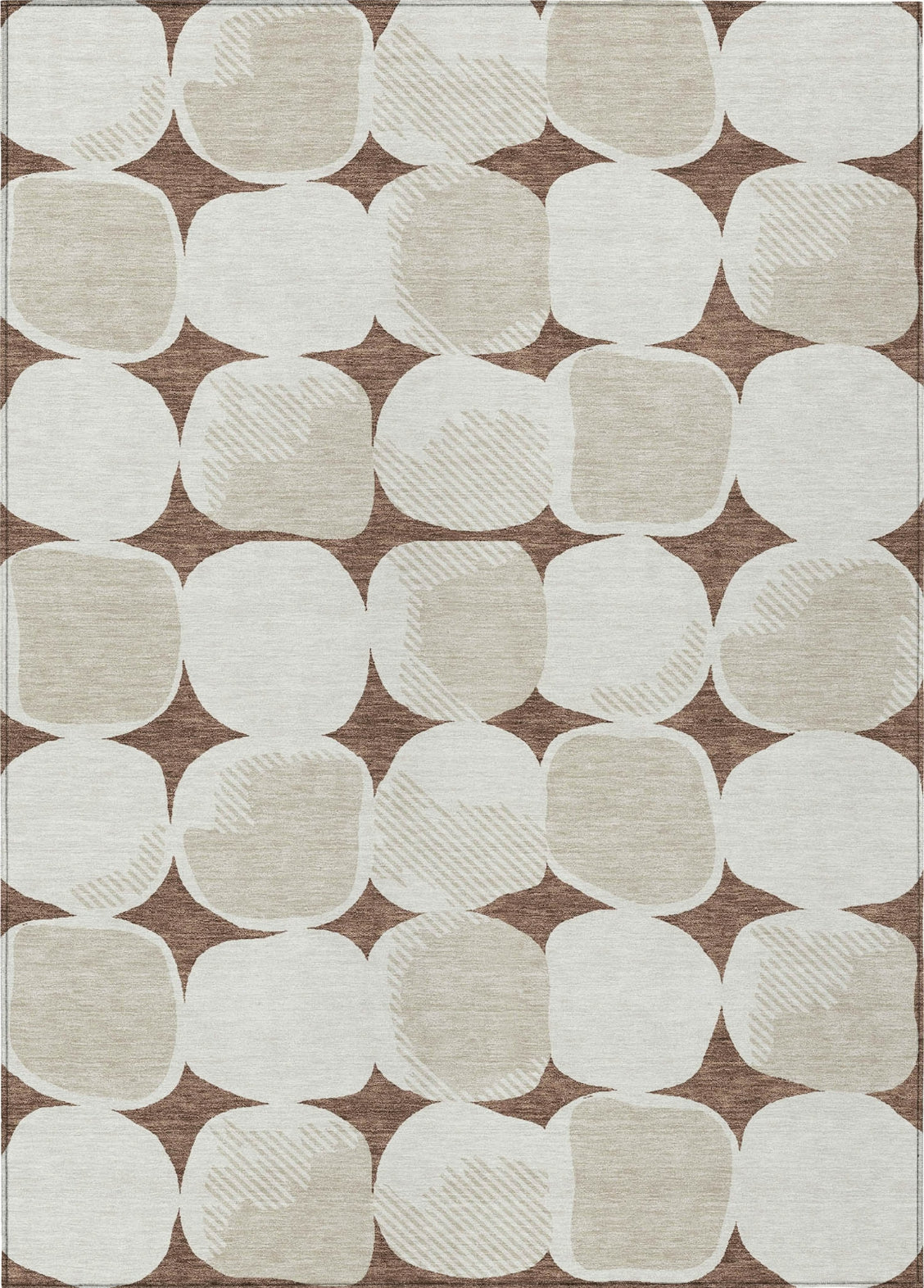 Create a calming oasis in your home with this area rug, adorned with large stone-shaped circles in a uniform pattern, embodying a transitional style that's both elegant and understated. The circles add a refined and peaceful touch to your decor. Beyond its visual appeal, this rug is UV stabilized for versatile placement, ultra-thin for seamless fitting, machine-washable for effortless maintenance, and family and pet-friendly, making it an excellent choice for contemporary living.