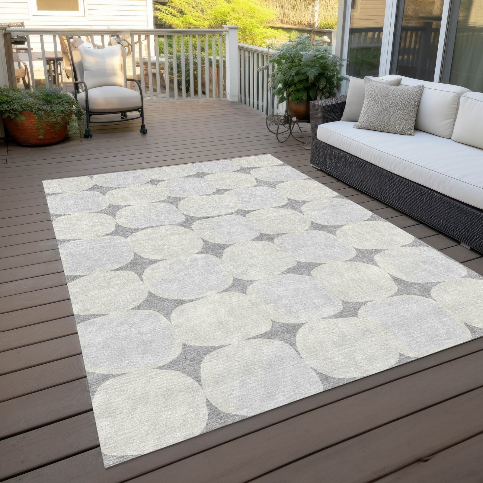 Create a calming oasis in your home with this area rug, adorned with large stone-shaped circles in a uniform pattern, embodying a transitional style that's both elegant and understated. The circles add a refined and peaceful touch to your decor. Beyond its visual appeal, this rug is UV stabilized for versatile placement, ultra-thin for seamless fitting, machine-washable for effortless maintenance, and family and pet-friendly, making it an excellent choice for contemporary living.