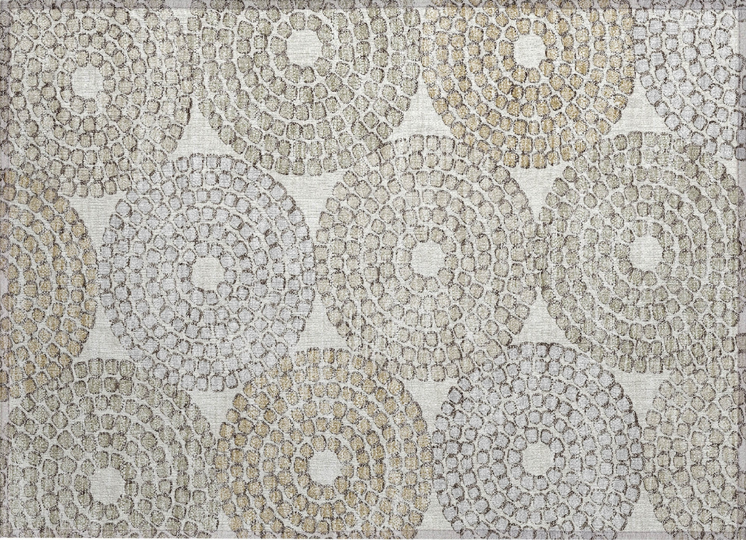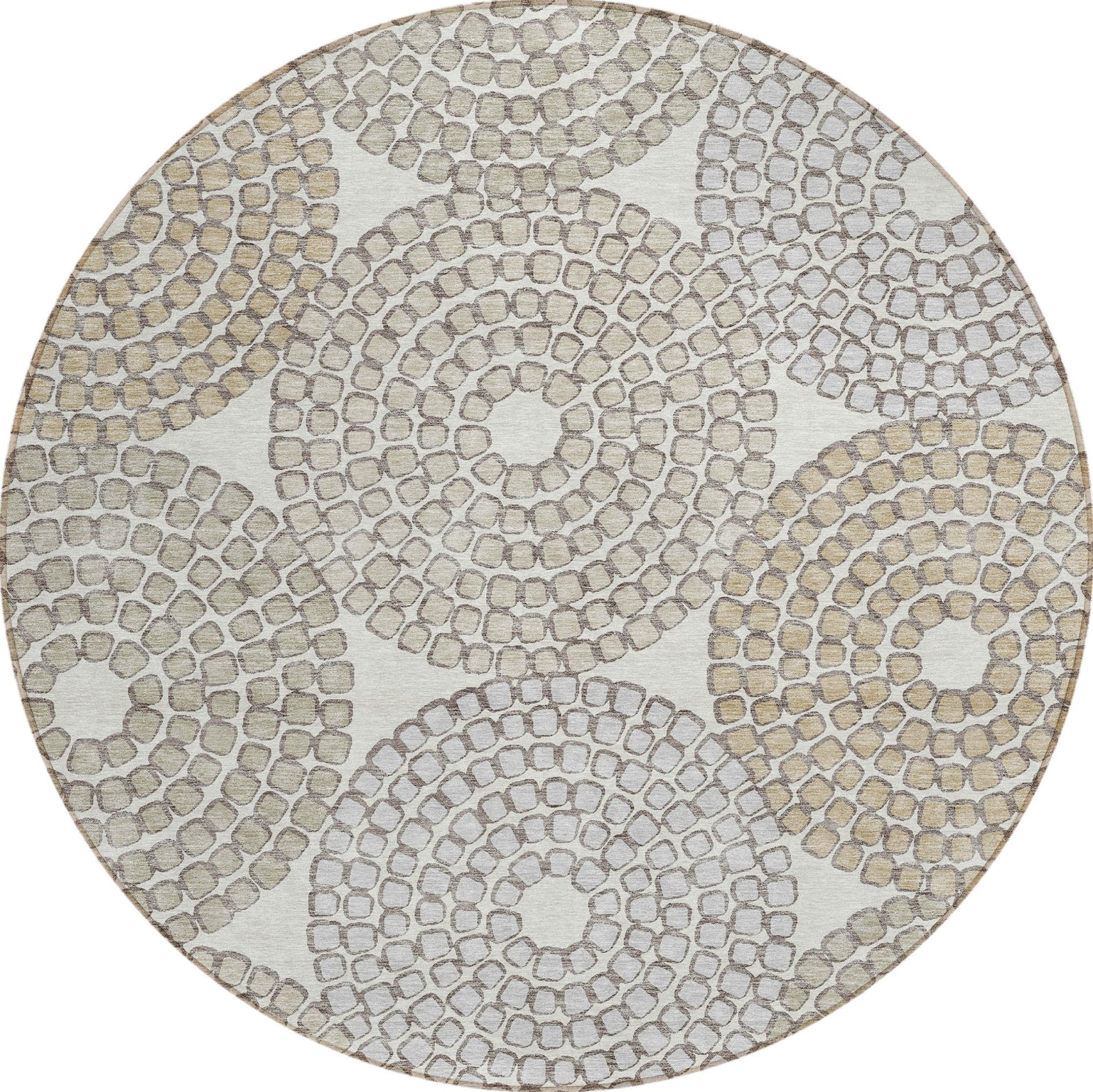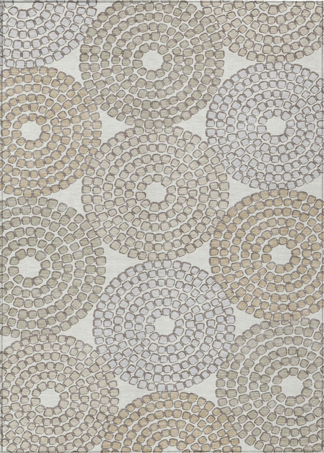 Embrace a blend of art and functionality with our area rug, showcasing mosaic tile circles in a transitional style. This rug is UV stabilized for both indoor and outdoor use, ultra-thin for easy placement, and machine-washable, making it an ideal addition to homes with kids and pets.