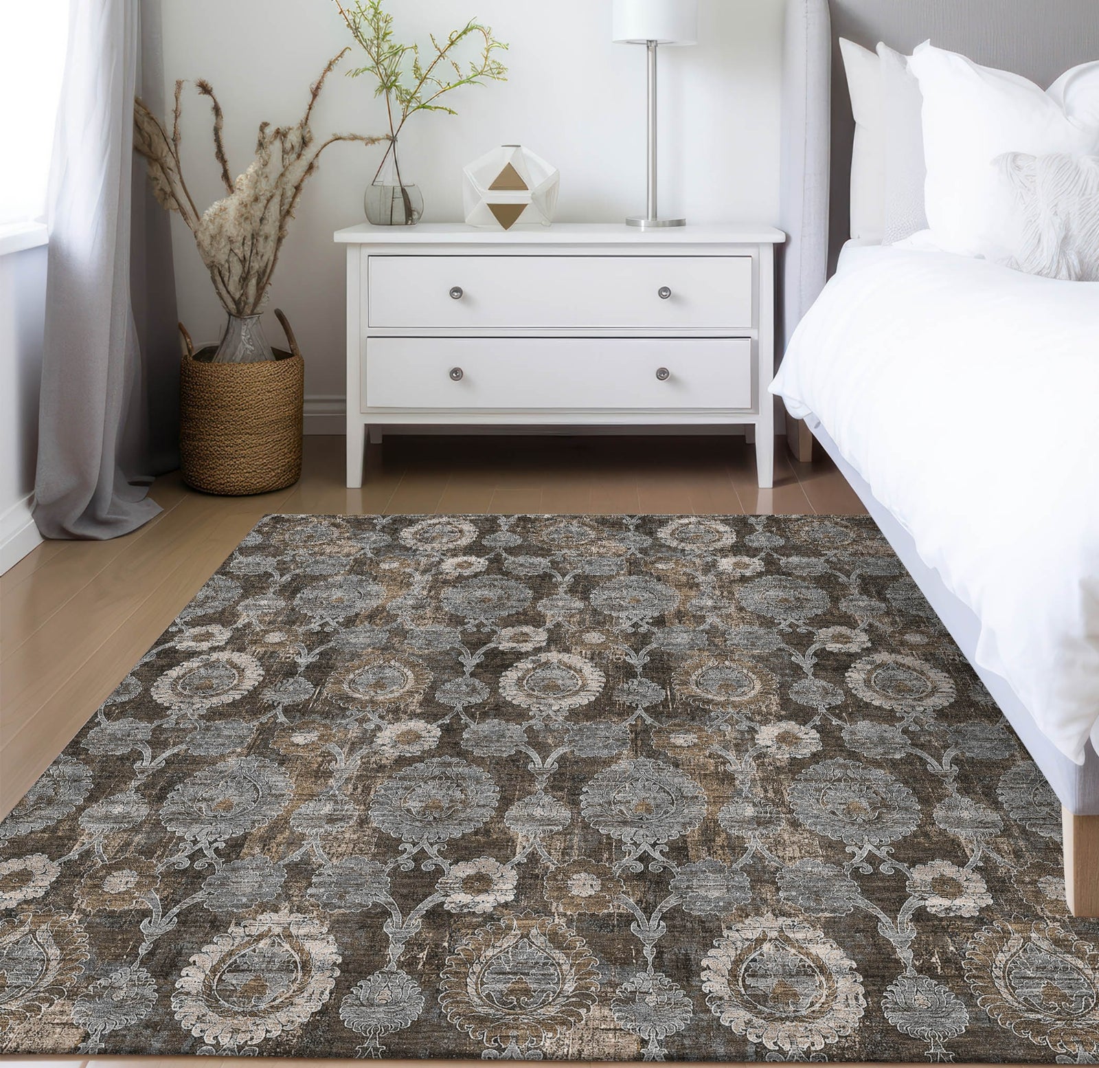 Revitalize your home with our area rug, featuring a small damask motif pattern that perfectly balances urban chic with transitional damask styles. The rug's engaging patterns bring a sense of excitement and modernity to your decor. It is UV stabilized for versatile indoor or outdoor use, ultra-thin for easy positioning, machine-washable for hassle-free care, and ideal for family and pet-friendly living spaces.