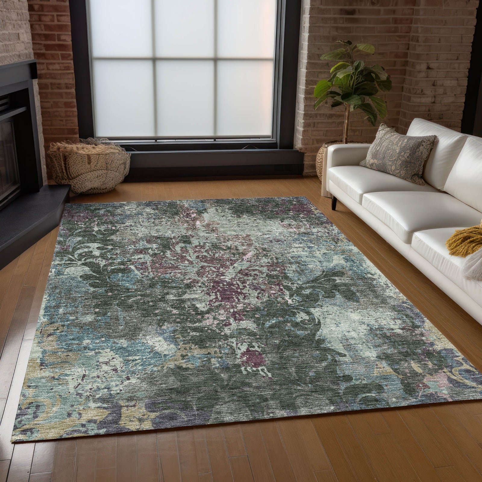 Redefine your decor with our area rug, where a large damask pattern combined with a textured overlay creates a transitional masterpiece. It's UV stabilized for diverse environments, both indoors and outdoors, and its ultra-thin build makes it a versatile home addition. Machine-washable, it's an excellent option for active family homes with pets and children.