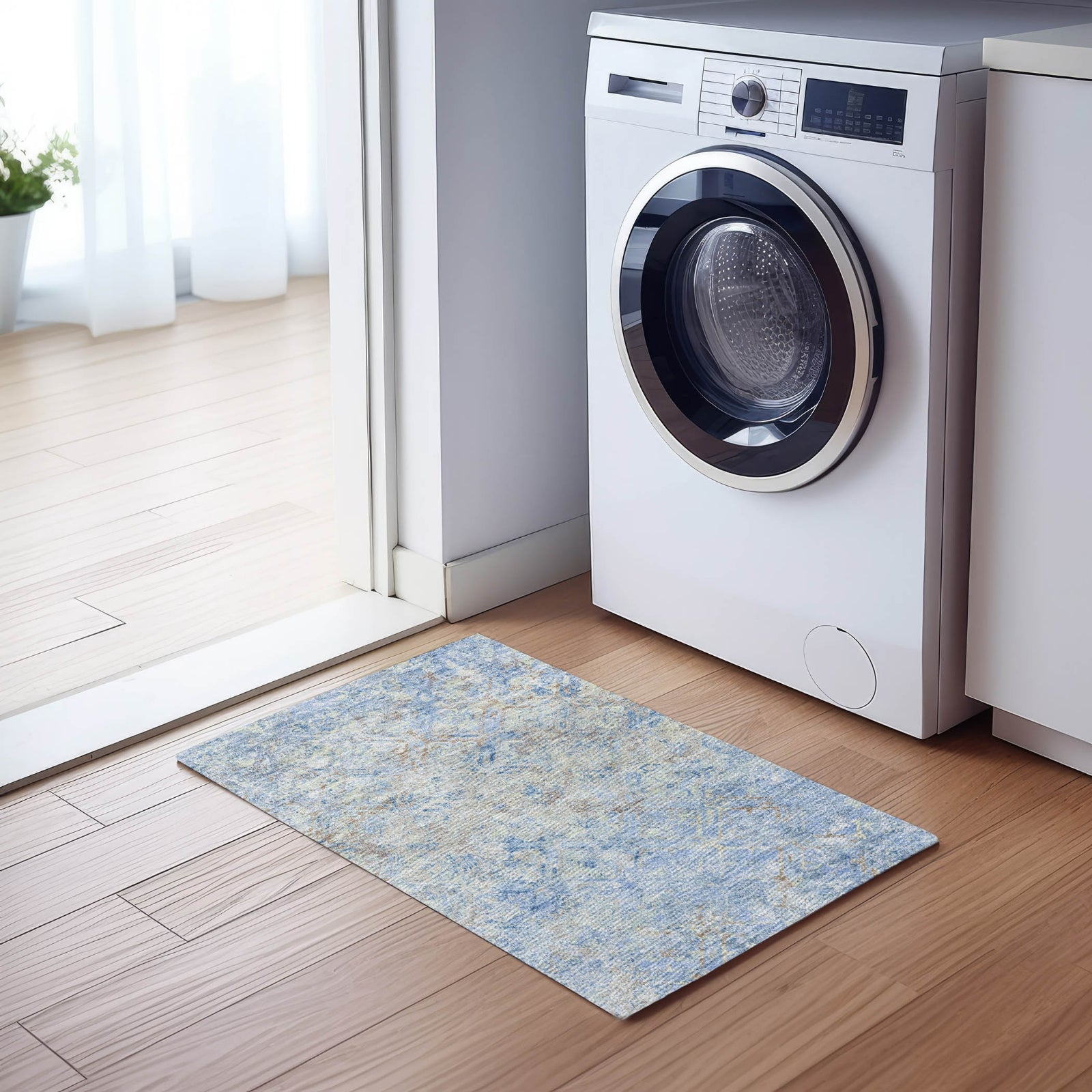 - Machine Washable. Larger rug sizes may not fit into a residential washing machine. They may be washed in a commercial size washing machine or hosed-off outside with mild soap and water. Air-dry, do not machine dry.