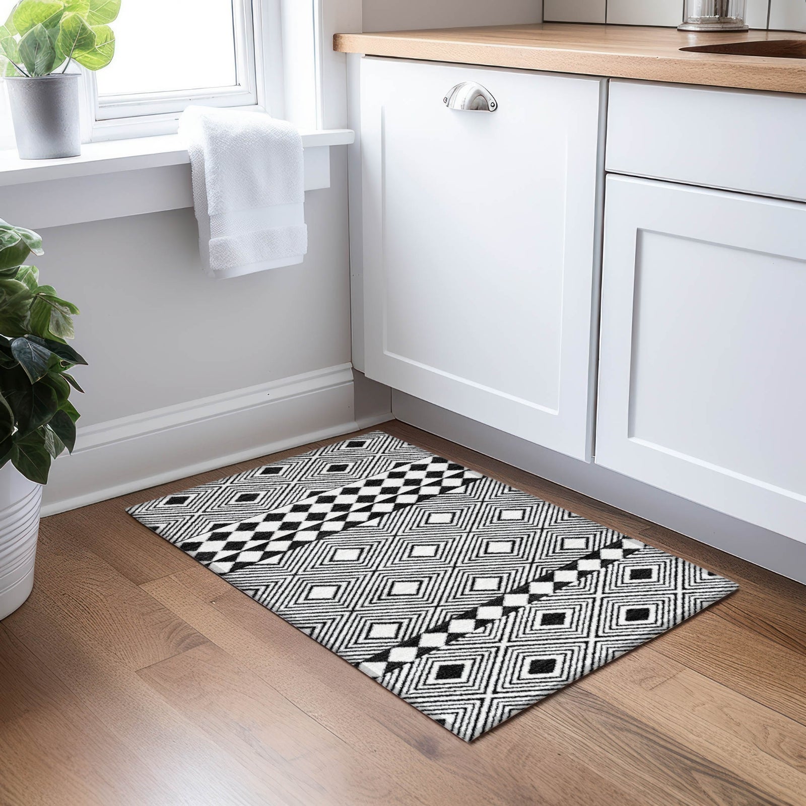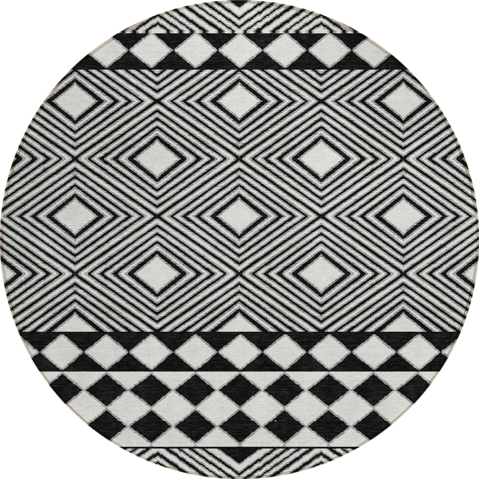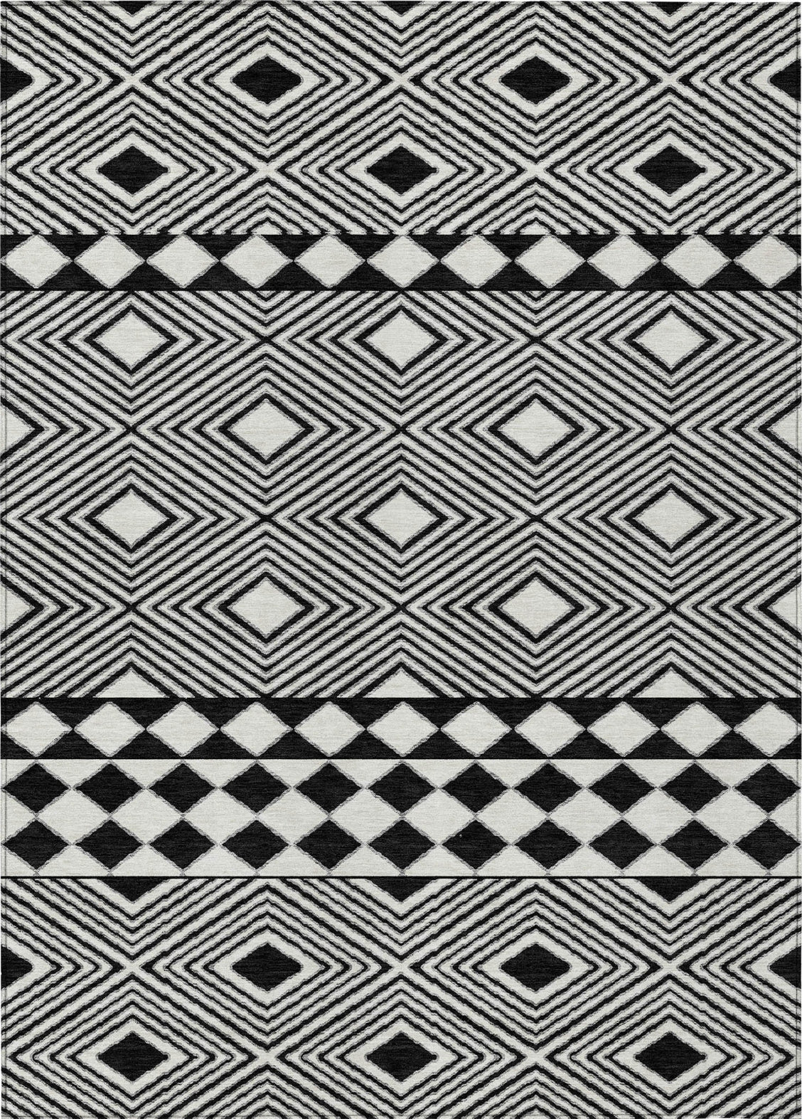 Reimagine your home with our area rug, featuring horizontal diamonds that strike the perfect balance between modern flair and transitional elegance. The diamond motif is an eye-catching addition to any room. This rug is UV stabilized, making it suitable for both indoor and outdoor settings. Its ultra-thin design and machine-washable feature make it a practical choice for any household, especially those with pets and children.