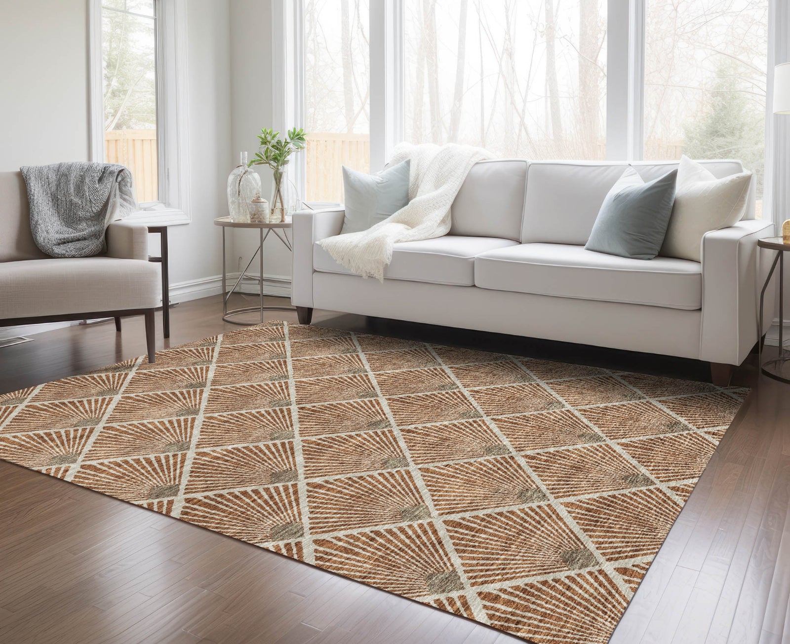 This area rug's design of small scaled diamonds anchored by a small square creates a transitional and diamond-inspired charm. UV stabilized for both indoor and outdoor use, it's incredibly versatile. The ultra-thin construction ensures it fits easily into any room, and being machine-washable, it's perfect for family and pet-friendly homes.