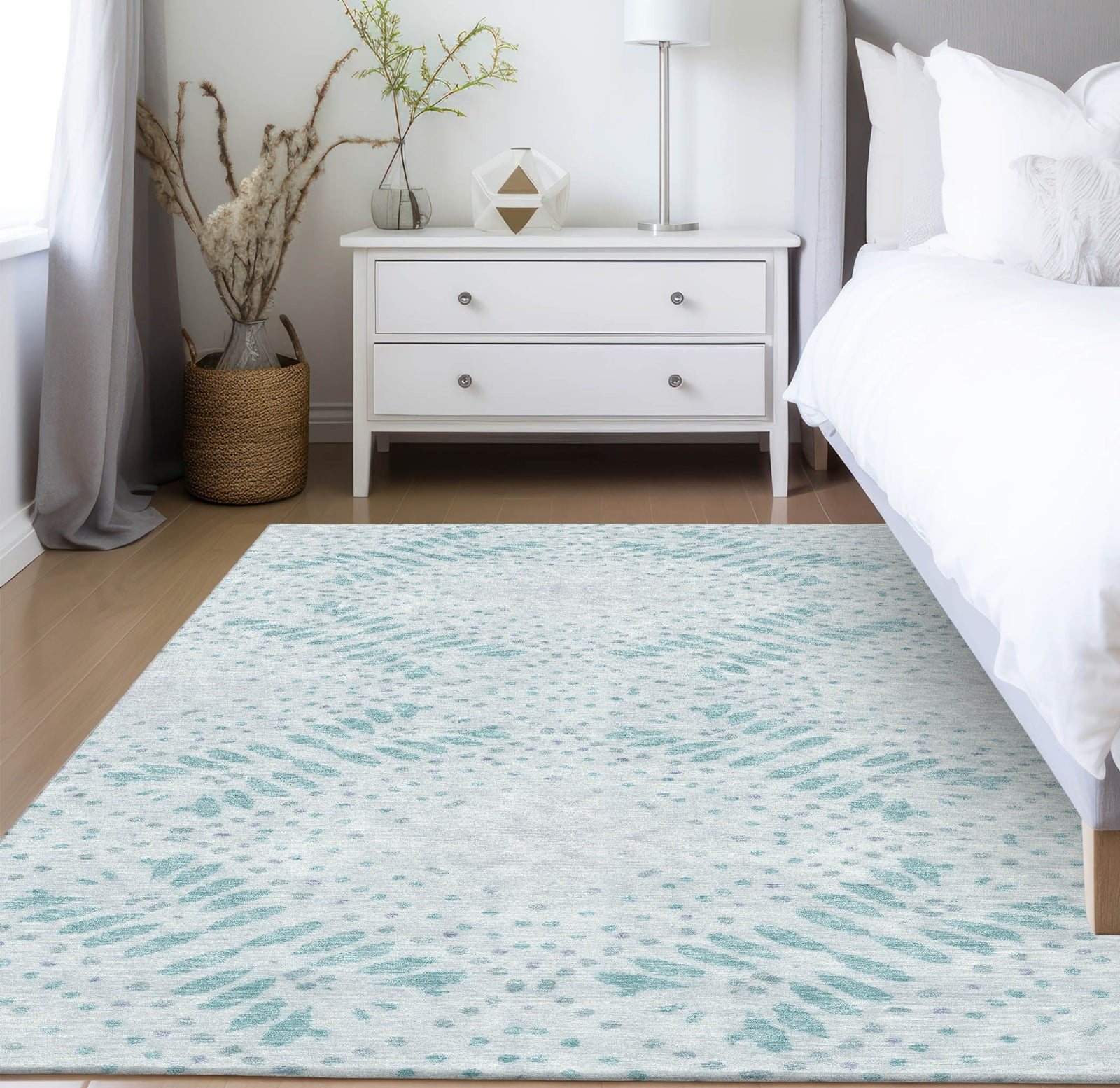 This rug, with its small patterned leaves arranged to create a diamond effect, brings a transitional and floral charm to any space. The leaf design within the diamonds offers a unique blend of nature and geometry, perfect for modern and traditional interiors. It's UV stabilized for indoor and outdoor versatility, ultra-thin for a sleek appearance, machine-washable for convenience, and ideal for family and pet-friendly homes.
