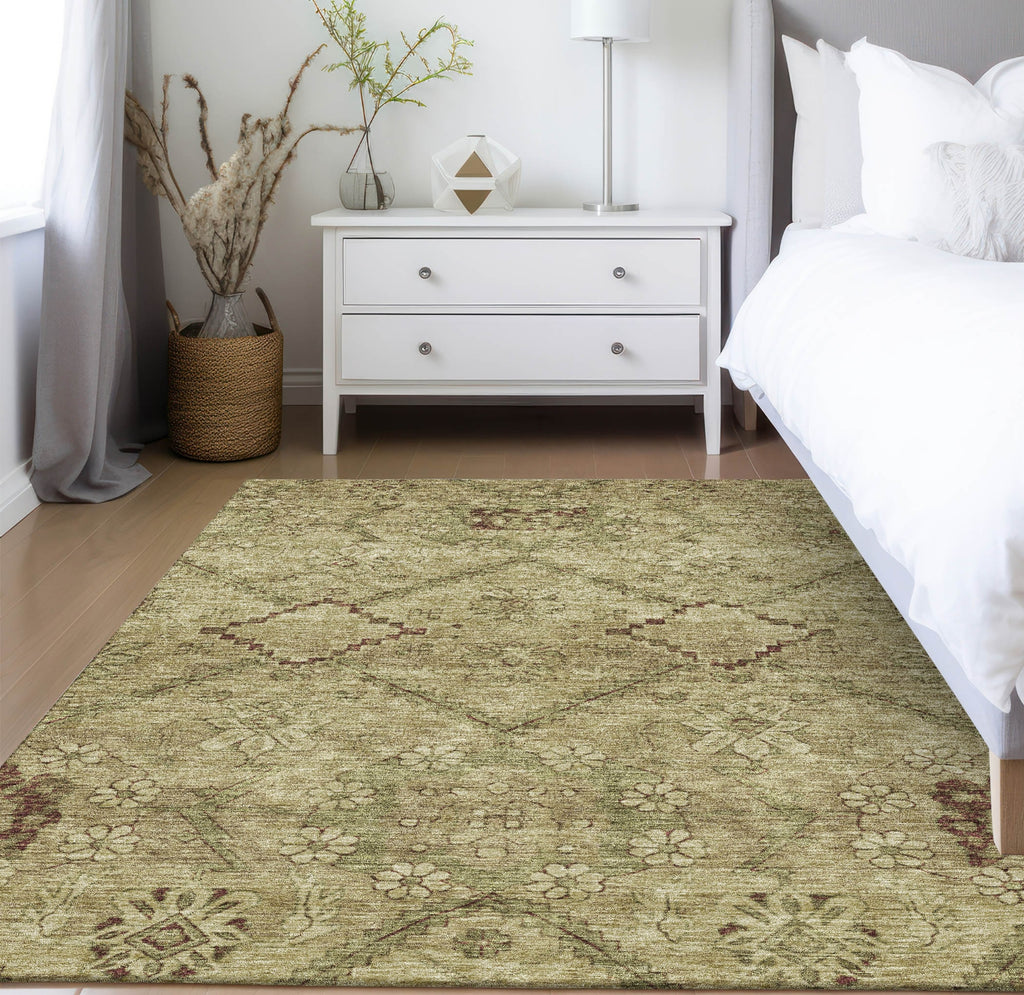 Enhance your living quarters with our area rug, where a floral type pattern intertwines with large zig-zag diamonds, crafting a distinct transitional floral style. This rug brings unique elegance to your environment. It's UV stabilized for versatile usage, ultra-thin for easy placement, and machine-washable, making it a practical yet stylish addition to homes with pets and children.