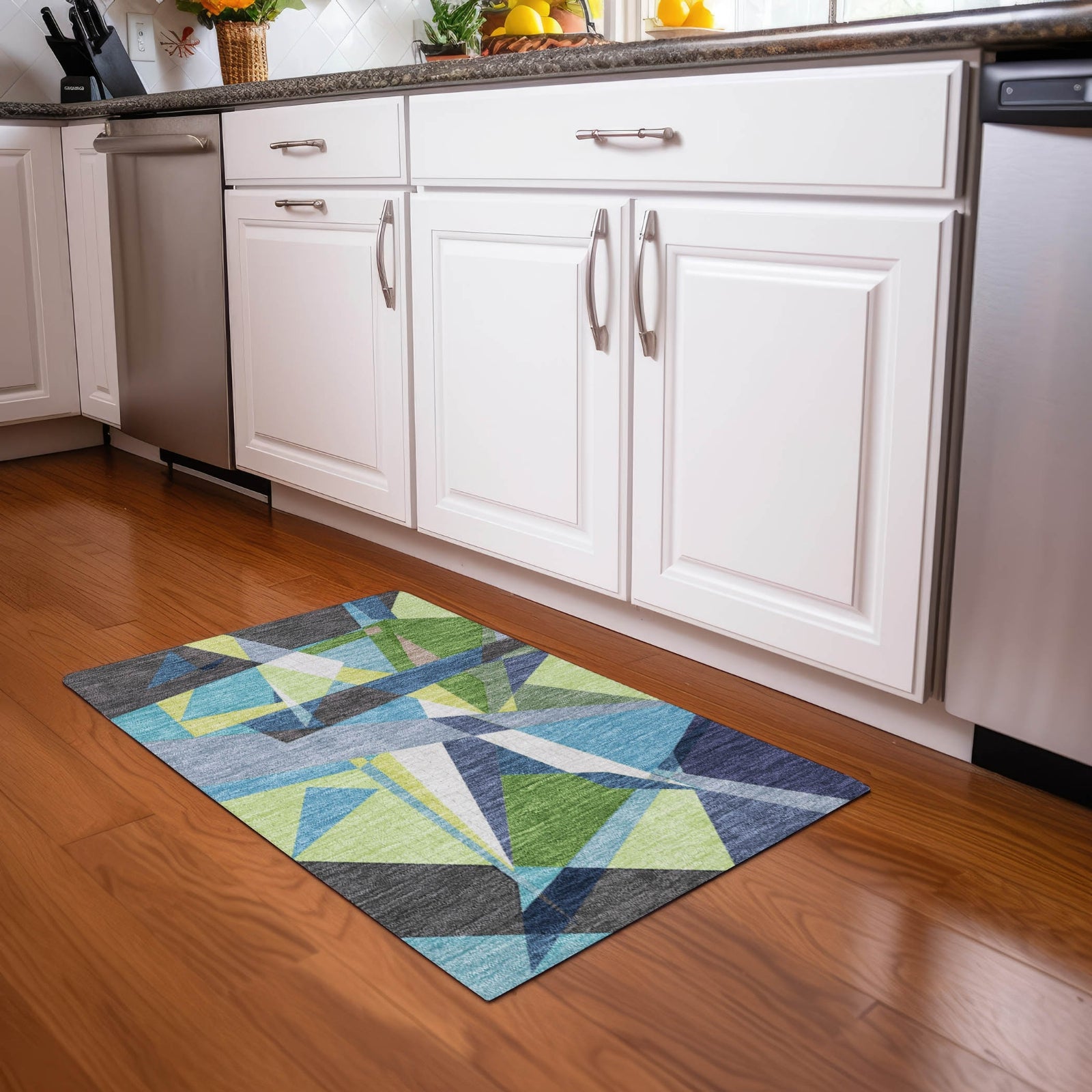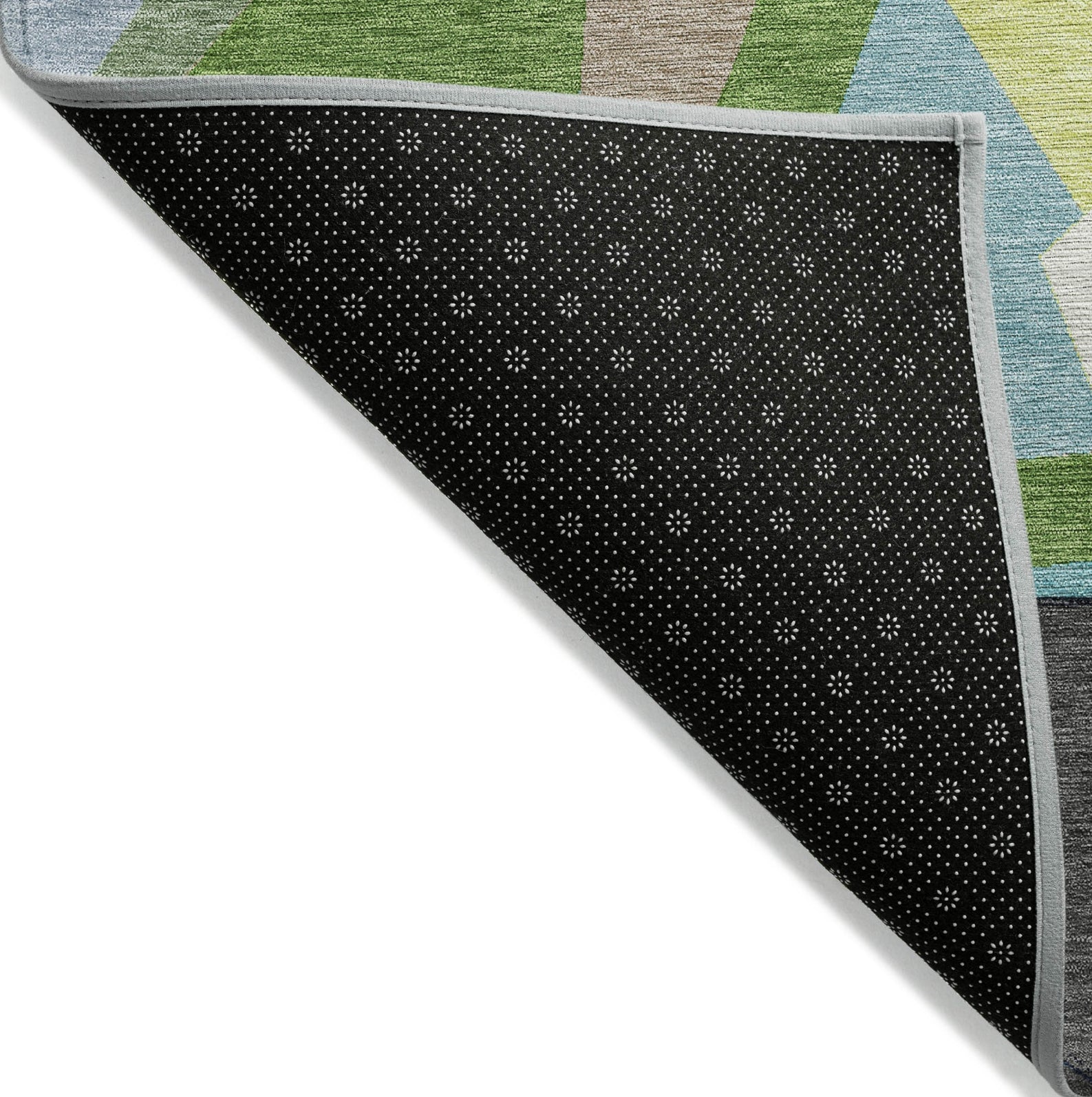 Introduce a touch of elegance to your home with the triangles and random geometric shapes all bonded together in this transitional rug. The geometric pattern enhances any space with its dynamic appeal. UV stabilized for versatile use, it has an ultra-thin construction. This machine-washable rug is family and pet-friendly, ensuring easy care and durability.
